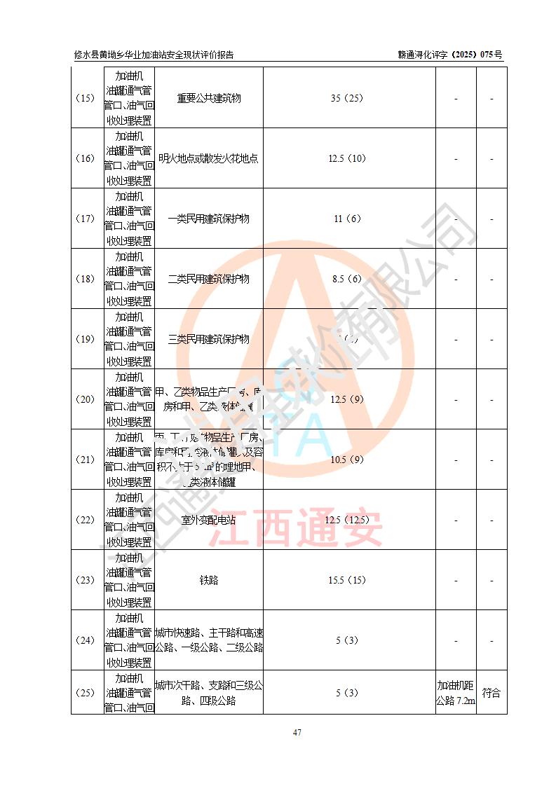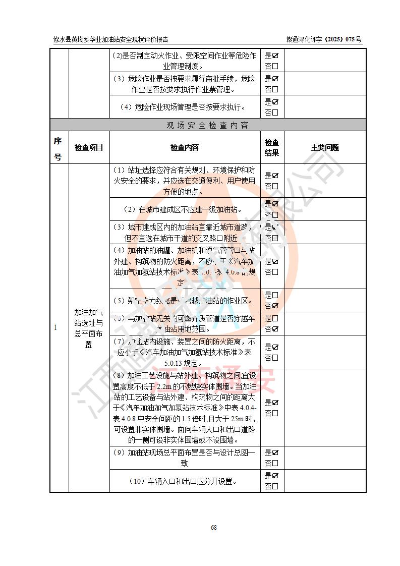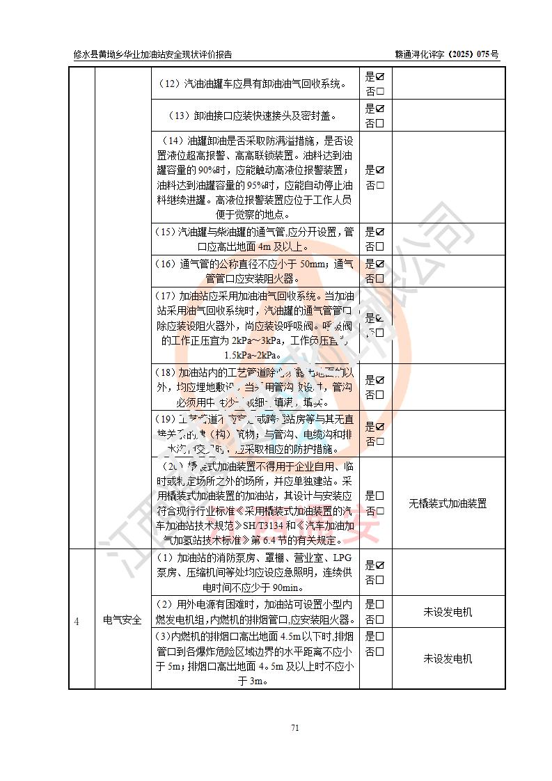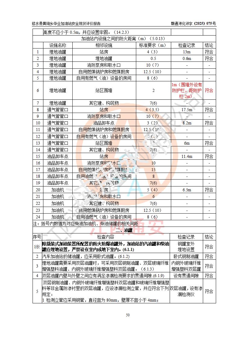 评价结论 | 修水县黄坳乡华业加油站涉及的安全条件、安全经营条件、安全生产管理符合《危险化学品经营许可证管理办法》、《汽车加油加气加氢站技术标准》等**有关法规、标准、规范要求,能满足危险化学品经营安全条件。 | |||
