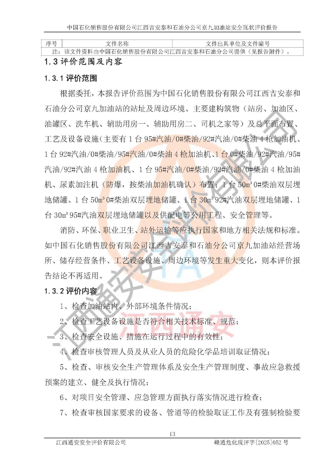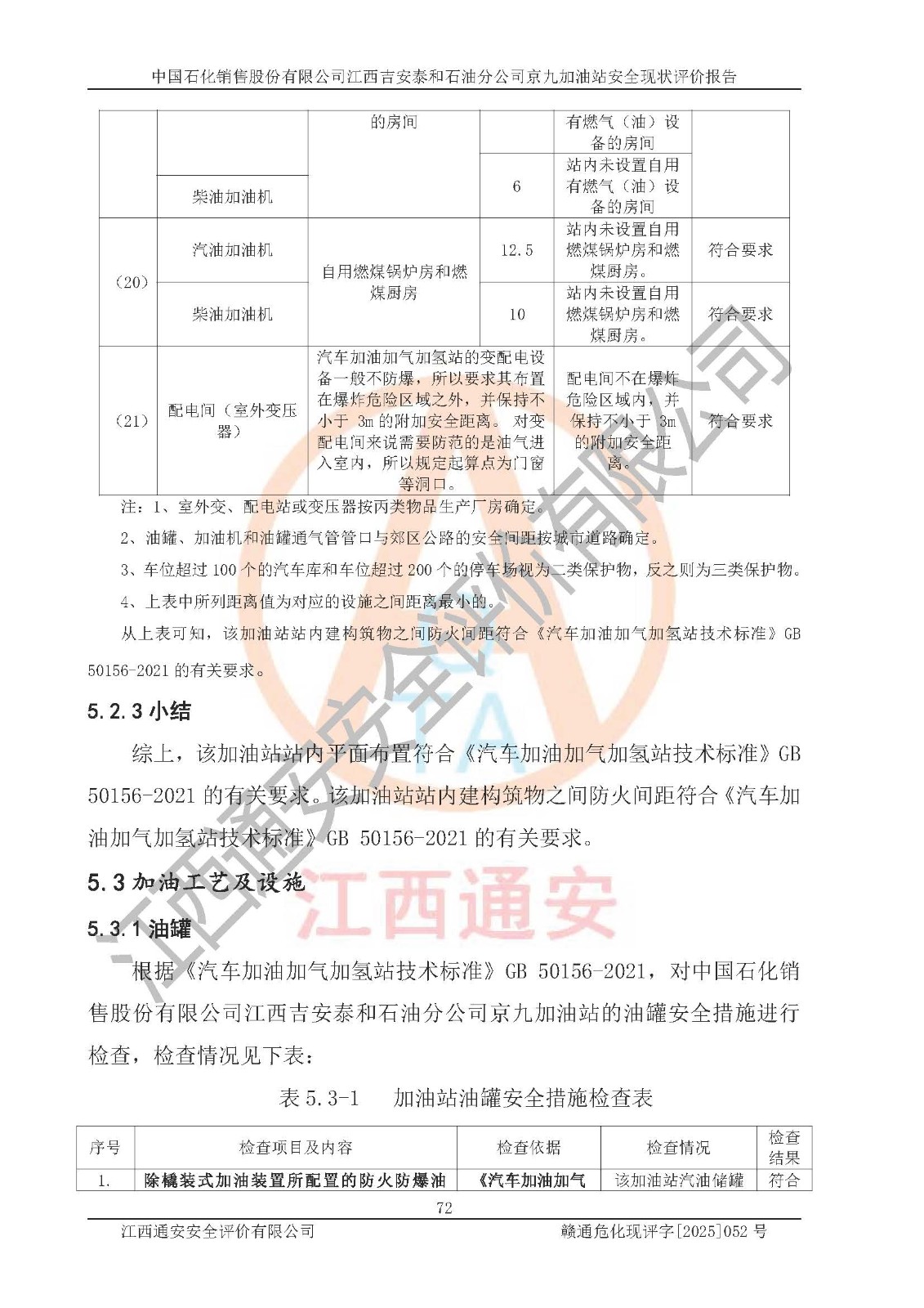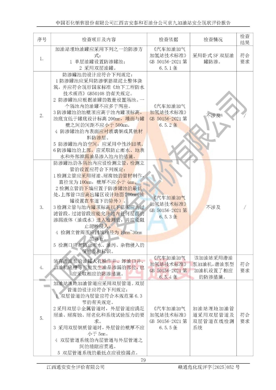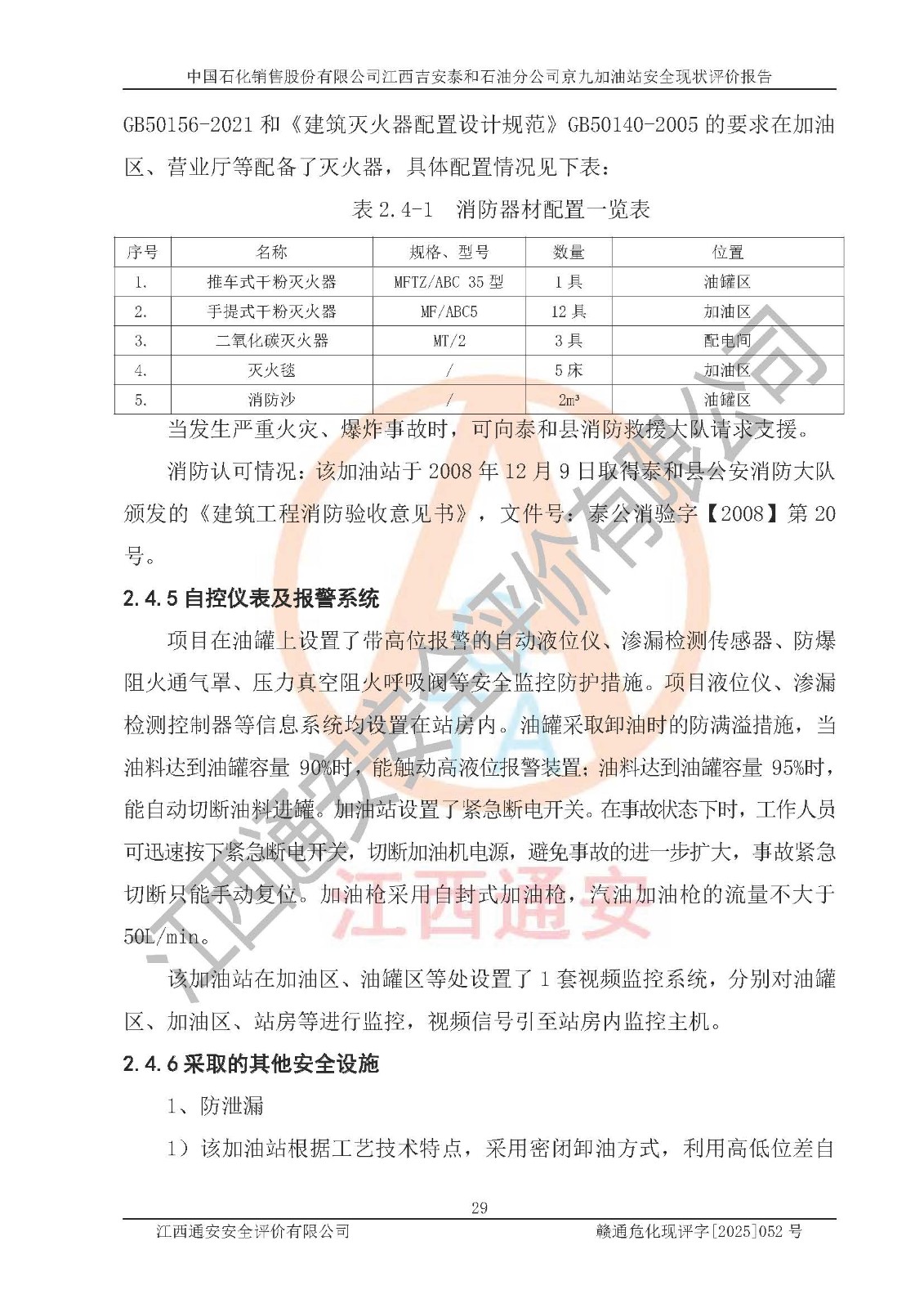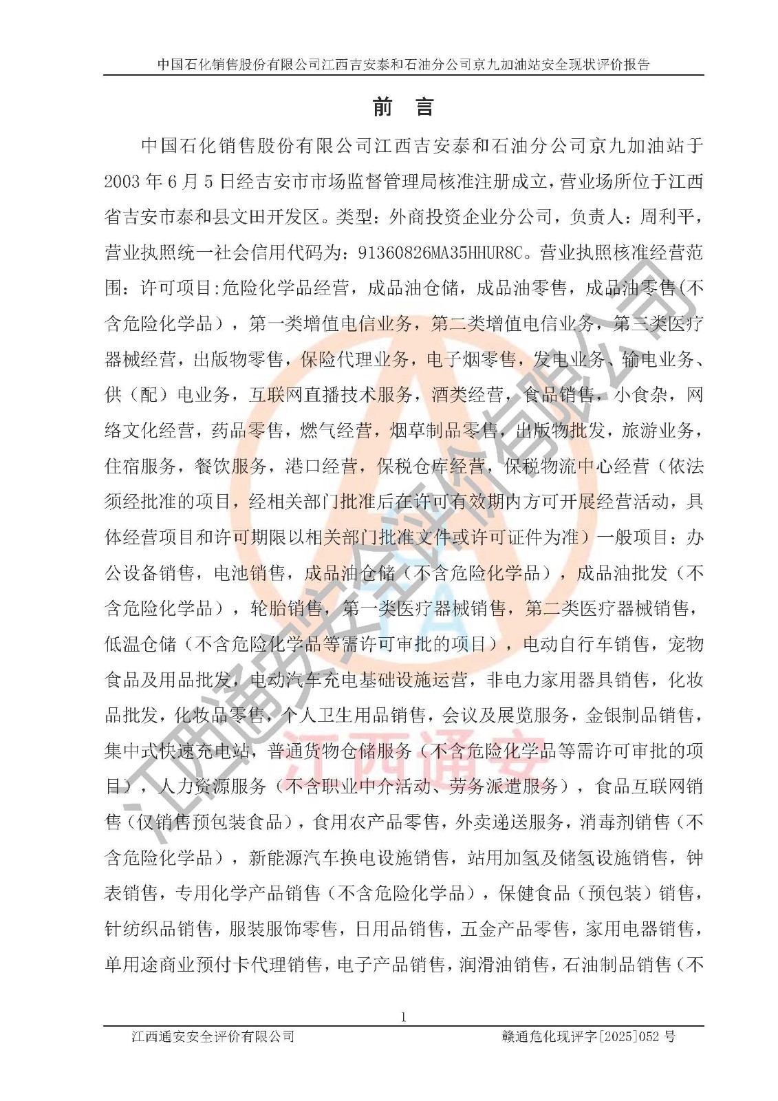 项目名称 | 中国石化销售股份有限公司江西吉安泰和石油分公司京九加油站 安全现状评价报告 | ||||