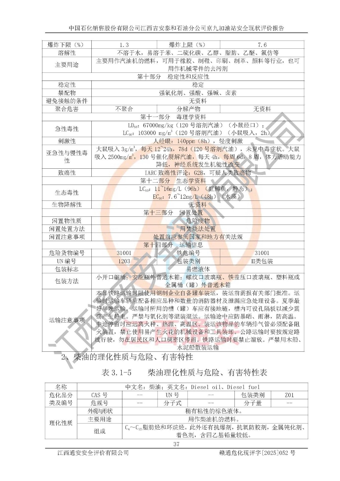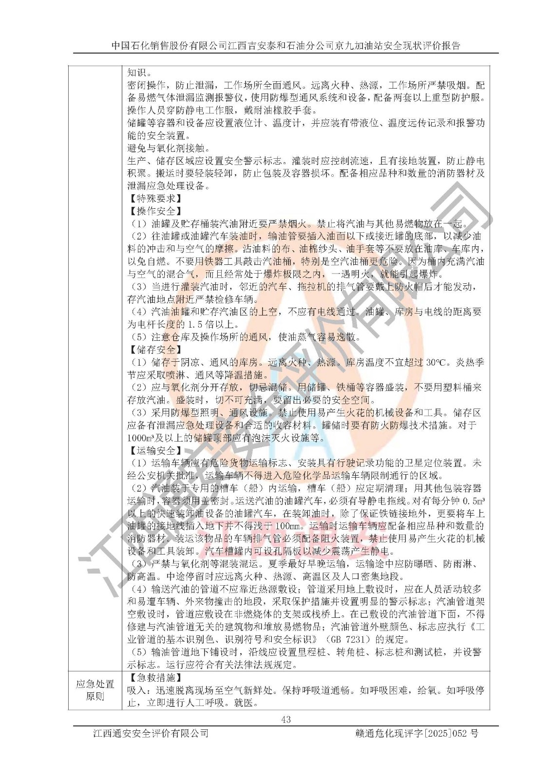 其它 | 在对该项目危险、有害因素辨识分析的基础上,运用安全检查表、预作业条件危险性分析法、危险度评价、重大事故后果分析结果等评价方法对该项目进行了分析评价,评价结果如下: 1、该项目位于江西省吉安市泰和县文田开发区,符合当地规划,与周边环境的距离符合有关标准、规范的要求。 2、总图布置分区明确,布局合理,各建构筑物的防火间距满足规范要求。 3、该项目无**明令淘汰的工艺,设备、设施与工艺条件、内部介质相适应,特种设备及设施较齐全,按规定设置防雷、防静电接地,爆炸危险环境加油机按要求采用防爆型,符合相关标准规范要求。 5、企业设置了安全生产管理机构,配备了专职安全生产管理人员,建立了安全生产责任制和安全生产管理制度,编制了岗位操作规程,编制了生产安全事故应急预案,人员经过相应的培训,企业的安全生产管理正常。 6、作业条件危险性评价结果:在选定的评价单元中,作业危险程度均为“一般危险,需要注意”,作业条件相对安全。 7、危险度评价结果:汽油储罐的危险程度为**危险。油罐采用双层罐埋地设置,按要求设置了通气管,并装设了阻火器;设置了液位监测报警系统和紧急切断系统,设置加油双层管道及双层管道渗漏检测系统,其安全风险可控。 评价结论: 中国石化销售股份有限公司江西吉安泰和石油分公司京九加油站工艺设备和安全设施运行正常,安全管理机制运行正常,安全设施、措施达到设计要求和预期结果,可以满足建设项目安全生产的要求,安全生产管理**,项目具备危险化学品经营单位安全经营条件的要求。 | ||||