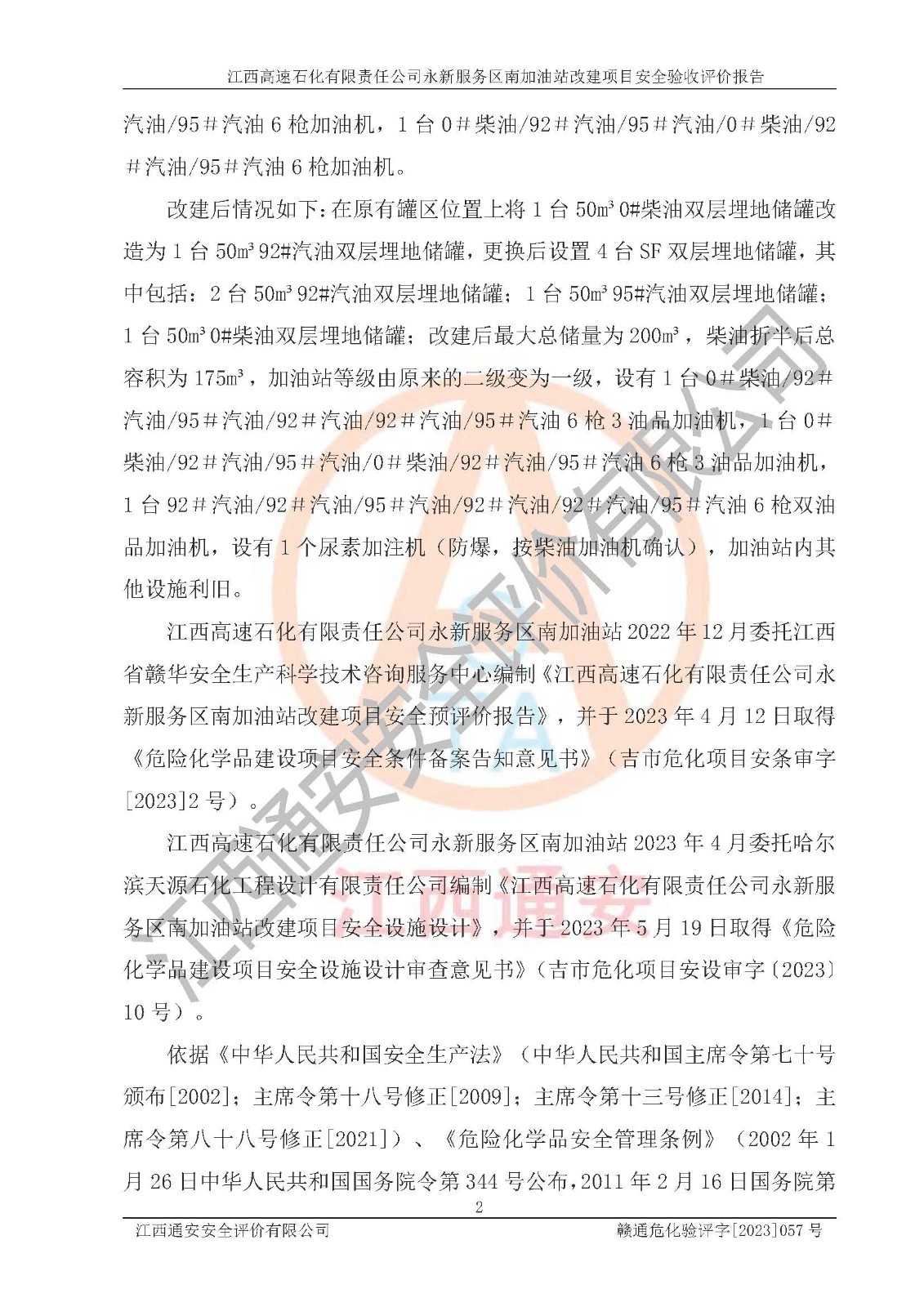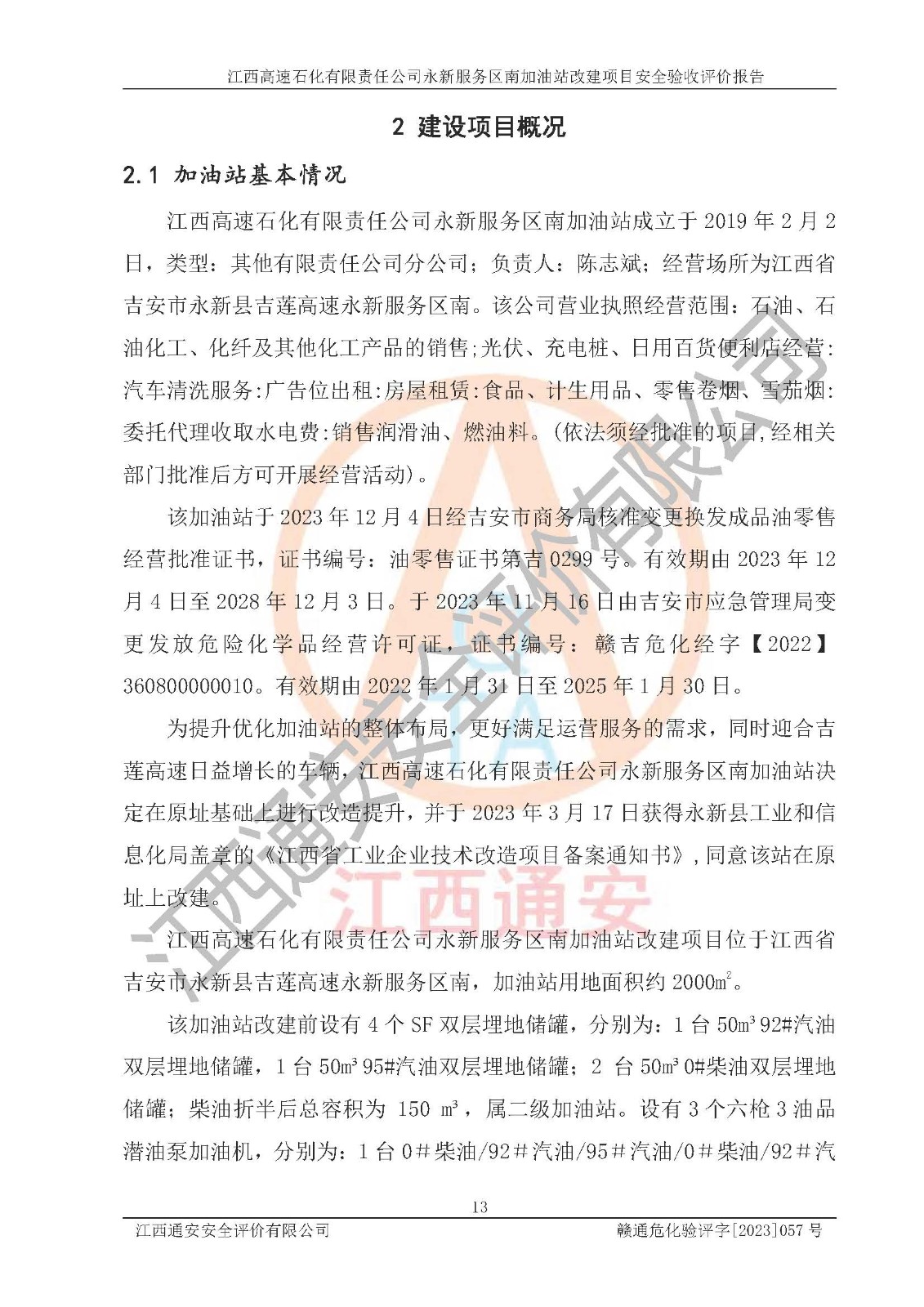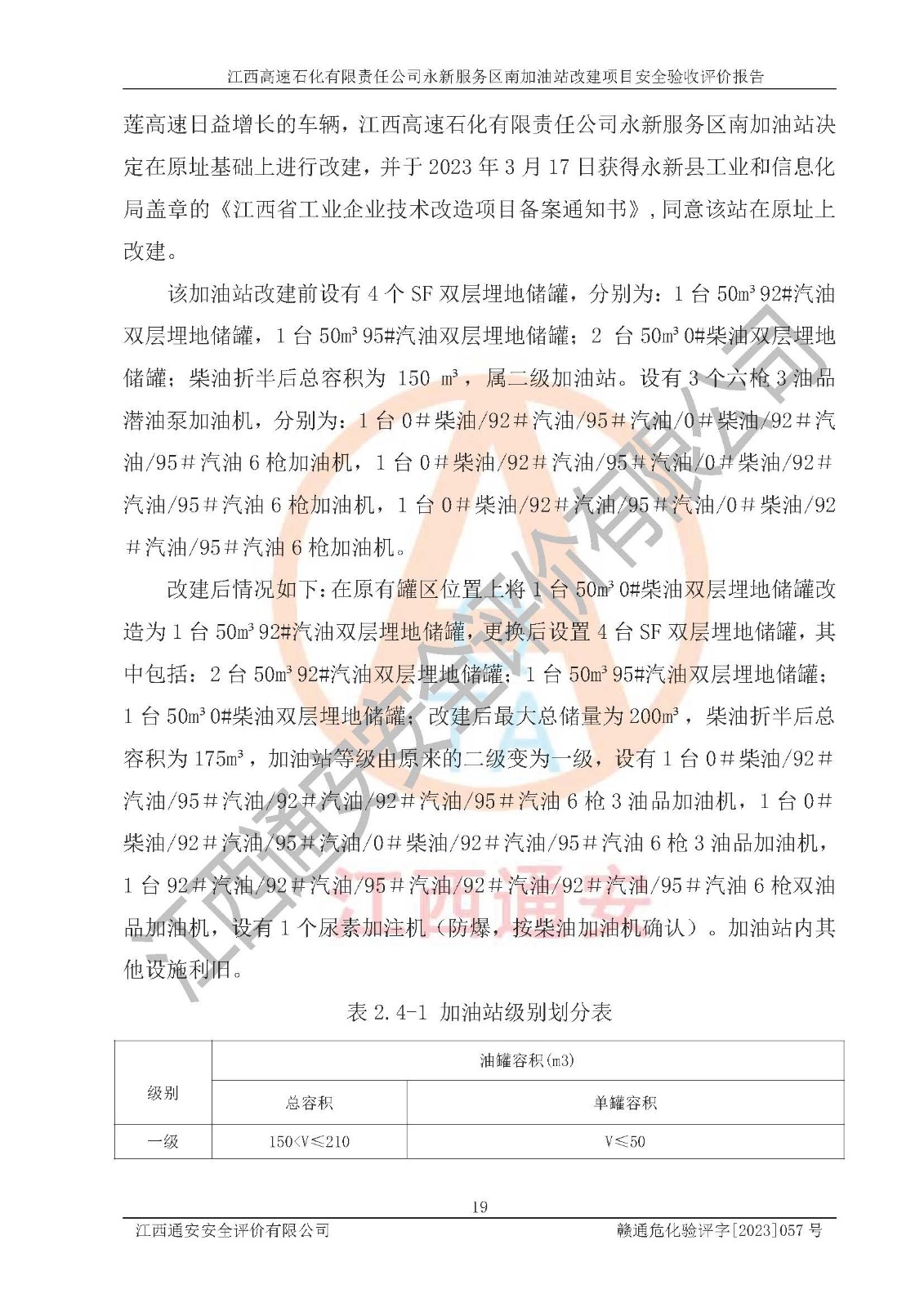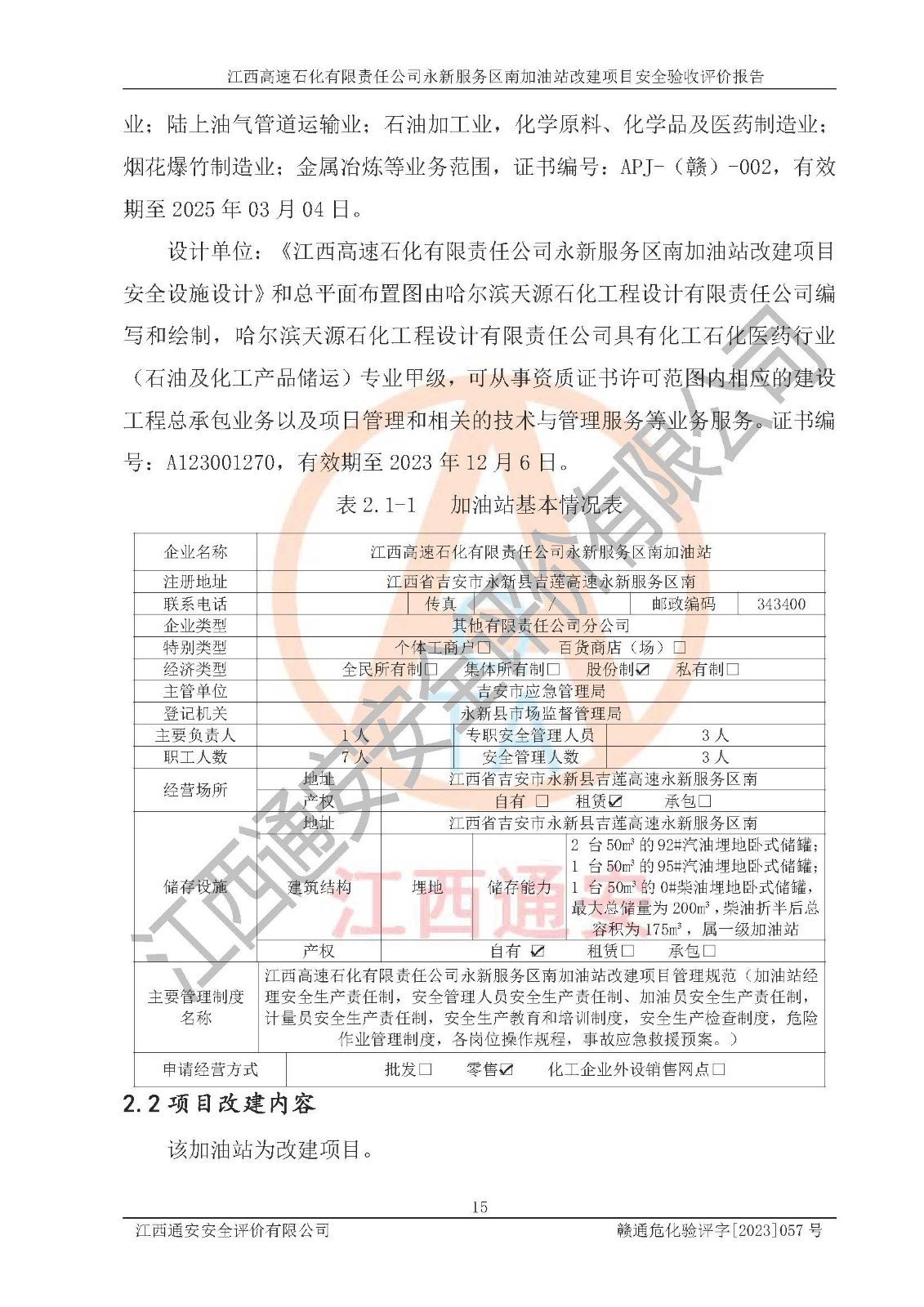 项目名称 | 江西高速石化有限责任公司永新服务区南加油站改建项目安全验收评价报告 | ||||
