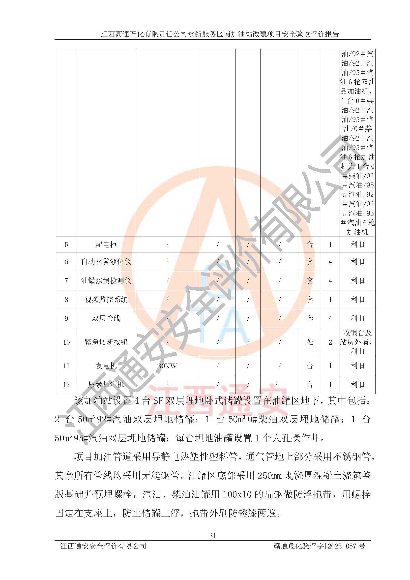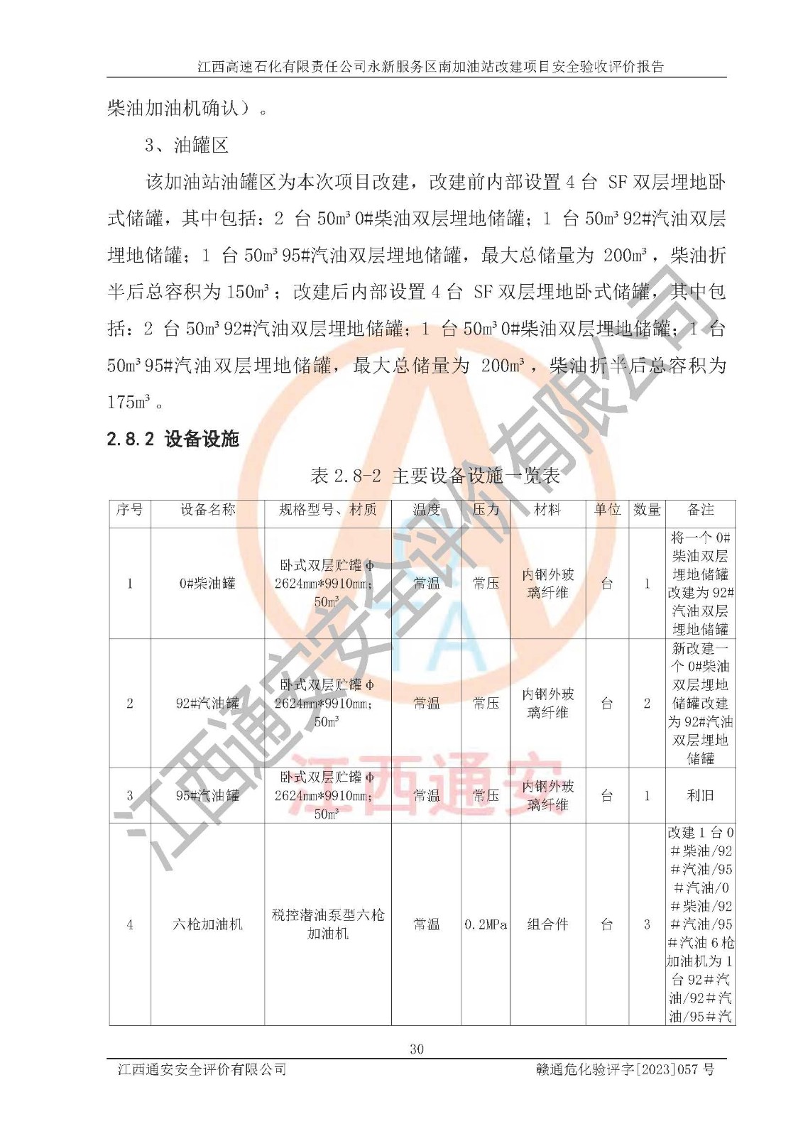 项目简介 | 江西高速石化有限责任公司永新服务区南加油站成立于2019年2月2日,类型:其他有限责任公司分公司;负责人:陈志斌;经营场所为江西省吉安市永新县吉莲高速永新服务区南。该公司营业执照经营范围:石油、石油化工、化纤及其他化工产品的销售;光伏、充电桩、日用百货便利店经营:汽车清洗服务:广告位出租:房屋租赁:食品、计生用品、零售卷烟、雪茄烟:委托代理收取水电费:销售润滑油、燃油料。(依法须经批准的项目,经相关部门批准后方可开展经营活动)。 该加油站于2023年12月4日经吉安市商务局核准变更换发成品油零售经营批准证书,证书编号:油零售证书第吉0299号。**期由2023年12月4日至2028年12月3日。于2023年11月16日由吉安市应急管理局变更发放危险化学品经营许可证,证书编号:赣吉危化经字【2022】360800000010。**期由2022年1月31日至2025年1月30日。 为提升优化加油站的整体布局,更好满足运营服务的需求,同时迎合吉莲高速日益增长的**,江西高速石化有限责任公司永新服务区南加油站决定在原址基础上进行改建,并于2023年3月17日获得永新县工业和信息化局盖章的《江西省工业企业技术改造项目备案通知书》,同意该站在原址上改建。 江西高速石化有限责任公司永新服务区南加油站改建项目位于江西省吉安市永新县吉莲高速永新服务区南,加油站用地面积约2000m2。 该加油站改建前设有4个SF双层埋地储罐,分别为:1台50m³92#汽油双层埋地储罐,1台50m³95#汽油双层埋地储罐;2 台50m³0#柴油双层埋地储罐;柴油折半后总容积为 150 m³,属二级加油站。设有3个六枪3油品潜油泵加油机,分别为:1台0#柴油/92#汽油/95#汽油/0#柴油/92#汽油/95#汽油6枪加油机,1台0#柴油/92#汽油/95#汽油/0#柴油/92#汽油/95#汽油6枪加油机,1台0#柴油/92#汽油/95#汽油/0#柴油/92#汽油/95#汽油6枪加油机。 改建后情况如下:在原有罐区位置上将1台50m³0#柴油双层埋地储罐改造为1台50m³92#汽油双层埋地储罐,更换后设置4台SF双层埋地储罐,其中包括:2台50m³92#汽油双层埋地储罐;1台50m³95#汽油双层埋地储罐;1台50m³0#柴油双层埋地储罐;改建后*大总储量为200m³,柴油折半后总容积为175m³,加油站等级由原来的二级变为一级,设有1台0#柴油/92#汽油/95#汽油/92#汽油/92#汽油/95#汽油6枪3油品加油机,1台0#柴油/92#汽油/95#汽油/0#柴油/92#汽油/95#汽油6枪3油品加油机,1台92#汽油/92#汽油/95#汽油/92#汽油/92#汽油/95#汽油6枪双油品加油机,设有1个尿素加注机(防爆,按柴油加油机确认),加油站内其他设施利旧。 江西高速石化有限责任公司永新服务区南加油站2022年12月委托江西省赣华安全生产科学技术咨询服务中心编制《江西高速石化有限责任公司永新服务区南加油站改建项目安全预评价报告》,并于2023年4月12日取得《危险化学品建设项目安全条件备案告知意见书》(吉市危化项目安条审字[2023]2号)。 江西高速石化有限责任公司永新服务区南加油站2023年4月委托哈尔滨天源石化工程设计有限责任公司编制《江西高速石化有限责任公司永新服务区南加油站改建项目安全设施设计》,并于2023年5月19日取得《危险化学品建设项目安全设施设计审查意见书》(吉市危化项目安设审字〔2023〕10号)。