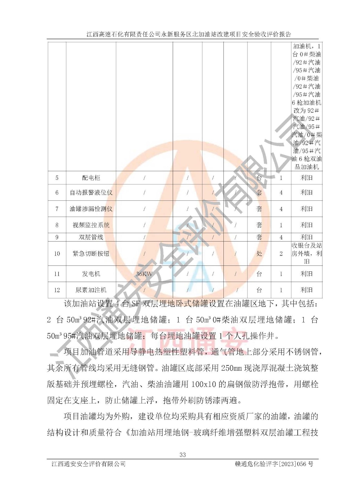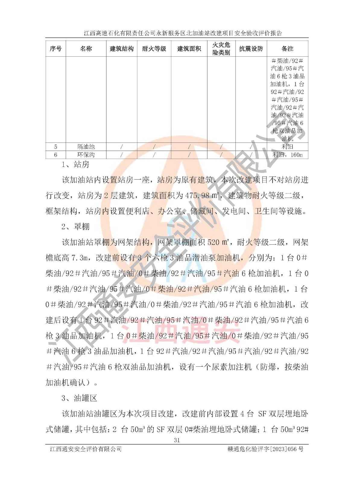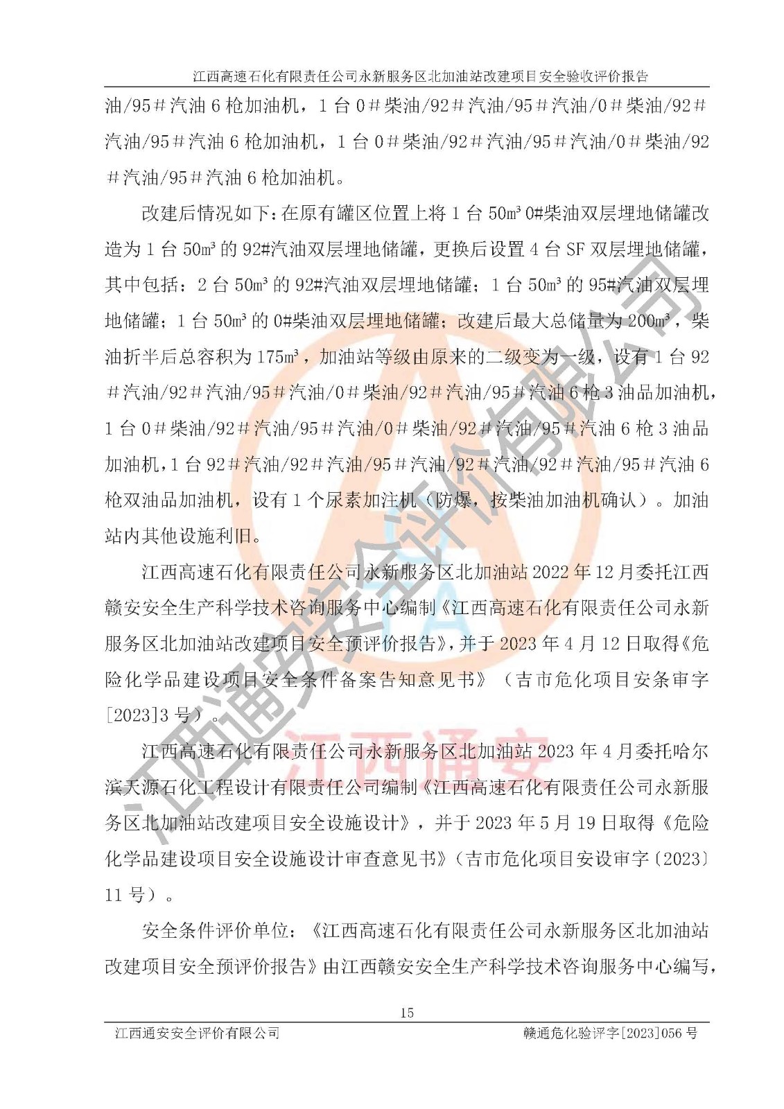 项目简介 | 江西高速石化有限责任公司永新服务区北加油站成立于2019年2月2日,类型:其他有限责任公司分公司;负责人:陈志斌;经营场所为江西省吉安市永新县吉莲高速永新服务区北。该公司营业执照经营范围:石油、石油化工、化纤及其他化工产品的销售;光伏、充电桩、日用百货便利店经营:汽车清洗服务:广告位出租:房屋租赁:食品、计生用品、零售卷烟、雪茄烟:委托代理收取水电费:销售润滑油、燃油料。(依法须经批准的项目,经相关部门批准后方可开展经营活动)。 该加油站于2023年12月4日经吉安市商务局核准变更换发成品油零售经营批准证书,证书编号:油零售证书第吉0300号。**期由2023年12月4日至2028年12月3日。于2023年11月16日由吉安市应急管理局变更发放危险化学品经营许可证,证书编号:赣吉危化经字【2022】360800000011。**期由2022年1月31日至2025年1月30日。 为提升优化加油站的整体布局,更好满足运营服务的需求,同时迎合吉莲高速日益增长的**,江西高速石化有限责任公司永新服务区北加油站决定在原址基础上进行改建,并于2023年3月17日获得永新县工业和信息化局盖章的《江西省工业企业技术改造项目备案通知书》,同意该站在原址上改建。 江西高速石化有限责任公司永新服务区北加油站改建项目位于江西省吉安市永新县吉莲高速永新服务区北,加油站用地面积约2000m2。 该加油站改建前设有4个SF双层埋地储罐,分别为:1台50m³92#汽油双层埋地储罐,1台50m³的95#汽油双层埋地储罐;2 台50m³的0#柴油双层埋地储罐;柴油折半后总容积为 150 m³,属二级加油站。设有3个六枪3油品潜油泵加油机,分别为:1台0#柴油/92#汽油/95#汽油/0#柴油/92#汽油/95#汽油6枪加油机,1台0#柴油/92#汽油/95#汽油/0#柴油/92#汽油/95#汽油6枪加油机,1台0#柴油/92#汽油/95#汽油/0#柴油/92#汽油/95#汽油6枪加油机。 改建后情况如下:在原有罐区位置上将1台50m³0#柴油双层埋地储罐改造为1台50m³的92#汽油双层埋地储罐,更换后设置4台SF双层埋地储罐,其中包括:2台50m³的92#汽油双层埋地储罐;1台50m³的95#汽油双层埋地储罐;1台50m³的0#柴油双层埋地储罐;改建后*大总储量为200m³,柴油折半后总容积为175m³,加油站等级由原来的二级变为一级,设有1台92#汽油/92#汽油/95#汽油/0#柴油/92#汽油/95#汽油6枪3油品加油机,1台0#柴油/92#汽油/95#汽油/0#柴油/92#汽油/95#汽油6枪3油品加油机,1台92#汽油/92#汽油/95#汽油/92#汽油/92#汽油/95#汽油6枪双油品加油机,设有1个尿素加注机(防爆,按柴油加油机确认)。加油站内其他设施利旧。 江西高速石化有限责任公司永新服务区北加油站2022年12月委托江西赣安安全生产科学技术咨询服务中心编制《江西高速石化有限责任公司永新服务区北加油站改建项目安全预评价报告》,并于2023年4月12日取得《危险化学品建设项目安全条件备案告知意见书》(吉市危化项目安条审字[2023]3号)。 江西高速石化有限责任公司永新服务区北加油站2023年4月委托哈尔滨天源石化工程设计有限责任公司编制《江西高速石化有限责任公司永新服务区北加油站改建项目安全设施设计》,并于2023年5月19日取得《危险化学品建设项目安全设施设计审查意见书》(吉市危化项目安设审字〔2023〕11号)。