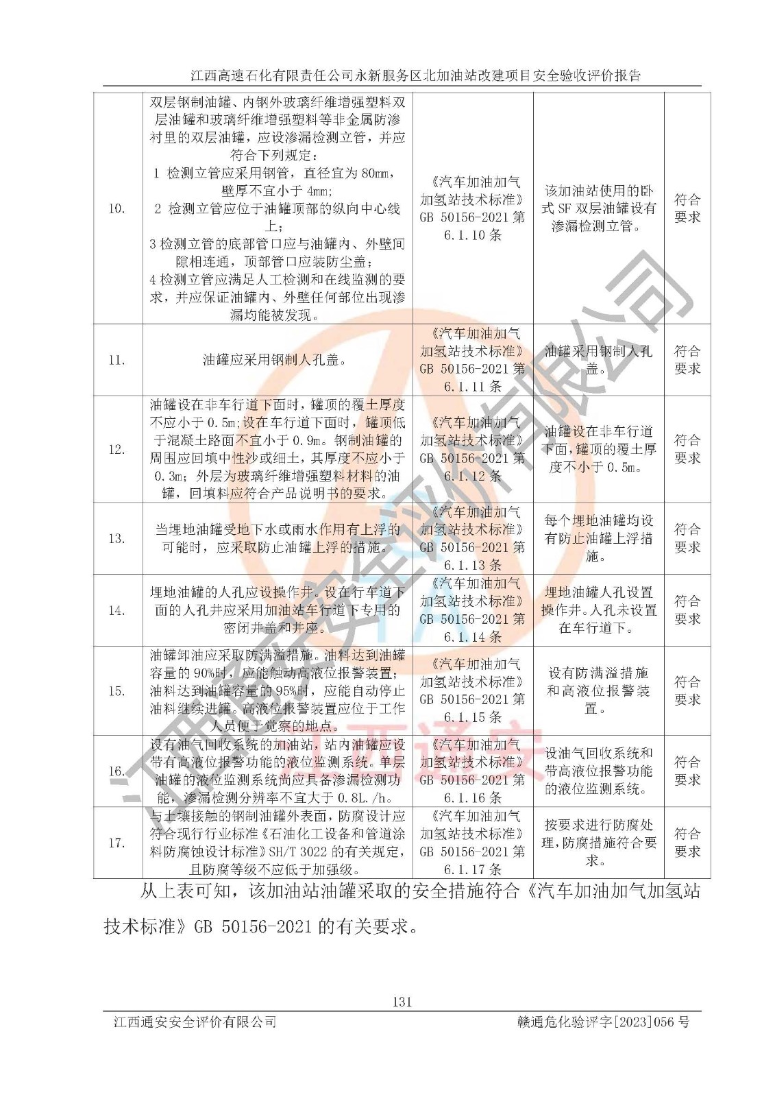其它 | 在对该项目危险、有害因素辨识分析的基础上,运用安全检查表、预作业条件危险性分析法、危险度评价、重大事故后果分析结果等评价方法对该项目进行了分析评价,评价结果如下: 1、该项目位于江西省吉安市永新县吉莲高速永新服务区北,符合当地规划,与周边环境的距离符合有关标准、规范的要求。 2、总图布置分区明确,布局合理,各建构筑物的防火间距满足规范要求。 3、该项目无**明令淘汰的工艺,设备、设施与工艺条件、内部介质相适应,特种设备及设施较齐全,按规定设置防雷、防静电接地,爆炸危险环境加油机按要求采用防爆型,符合相关标准规范要求。 5、企业设置了安全生产管理机构,配备了专职安全生产管理人员,建立了安全生产责任制和安全生产管理制度,编制了岗位操作规程,编制了生产安全事故应急预案,人员经过相应的培训,企业的安全生产管理正常。 6、作业条件危险性评价结果:在选定的评价单元中,作业危险程度均为“一般危险,需要注意”,作业条件相对安全。 7、危险度评价结果:汽油储罐的危险程度为**危险。其设置了储油罐安装高液位报警功能的液位监测系统,当油料达到油罐容量90%时,触动高液位报警装置,油料达到油罐容量95%时,自动停止油料继续进罐。同时,也采取了防止油品渗漏的保护措施,如采用双层油罐,埋地加油管道采用双层管道,渗漏检测在线检测系统等,可以满足安全生产条件要求。 评价结论: 江西高速石化有限责任公司永新服务区北加油站工艺设备和安全设施运行正常,安全管理机制运行正常,安全设施、措施达到设计要求和预期结果,可以满足建设项目安全生产的要求,安全生产管理**,项目具备危险化学品经营单位安全经营条件的要求。 | ||||