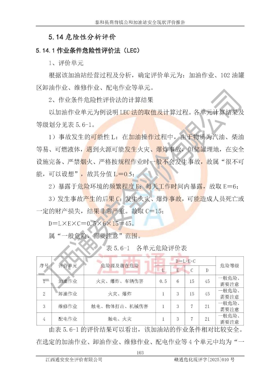 其它 | 在对该项目危险、有害因素辨识分析的基础上,运用安全检查表、预作业条件危险性分析法、危险度评价、重大事故后果分析结果等评价方法对该项目进行了分析评价,评价结果如下: 1、该项目位于江西省吉安市泰和县苑前镇,符合当地规划,与周边环境的距离符合有关标准、规范的要求。 2、总图布置分区明确,布局合理,各建构筑物的防火间距满足规范要求。 3、该项目无**明令淘汰的工艺,设备、设施与工艺条件、内部介质相适应,特种设备及设施较齐全,按规定设置防雷、防静电接地,爆炸危险环境加油机按要求采用防爆型,符合相关标准规范要求。 5、企业设置了安全生产管理机构,配备了专职安全生产管理人员,建立了安全生产责任制和安全生产管理制度,编制了岗位操作规程,编制了生产安全事故应急预案,人员经过相应的培训,企业的安全生产管理正常。 6、作业条件危险性评价结果:在选定的评价单元中,作业危险程度均为“一般危险,需要注意”,作业条件相对安全。 7、危险度评价结果:汽油储罐的危险程度为低度危险。油罐采用双层罐埋地设置,按要求设置了通气管,并装设了阻火器;设置了液位监测报警系统和紧急切断系统,其安全风险可控。 评价结论: 泰和县苑前镇公和加油站工艺设备和安全设施运行正常,安全管理机制运行正常,安全设施、措施达到设计要求和预期结果,可以满足建设项目安全生产的要求,安全生产管理**,项目具备危险化学品经营单位安全经营条件的要求。 | ||||
