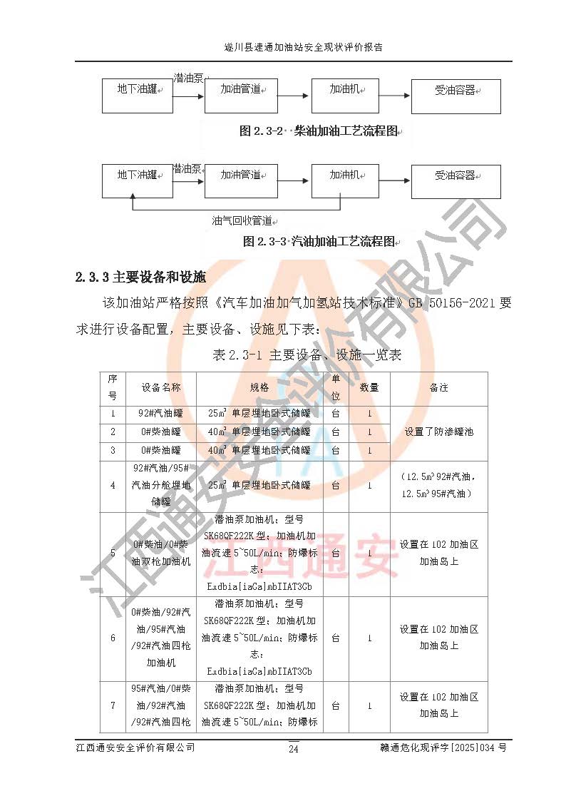 项目简介 | 遂川县速通加油站是一家从事汽油、柴油零售经营的企业。该加油站于2016年9月14日经遂川县市场监督管理局核准注册成立,营业场所位于江西省吉安市遂川县高速公路连接线(泉江镇洋村段)。该加油站属于普通合伙企业,该加油站于2022年10月10日变更执行事务合伙人,现执行事务合伙人为谢新华,营业执照统一社会信用代码为:91360827MA35KGPLOE。营业执照核准经营范围:许可项目:成品油零售,食品销售(依法须经批准的项目,经相关部门批准后在许可**期内方可开展经营活动,具体经营项目和许可期限以相关部门批准文件或许可证件为准)。 遂川县速通加油站占地面积3282.06m2,加油站中设有1台0#柴油/0#柴油双枪加油机、1台0#柴油/92#汽油/95#汽油/92#汽油四枪加油机、1台95#汽油/0#柴油/92#汽油/92#汽油四枪加油机、1台92#汽油/92#汽油双枪加油机;2台40m30#柴油单层埋地储罐、1台25m392#汽油单层埋地储罐、1台25m³92#汽油/95#汽油分舱双层埋地储罐(12.5m³92#汽油,12.5m³95#汽油),油品*大储存能力为90m3(柴油罐容积折半计入油罐总容积),属三级加油站,汽油卸油、加油设置了油气回收系统。 遂川县速通加油站于2022年9月26日经吉安市应急管理局核准,换发了新的《危险化学品经营许可证》,证书编号:赣吉危化经字[2022]360800000041号,许可经营范围:成品油。**期2022年9月9日至2025年9月8日。 遂川县速通加油站2022年1月20日经吉安市商务局核准,换取了新的《成品油零售经营批准证书》,证书编号:油零售证书第吉0181号,批准从事成品油(汽油、柴油)零售业务。证书**期至2022年1月20日至2027年1月19日。 | ||||