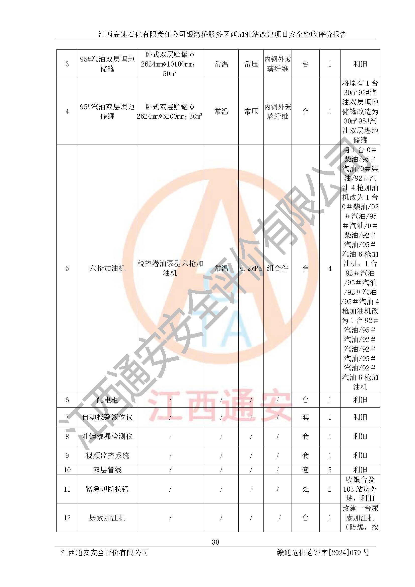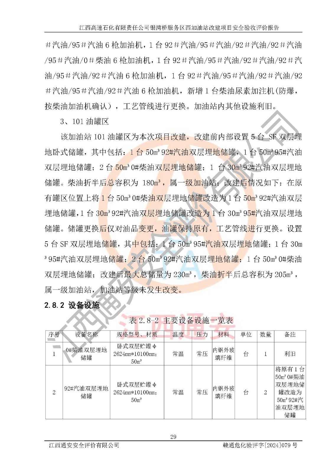 项目简介 | 江西高速石化有限责任公司银湾桥服务区西加油站成立于2011年9月16日,企业类型:其他有限责任公司分公司,负责人陈志斌。该站位于吉安县固江镇武吉高速银湾桥服务区,加油站为企业自有(建站土地为企业租赁所得),经营范围为:许可项目:成品油零售,成品油零售(不含危险化学品)(依法须经批准的项目,经相关部门批准后在许可**期内方可开展经营活动,具体经营项目和许可期限以相关部门批准文件或许可证件为准)一般项目:石油制品销售(不含危险化学品)(除依法须经批准的项目外,凭营业执照依法自主开展经营活动)。 该加油站于2023年11月2日经吉安市商务局核准换发成品油零售经营批准证书,证书编号:油零售证书第吉0296号。**期由2023年11月2日至2028年11月1日。于2023年10月30日由吉安市应急管理局变更发放危险化学品经营许可证,证书编号:赣吉危化经字【2022】360800000169号。**期由2022年12月23日至2025年12月22日。 为提升优化加油站的整体布局,更好满足运营服务的需求,同时迎合武吉高速日益增长的**,江西高速石化有限责任公司银湾桥服务区西加油站决定在原址基础上进行改建,并于2024年7月1日提交《江西高速石化有限责任公司银湾桥服务区西加油站在原址改建的请示》,2024年7月11日取得由吉安县发展和改革委员会盖章的《江西省企业投资项目备案通知书》,同意该站在原址上改建。 该加油站改建前设有5个SF双层埋地储罐,分别为:1台50m³92#汽油双层埋地储罐,1台50m³95#汽油双层埋地储罐;2台50m³0#柴油双层埋地储罐;1 台30m³92#汽油双层埋地储罐。柴油折半后总容积为 180m³,属**加油站。设有2台4枪潜油泵加油机,2台6枪潜油泵加油机,分别为:1台0#柴油/95#汽油/0#柴油/92#汽油4枪加油机,1台92#汽油/95#汽油/0#柴油/92#汽油/95#汽油/0#柴油6枪加油机,1台92#汽油/95#汽油/0#柴油/92#汽油/95#汽油/0#柴油6枪加油机,1台92#汽油/95#汽油/92#汽油/95#汽油4枪加油机。 改建后情况如下:在原有罐区位置上将1台50m³0#柴油双层埋地储罐改造为1台50m³92#汽油双层埋地储罐,1台30m³92#汽油双层埋地储罐改造为1台30m³95#汽油双层埋地储罐。储罐更换后仅对油品变更,油罐保持原有,工艺管线进行更换。设置5台SF双层埋地储罐,其中包括:1台50m³95#汽油双层埋地储罐;1台30m³95#汽油双层埋地储罐;2台50m³92#汽油双层埋地储罐;1台50m³0#柴油双层埋地储罐;改建后*大总储量为230m³,柴油折半后总容积为205m³,属**加油站,加油站等级未发生改变。加油机更换后在原有102加油区位置将2台4枪加油机改造为2台6枪加油机,加油机加油枪号发生改变,设有1台0#柴油/92#汽油/95#汽油/0#柴油/92#汽油/95#汽油6枪加油机,1台92#汽油/95#汽油/92#汽油/92#汽油/95#汽油/0#柴油6枪加油机,1台92#汽油/95#汽油/92#汽油/92#汽油/95#汽油/92#汽油6枪加油机,1台92#汽油/95#汽油/92#汽油/92#汽油/95#汽油/92#汽油6枪加油机,新增1台柴油尿素加注机(防爆,按柴油加油机确认),工艺管线进行更换。加油站内其他设施利旧。 江西高速石化有限责任公司银湾桥服务区西加油站2024年7月委托山东新安达工程咨询有限公司编制《江西高速石化有限责任公司银湾桥服务区西加油站改建项目安全条件评价报告》,并于2024年9月9日取得《危险化学品建设项目安全条件备案告知意见书》(吉市危化项目安条备字[2024]7号)。 江西高速石化有限责任公司银湾桥服务区西加油站2024年10月委托天津中德工程设计有限公司编制《江西高速石化有限责任公司银湾桥服务区西加油站改建项目安全设施设计》,并于2024年10月24日取得《危险化学品建设项目安全设施设计审查意见书》(吉市危化项目安设审字〔2024〕29号)。 | ||||