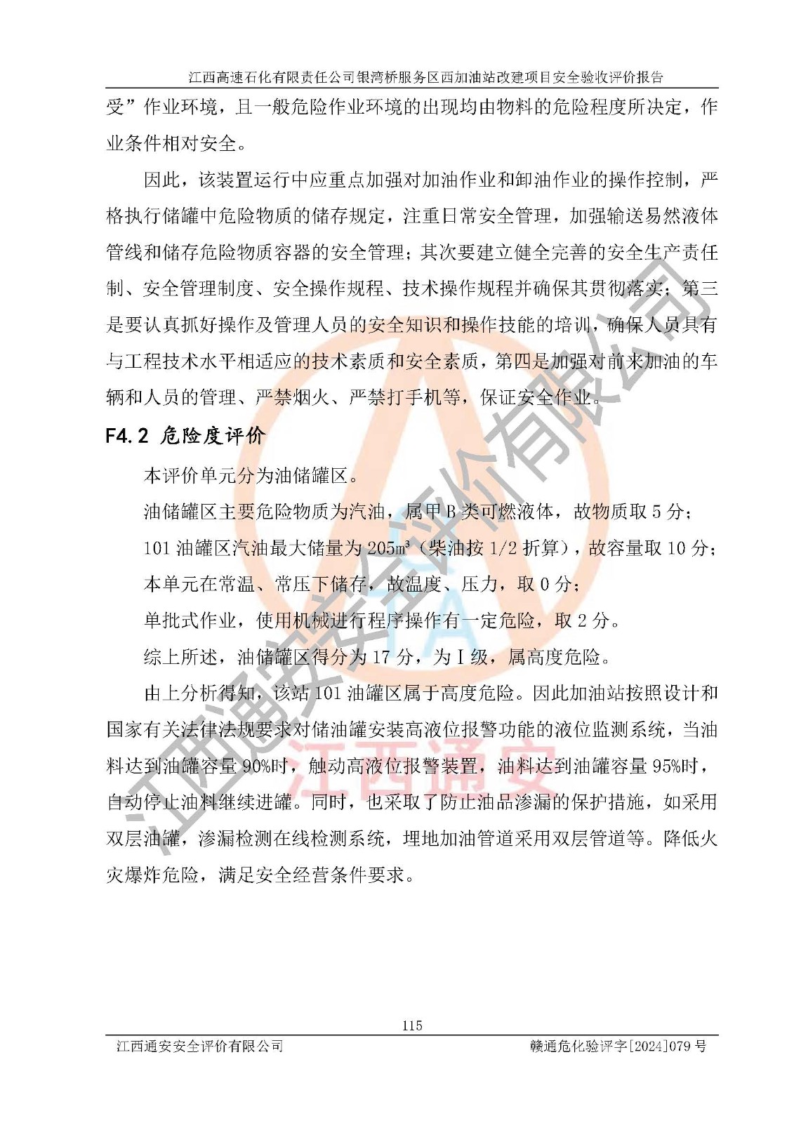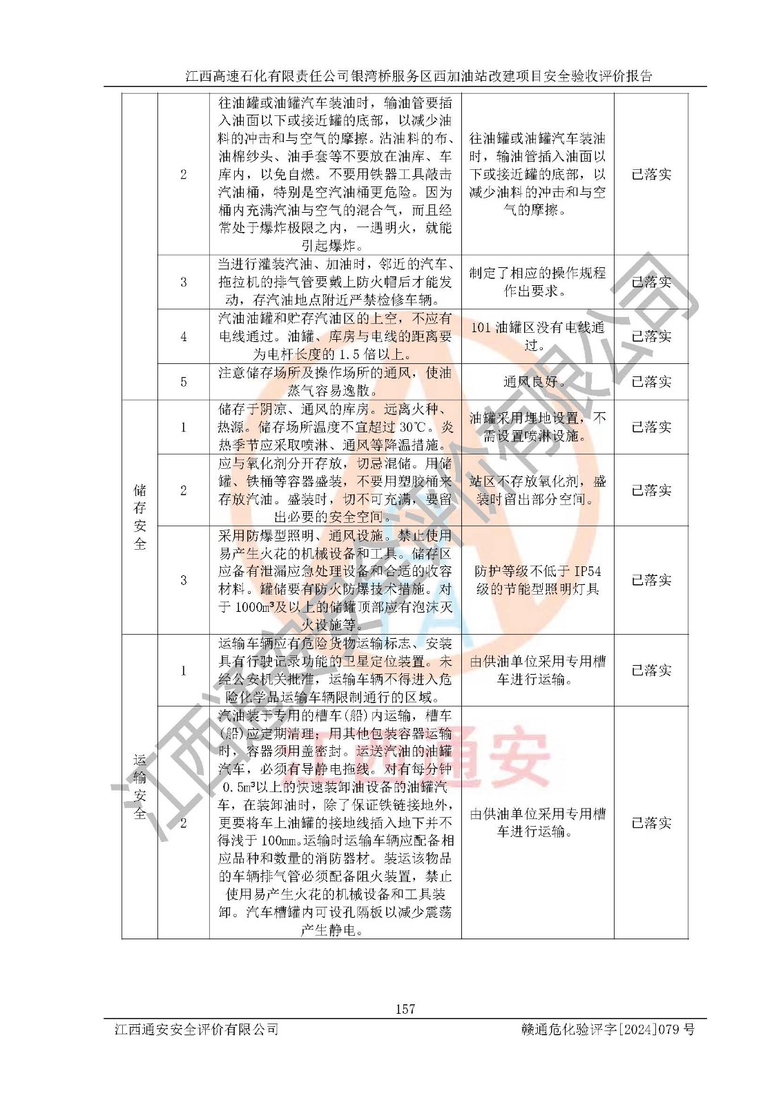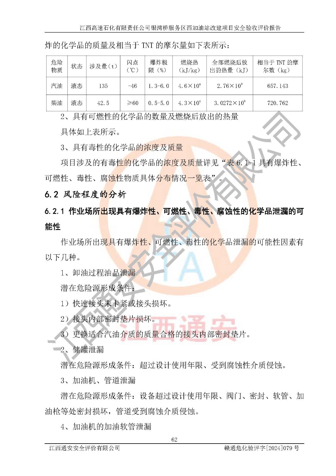其它 | 在对该项目危险、有害因素辨识分析的基础上,运用安全检查表、预作业条件危险性分析法、危险度评价、重大事故后果分析结果等评价方法对该项目进行了分析评价,评价结果如下: 1、该项目位于吉安县固江镇武吉高速银湾桥服务区,符合当地规划,与周边环境的距离符合有关标准、规范的要求。 2、总图布置分区明确,布局合理,各建构筑物的防火间距满足规范要求。 3、该项目无**明令淘汰的工艺,设备、设施与工艺条件、内部介质相适应,特种设备及设施较齐全,按规定设置防雷、防静电接地,爆炸危险环境加油机按要求采用防爆型,符合相关标准规范要求。 5、企业设置了安全生产管理机构,配备了专职安全生产管理人员,建立了安全生产责任制和安全生产管理制度,编制了岗位操作规程,编制了生产安全事故应急预案,人员经过相应的培训,企业的安全生产管理正常。 6、作业条件危险性评价结果:在选定的评价单元中,作业危险程度均为“一般危险,需要注意”,作业条件相对安全。 7、危险度评价结果:汽油储罐的危险程度为**危险。其设置了当油料达到油罐容量90%时,触动高液位报警装置,油料达到油罐容量95%时,自动停止油料继续进罐。同时,也采取了防止油品渗漏的保护措施,如采用双层油罐,渗漏检测在线检测系统,埋地加油管道采用双层管道等,可以满足安全生产条件要求。 评价结论: 江西高速石化有限责任公司银湾桥服务区西加油站工艺设备和安全设施运行正常,安全管理机制运行正常,安全设施、措施达到设计要求和预期结果,可以满足建设项目安全生产的要求,安全生产管理**,项目具备危险化学品经营单位安全经营条件的要求。 | ||||
