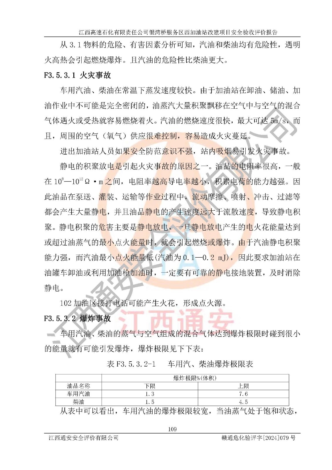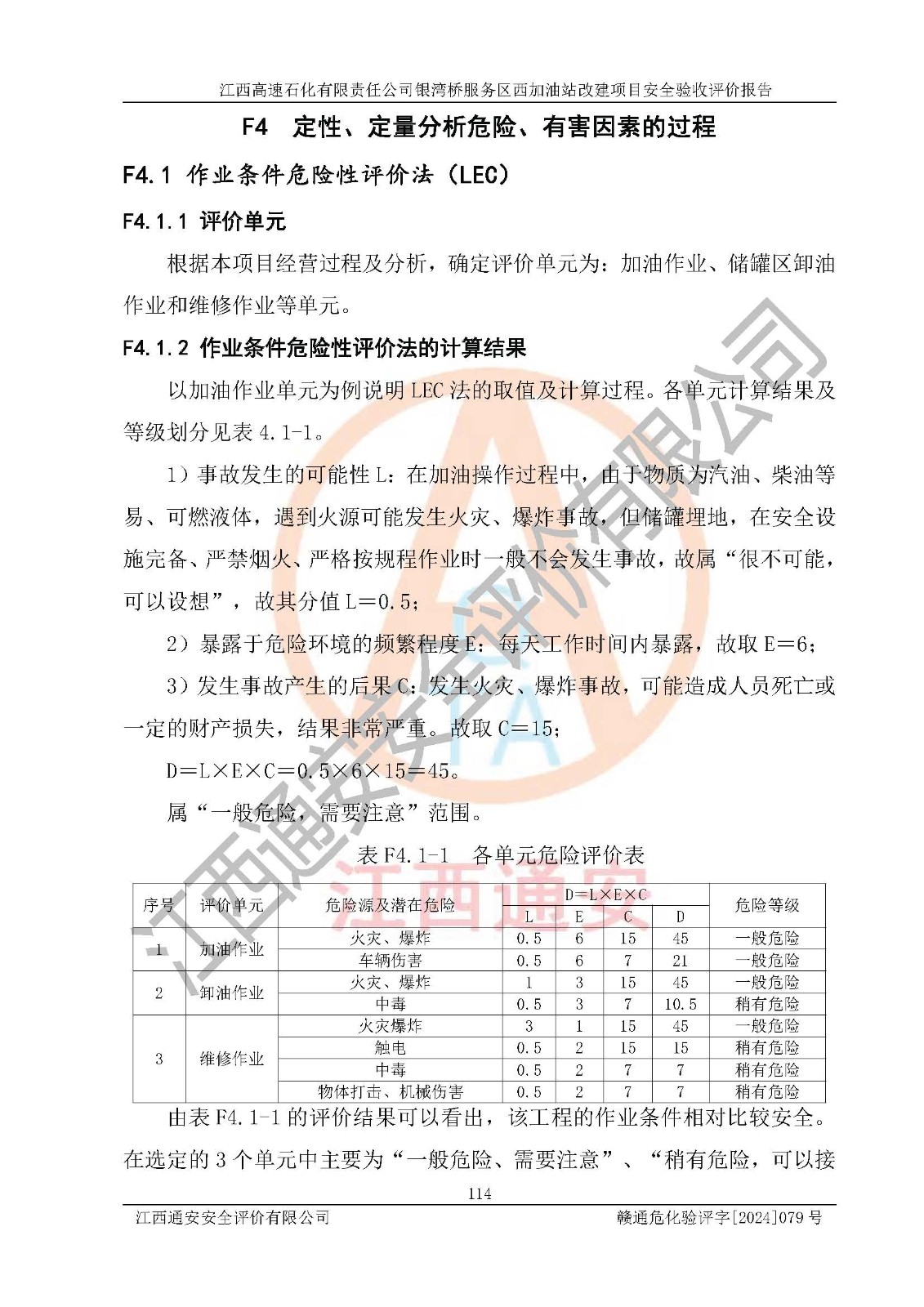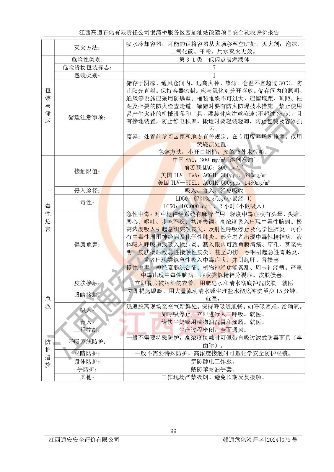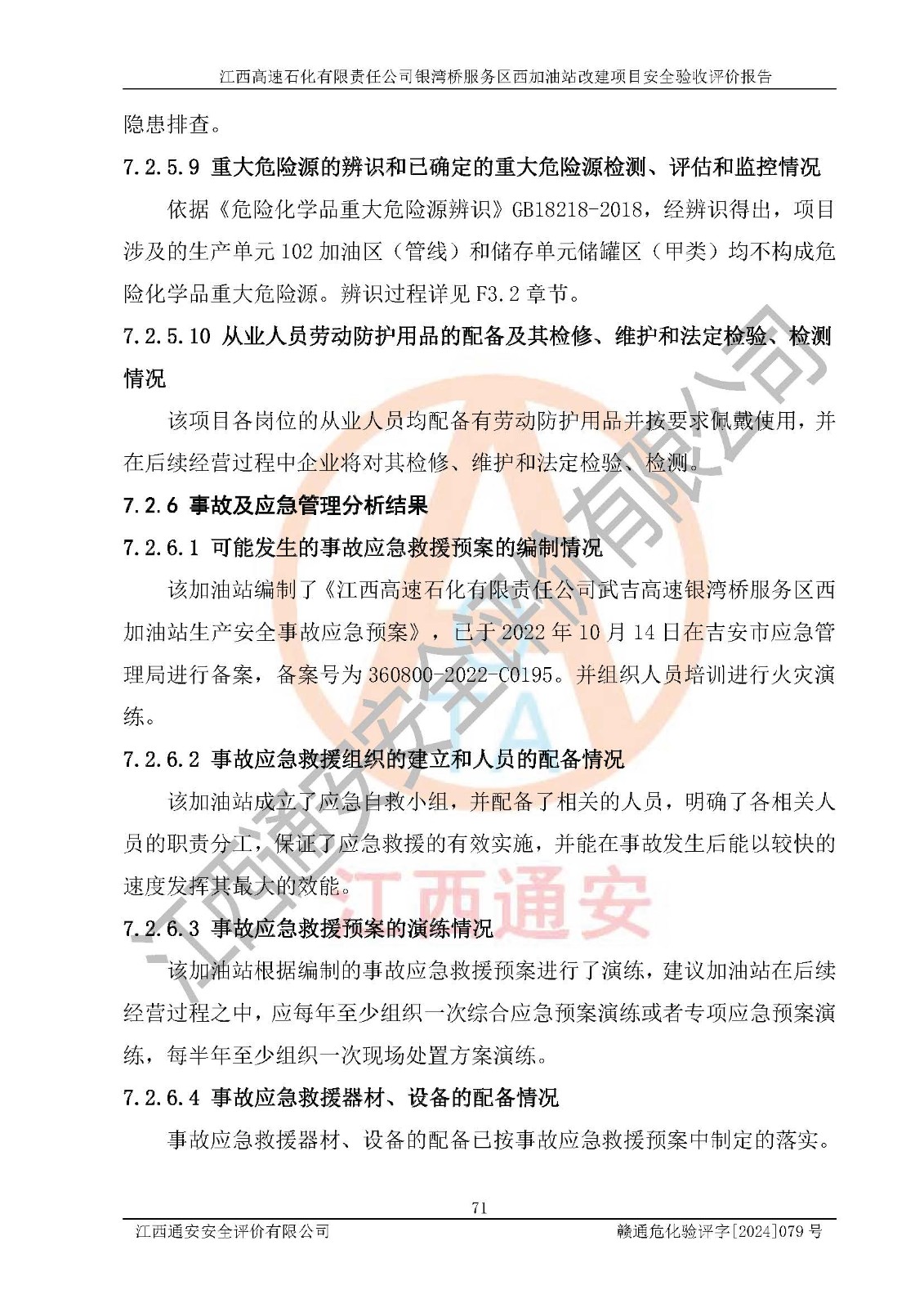 其它 | 在对该项目危险、有害因素辨识分析的基础上,运用安全检查表、预作业条件危险性分析法、危险度评价、重大事故后果分析结果等评价方法对该项目进行了分析评价,评价结果如下: 1、该项目位于吉安县固江镇武吉高速银湾桥服务区,符合当地规划,与周边环境的距离符合有关标准、规范的要求。 2、总图布置分区明确,布局合理,各建构筑物的防火间距满足规范要求。 3、该项目无**明令淘汰的工艺,设备、设施与工艺条件、内部介质相适应,特种设备及设施较齐全,按规定设置防雷、防静电接地,爆炸危险环境加油机按要求采用防爆型,符合相关标准规范要求。 5、企业设置了安全生产管理机构,配备了专职安全生产管理人员,建立了安全生产责任制和安全生产管理制度,编制了岗位操作规程,编制了生产安全事故应急预案,人员经过相应的培训,企业的安全生产管理正常。 6、作业条件危险性评价结果:在选定的评价单元中,作业危险程度均为“一般危险,需要注意”,作业条件相对安全。 7、危险度评价结果:汽油储罐的危险程度为**危险。其设置了当油料达到油罐容量90%时,触动高液位报警装置,油料达到油罐容量95%时,自动停止油料继续进罐。同时,也采取了防止油品渗漏的保护措施,如采用双层油罐,渗漏检测在线检测系统,埋地加油管道采用双层管道等,可以满足安全生产条件要求。 评价结论: 江西高速石化有限责任公司银湾桥服务区西加油站工艺设备和安全设施运行正常,安全管理机制运行正常,安全设施、措施达到设计要求和预期结果,可以满足建设项目安全生产的要求,安全生产管理**,项目具备危险化学品经营单位安全经营条件的要求。 | ||||