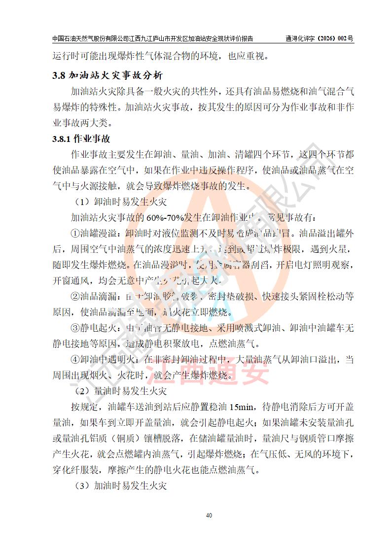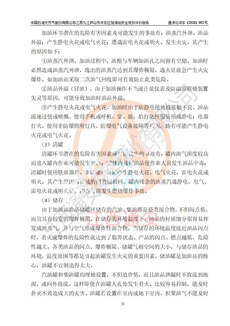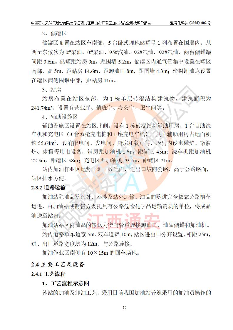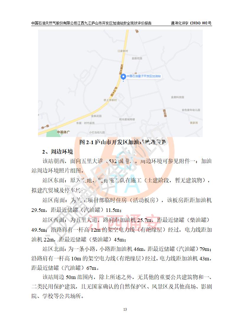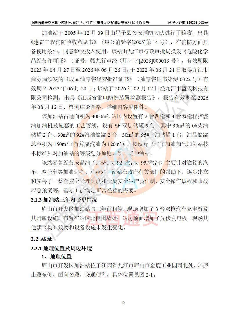 项目简介 | 中国石油天然气股份有限公司江西九江庐山市开发区加油站是一家专门从事成品油零售经营的其他股份有限公司分公司(上市),经营场所位于江西省九江市庐山市金鹿工业园西北处、环庐山路东侧。现有从业人员9名,其中安全管理人员1人,加油站负责人杨全荣。 该加油站占地面积为4000m2,站区内设置有2台四枪和4台双枪程控燃油加油机及配套的工艺管线,设有SF双层储罐5台,其中30m3的0#柴油储罐2台、30m3的92#汽油储罐2台,30m3的95#汽油储罐1台,油品储罐总容积为150m3(折算成汽油为120m3),按现行《汽车加油加气加氢站技术标准》对加油站的等级划分原则,属二级加油站。 该站由九江市行政审批局换发《危险化学品经营许可证》(证号:赣九行审经(甲)字[2023]000013号),**期限2023年04月27日至2026年04月26日。 | |||
