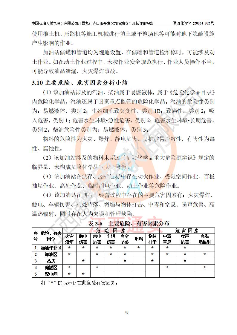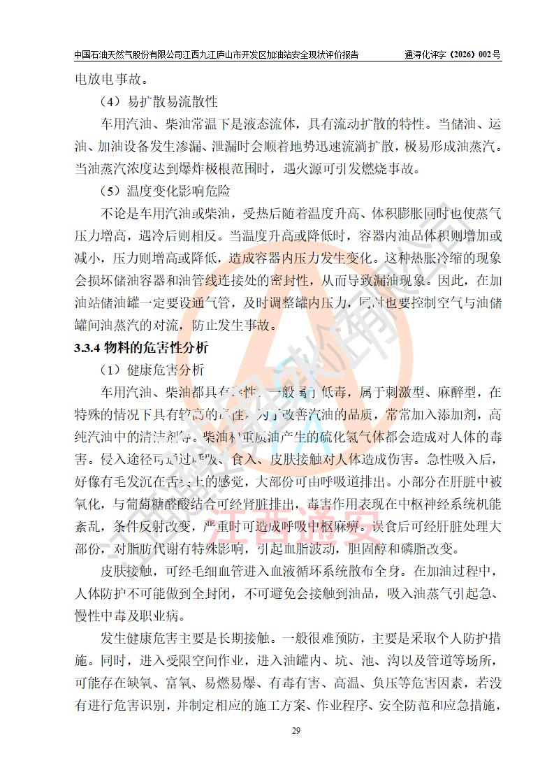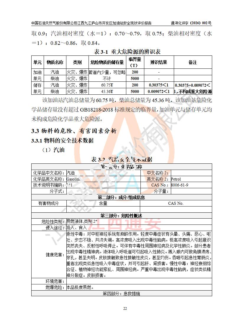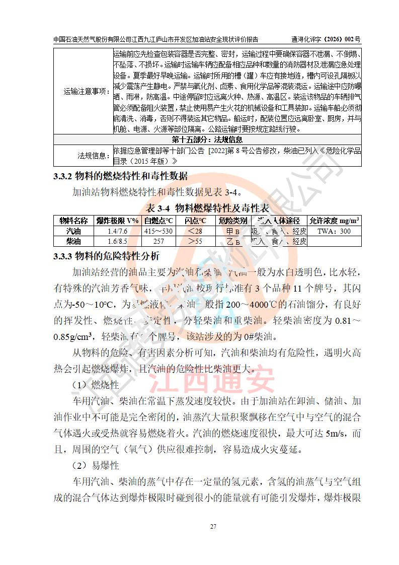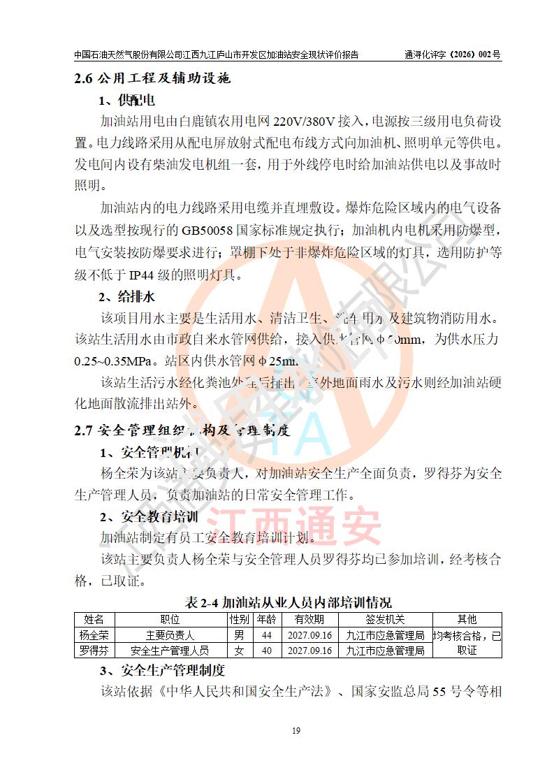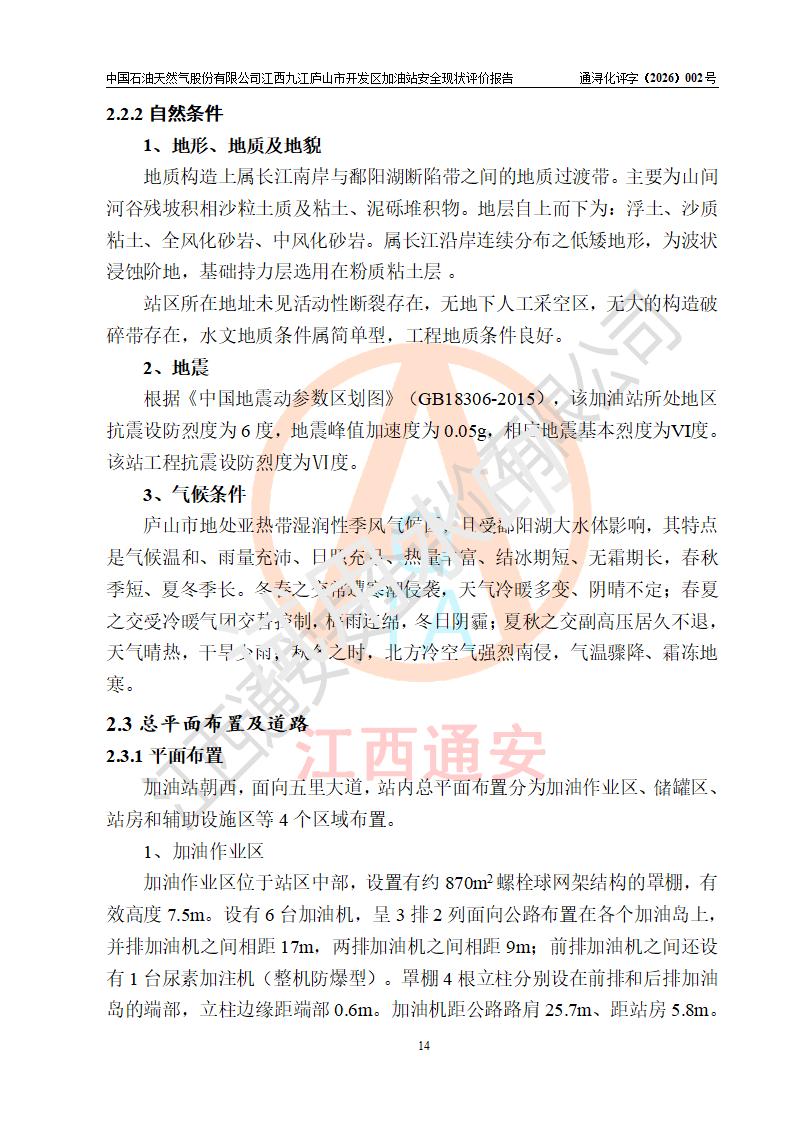 项目简介 | 中国石油天然气股份有限公司江西九江庐山市开发区加油站是一家专门从事成品油零售经营的其他股份有限公司分公司(上市),经营场所位于江西省九江市庐山市金鹿工业园西北处、环庐山路东侧。现有从业人员9名,其中安全管理人员1人,加油站负责人杨全荣。 该加油站占地面积为4000m2,站区内设置有2台四枪和4台双枪程控燃油加油机及配套的工艺管线,设有SF双层储罐5台,其中30m3的0#柴油储罐2台、30m3的92#汽油储罐2台,30m3的95#汽油储罐1台,油品储罐总容积为150m3(折算成汽油为120m3),按现行《汽车加油加气加氢站技术标准》对加油站的等级划分原则,属二级加油站。 该站由九江市行政审批局换发《危险化学品经营许可证》(证号:赣九行审经(甲)字[2023]000013号),**期限2023年04月27日至2026年04月26日。 | |||