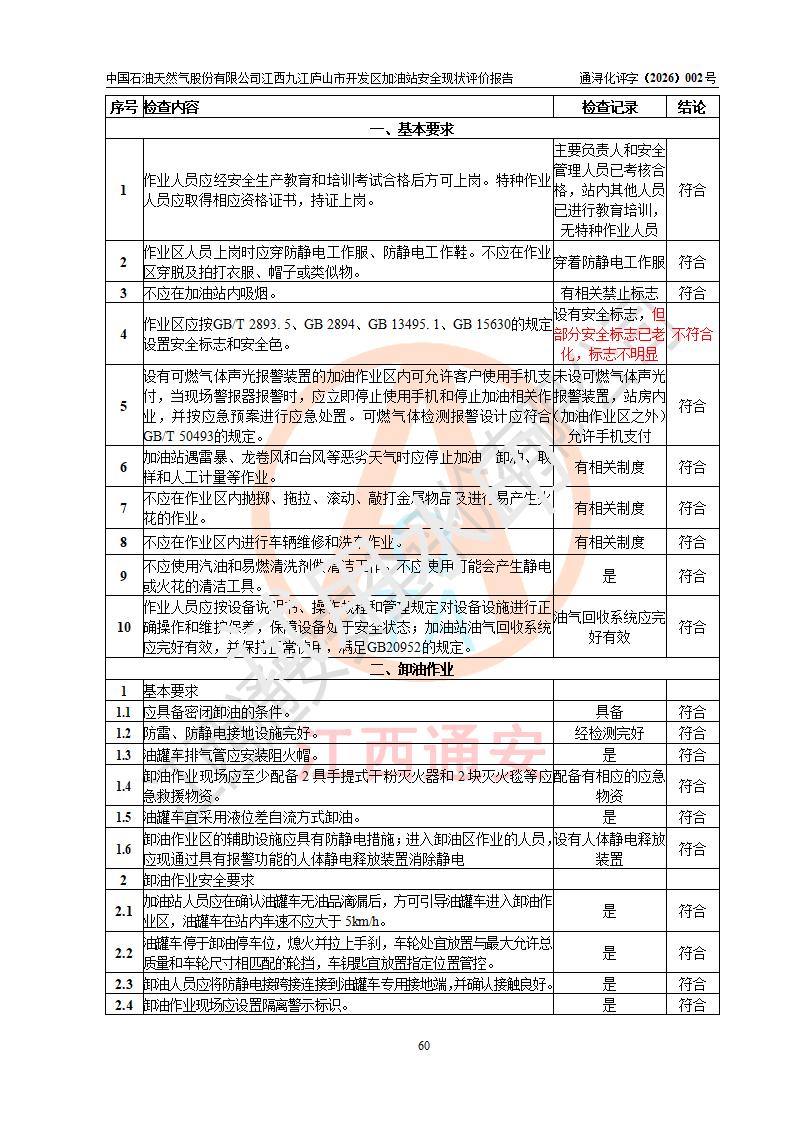 评价结论 | 中国石油天然气股份有限公司江西九江庐山市开发区加油站涉及的安全条件、安全经营条件、安全生产管理符合《危险化学品经营许可证管理办法》、《汽车加油加气加氢站技术标准》等**有关法规、标准、规范要求,能满足危险化学品经营安全条件。 | |||