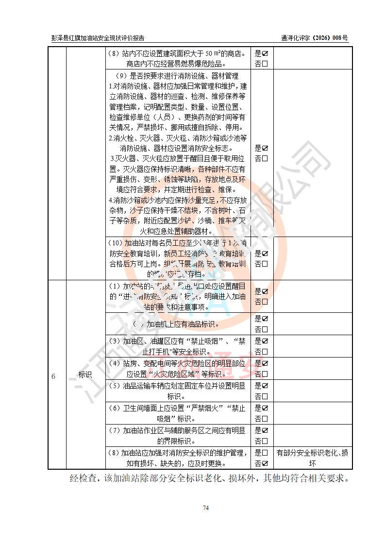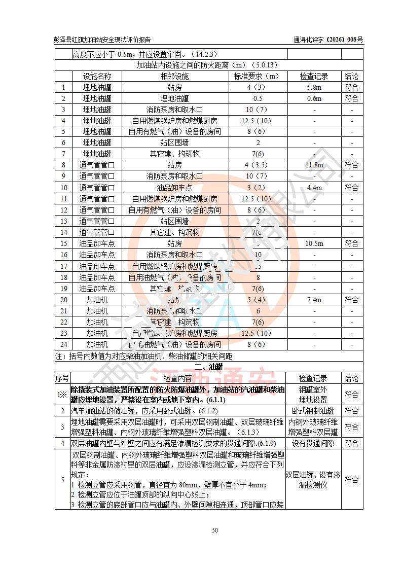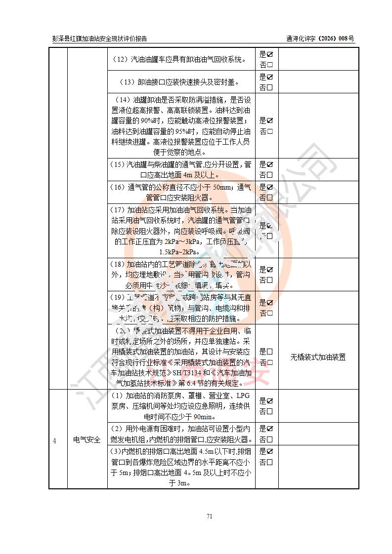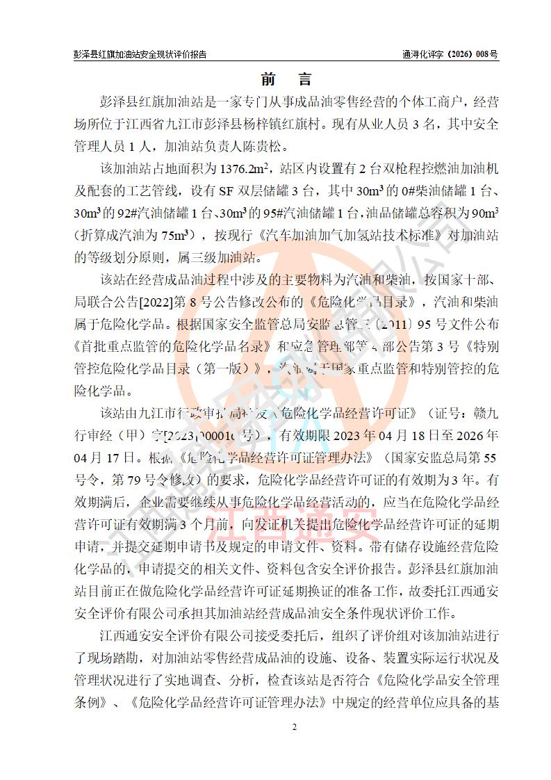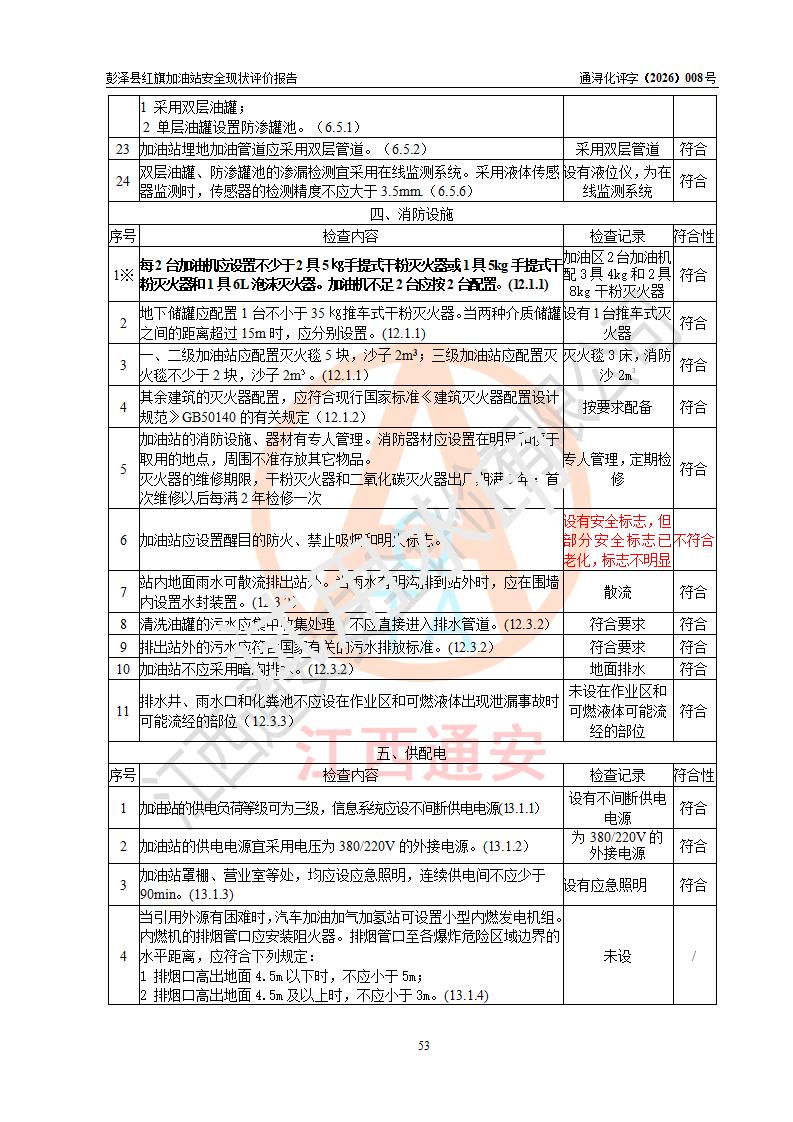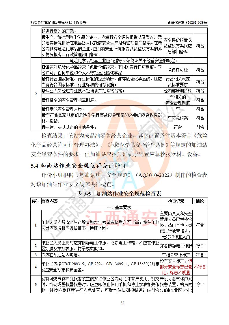 评价结论 | 彭泽县红旗加油站涉及的安全条件、安全经营条件、安全生产管理符合《危险化学品经营许可证管理办法》、《汽车加油加气加氢站技术标准》等**有关法规、标准、规范要求,能满足危险化学品经营安全条件。 | |||