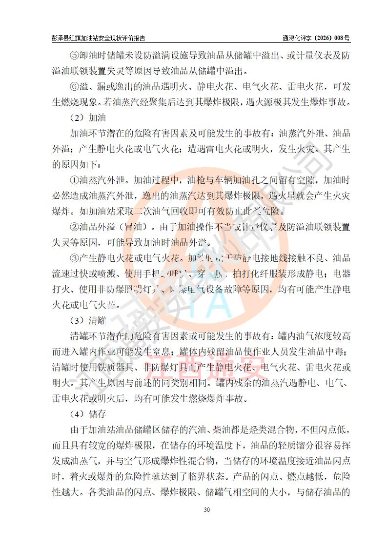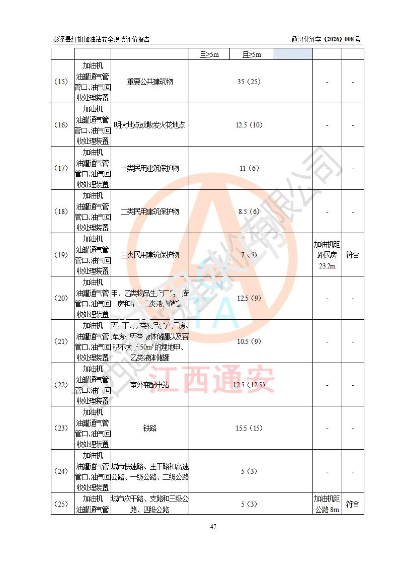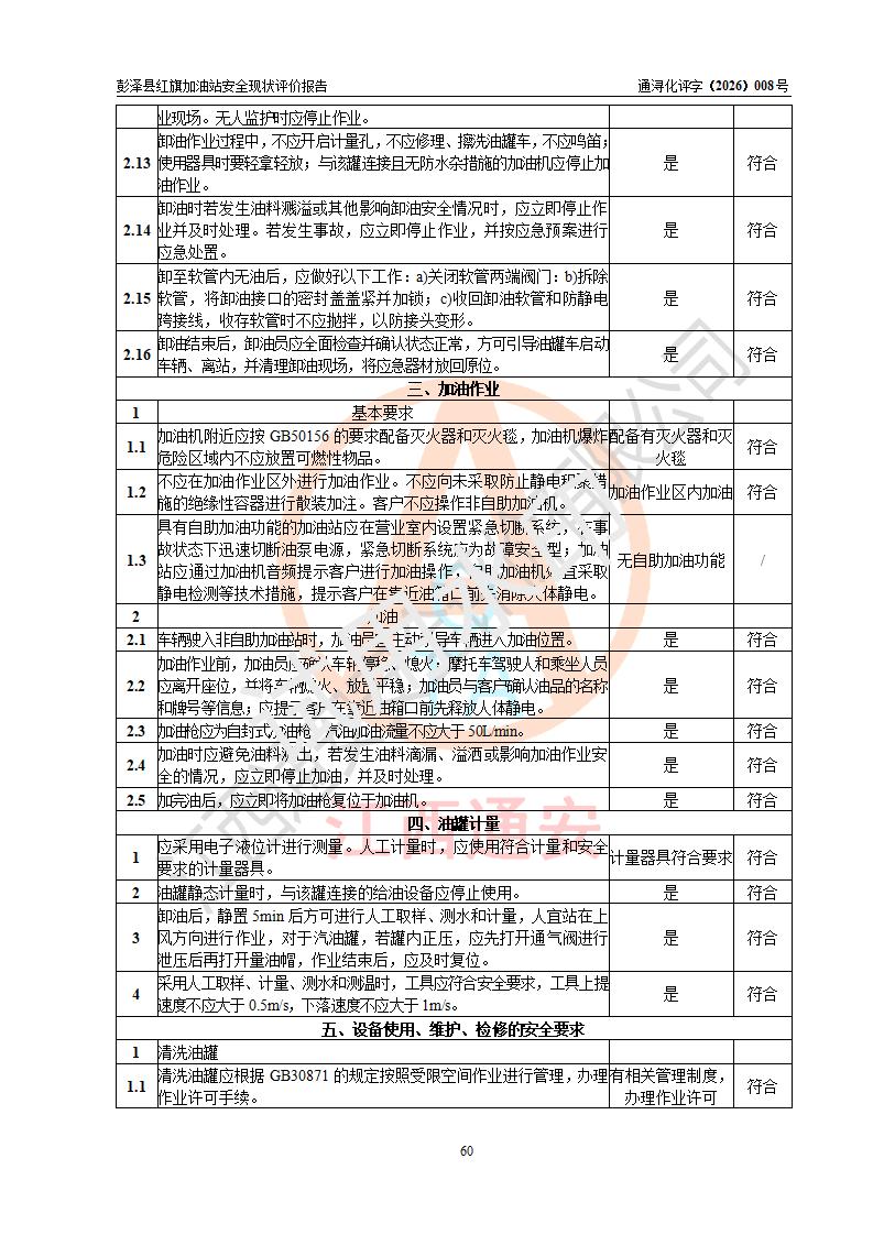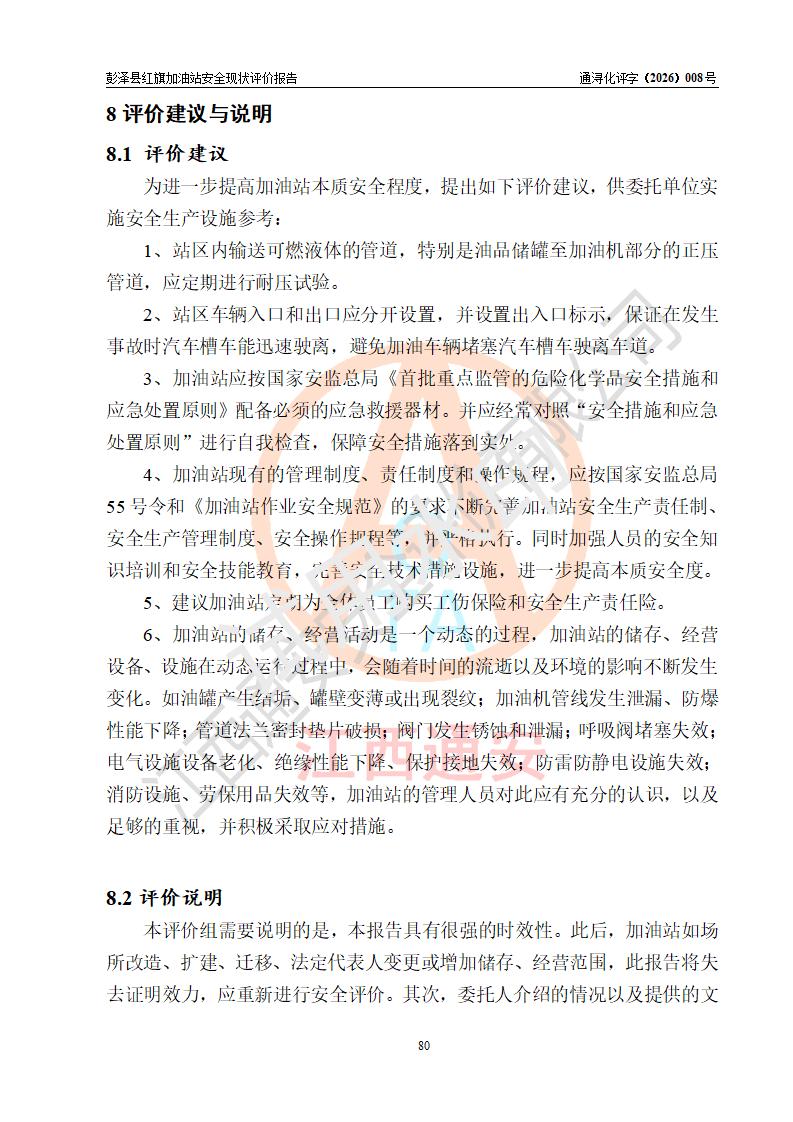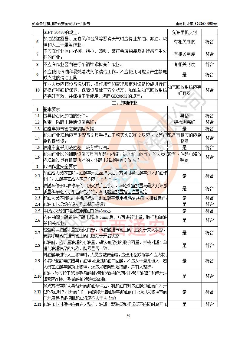 评价结论 | 彭泽县红旗加油站涉及的安全条件、安全经营条件、安全生产管理符合《危险化学品经营许可证管理办法》、《汽车加油加气加氢站技术标准》等**有关法规、标准、规范要求,能满足危险化学品经营安全条件。 | |||