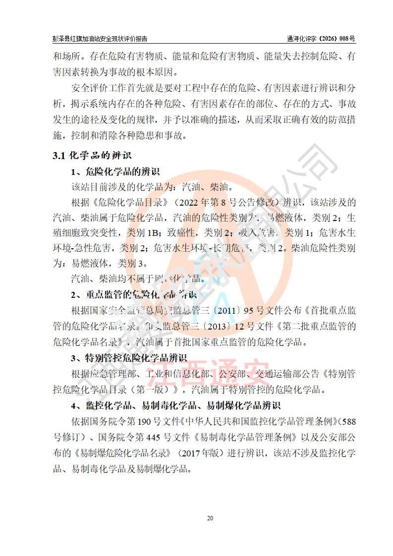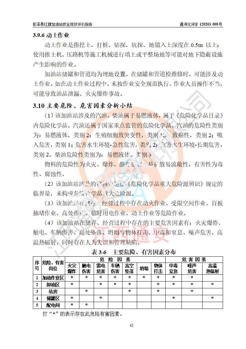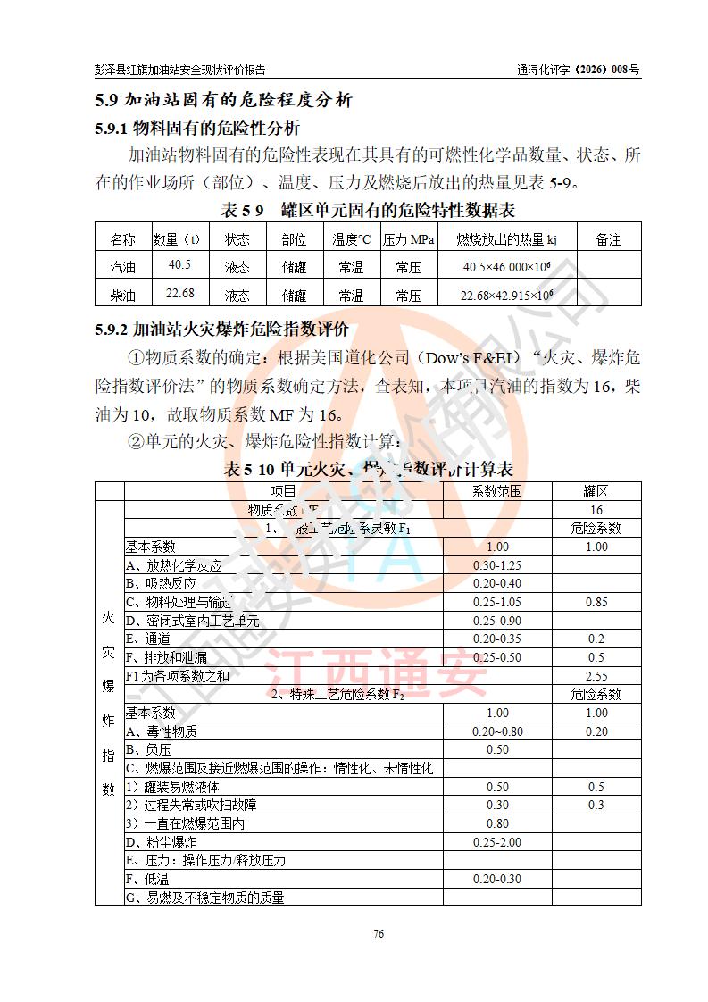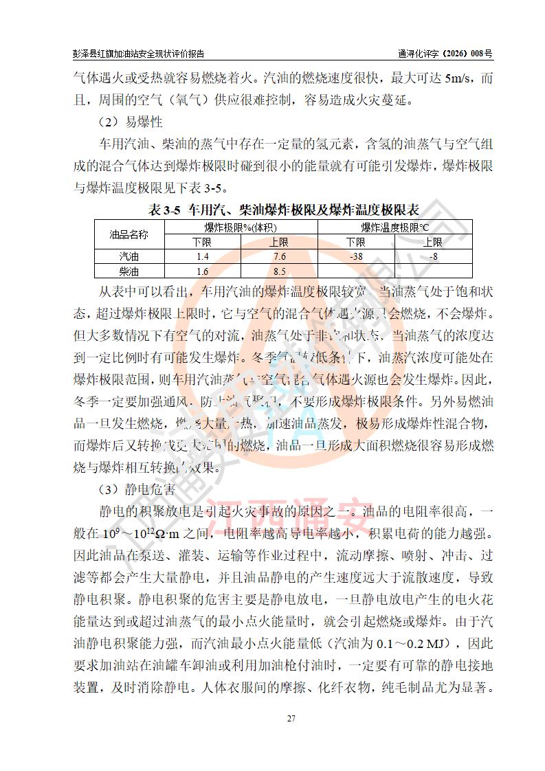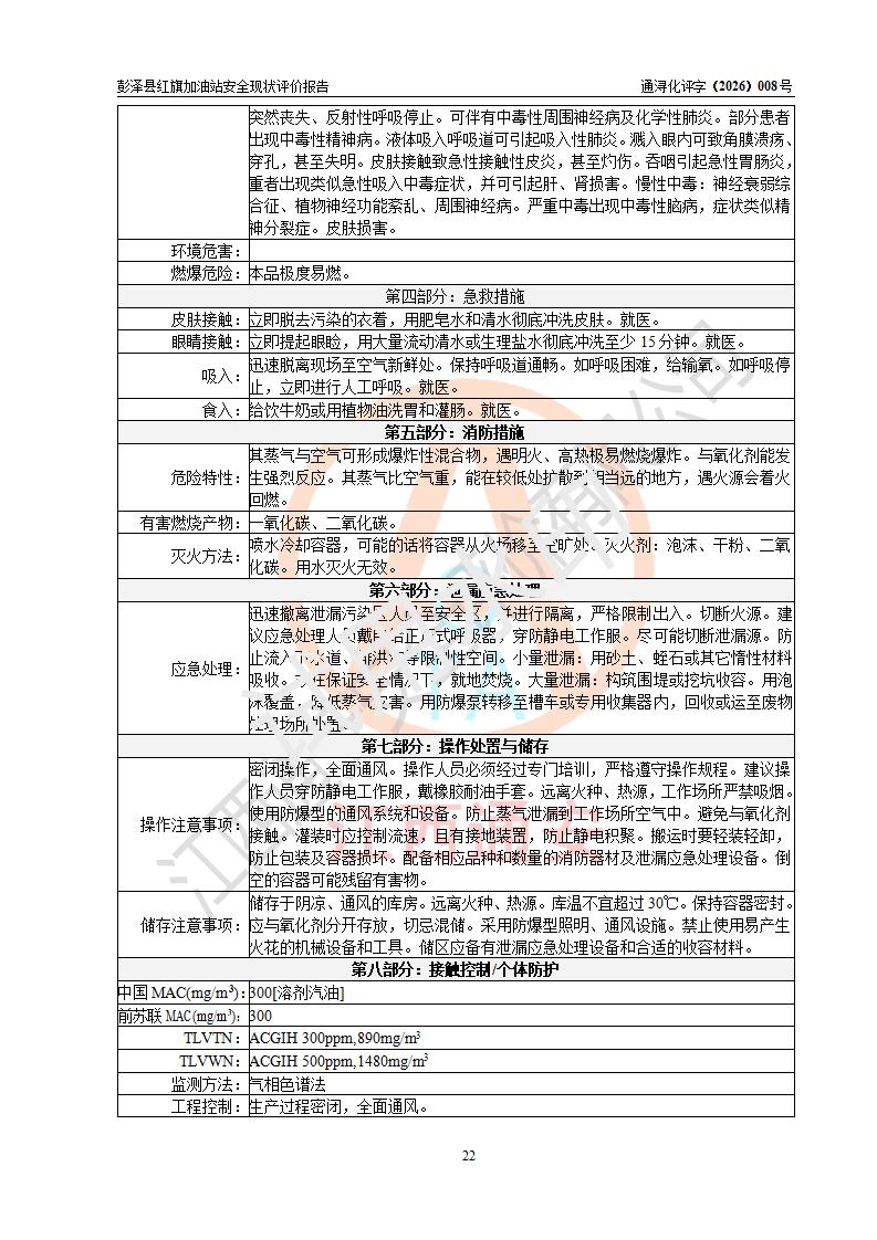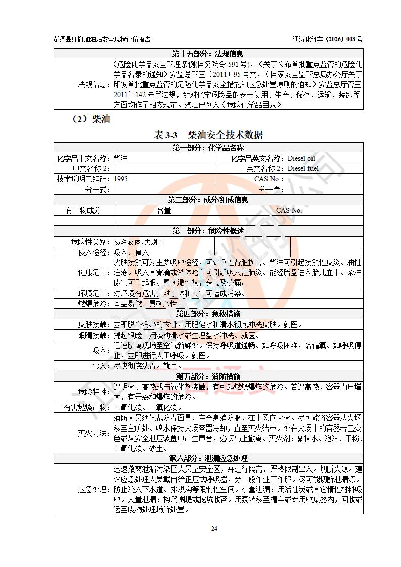 评价结论 | 彭泽县红旗加油站涉及的安全条件、安全经营条件、安全生产管理符合《危险化学品经营许可证管理办法》、《汽车加油加气加氢站技术标准》等**有关法规、标准、规范要求,能满足危险化学品经营安全条件。 | |||