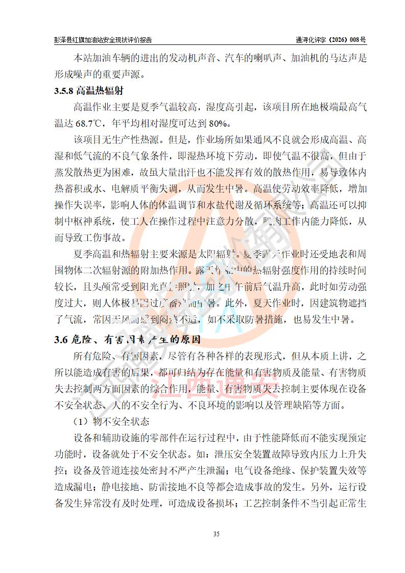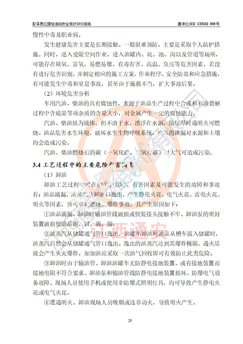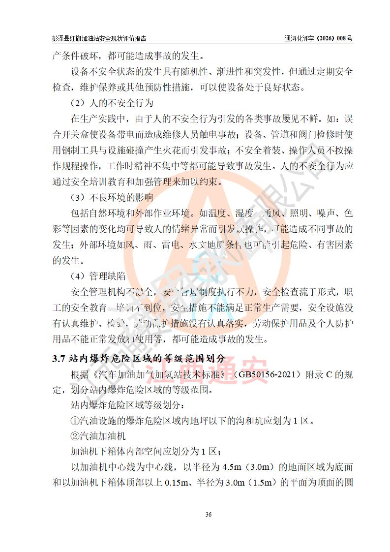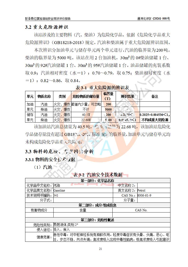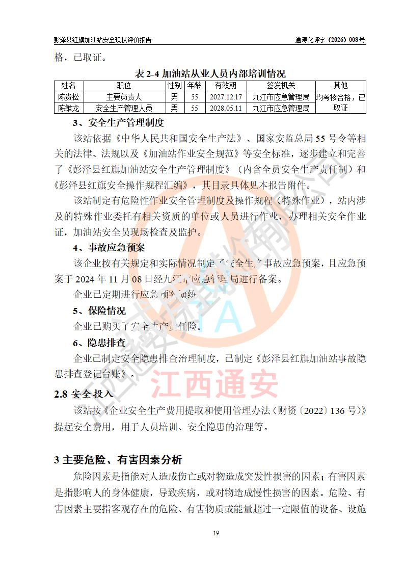 项目简介 | 彭泽县红旗加油站是一家专门从事成品油零售经营的个体工商户,经营场所位于江西省九江市彭泽县杨梓镇红旗村。现有从业人员3名,其中安全管理人员1人,加油站负责人陈贵松。 该加油站占地面积为1376.2m2,站区内设置有2台双枪程控燃油加油机及配套的工艺管线,设有SF双层储罐3台,其中30m3的0#柴油储罐1台、30m3的92#汽油储罐1台、30m3的95#汽油储罐1台,油品储罐总容积为90m3(折算成汽油为75m3),按现行《汽车加油加气加氢站技术标准》对加油站的等级划分原则,属三级加油站。 该站由九江市行政审批局换发《危险化学品经营许可证》(证号:赣九行审经(甲)字[2023]000016号),**期限2023年04月18日至2026年04月17日。 | |||