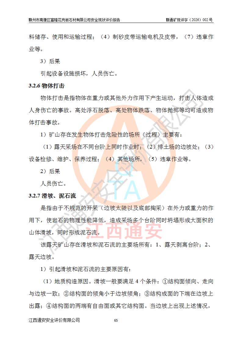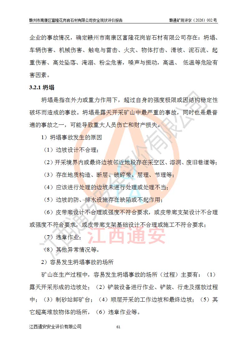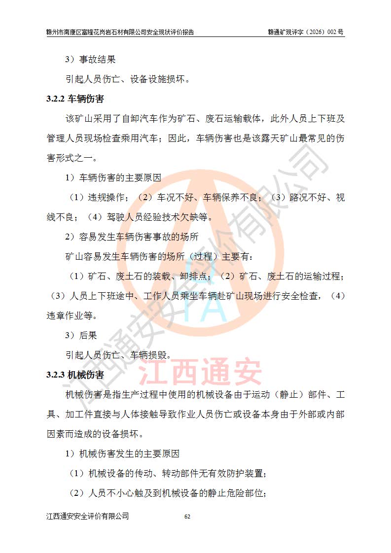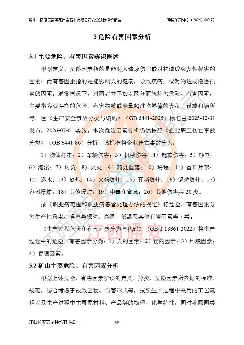 其它 | 1、该评价项目中存在的主要危险因素:坍塌、**伤害、机械伤害、触电与雷击、火灾、物体打击、滑坡、泥石流、起重伤害、高处坠落、淹溺等。 2、该评价项目中存在的有害因素包括:粉尘、噪声与振动、高温、 低温等危险有害因素、雷击对矿山人员的伤害和其他不利的环境因素等。 3、该评价项目为非金属露天矿山,无瓦斯和自燃发火危险,矿区范围内及周边无较大水系,矿区水文地质条件简单。该评价项目只是对闪长岩进行露天开采,不使用有毒有害危险化学品药剂,该评价项目不涉及危险物品。该评价项目不使用的压力容器为空压机储气罐。综合上述分析,本评价项目不存在重大危险源。 上述主要危险、有害因素在采取本报告第六章中提出的安全对策措施及建议后,能得到**控制。该项目从安全生产角度符合**有关安全生产法律、法规、规章和技术标准的要求;矿山露天开采按照《开采方案设计》组织生产,符合《开采方案设计》要求,具备安全生产条件。 | ||||