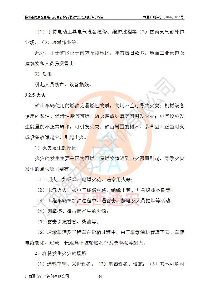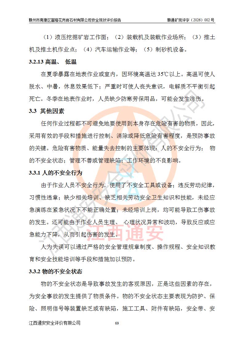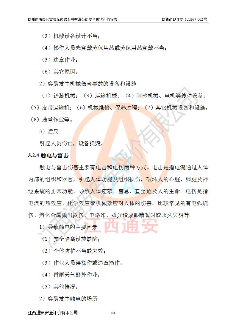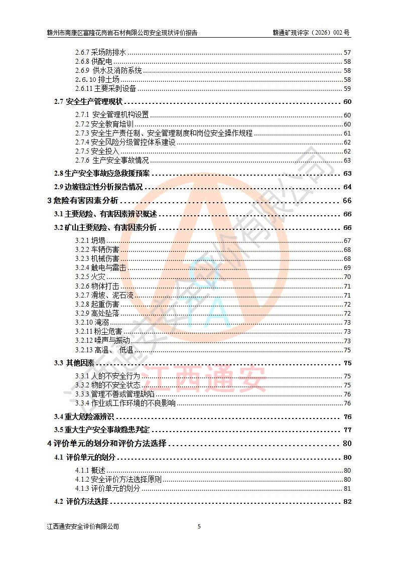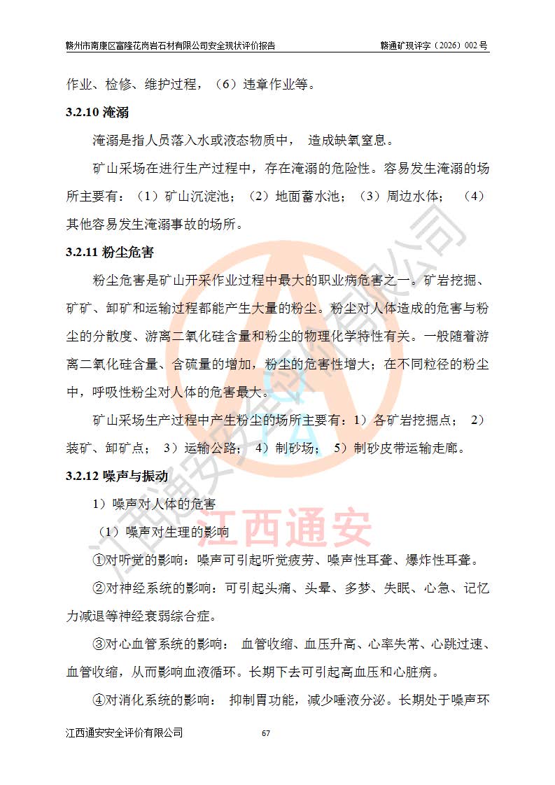 其它 | 1、该评价项目中存在的主要危险因素:坍塌、**伤害、机械伤害、触电与雷击、火灾、物体打击、滑坡、泥石流、起重伤害、高处坠落、淹溺等。 2、该评价项目中存在的有害因素包括:粉尘、噪声与振动、高温、 低温等危险有害因素、雷击对矿山人员的伤害和其他不利的环境因素等。 3、该评价项目为非金属露天矿山,无瓦斯和自燃发火危险,矿区范围内及周边无较大水系,矿区水文地质条件简单。该评价项目只是对闪长岩进行露天开采,不使用有毒有害危险化学品药剂,该评价项目不涉及危险物品。该评价项目不使用的压力容器为空压机储气罐。综合上述分析,本评价项目不存在重大危险源。 上述主要危险、有害因素在采取本报告第六章中提出的安全对策措施及建议后,能得到**控制。该项目从安全生产角度符合**有关安全生产法律、法规、规章和技术标准的要求;矿山露天开采按照《开采方案设计》组织生产,符合《开采方案设计》要求,具备安全生产条件。 | ||||