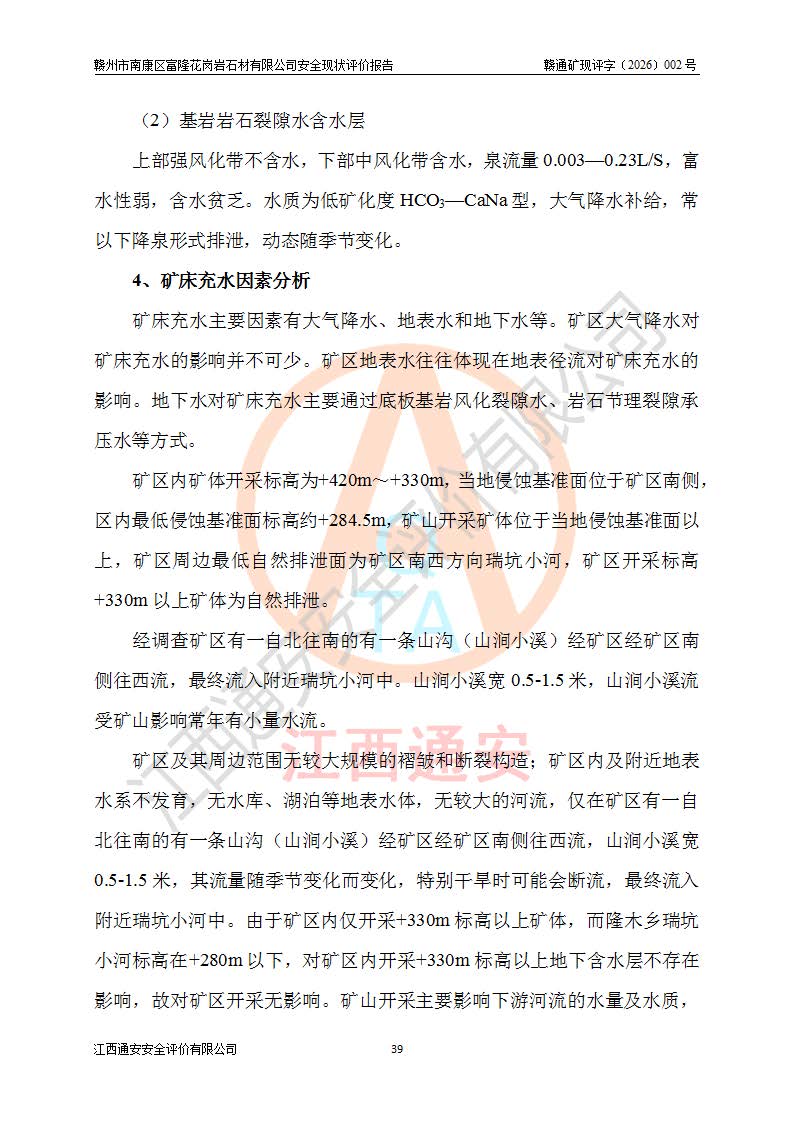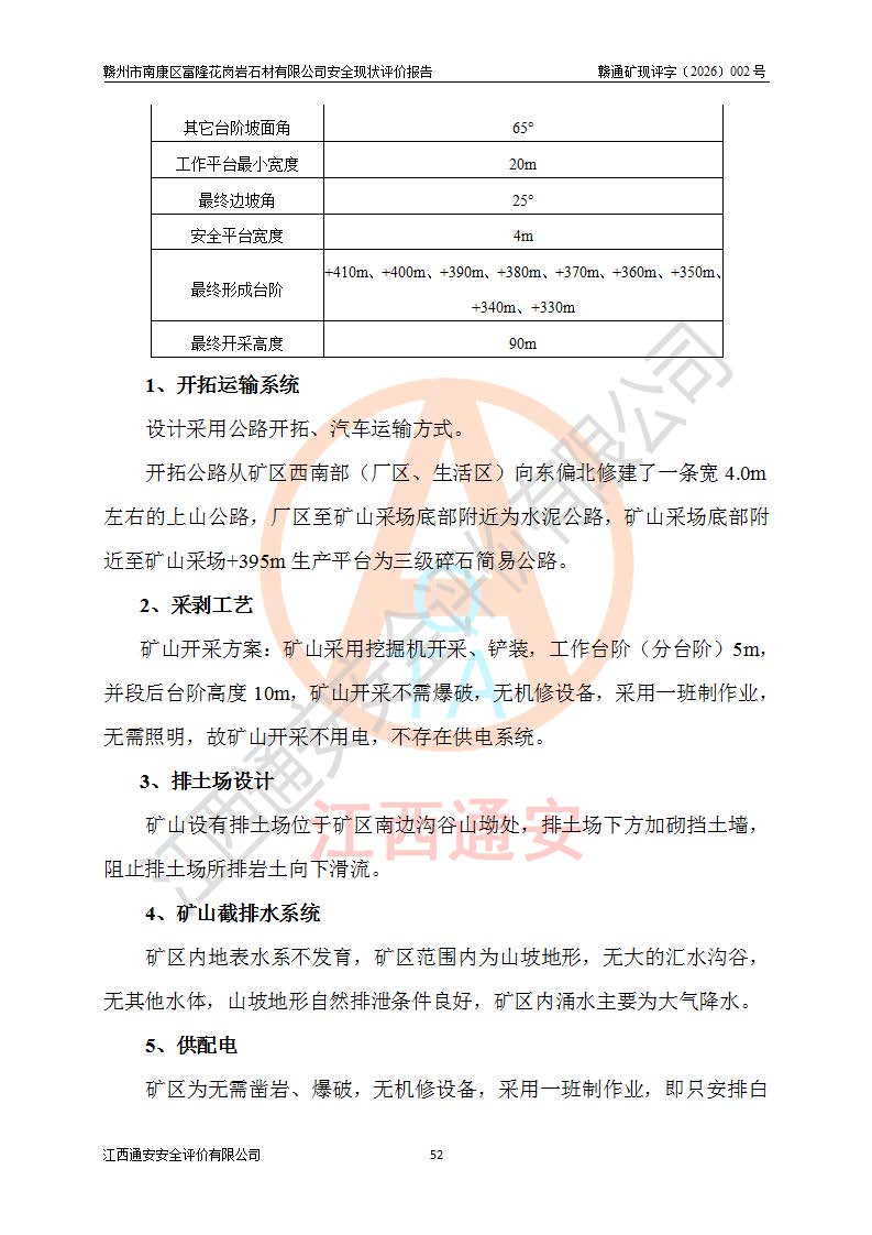 项目简介 | 赣州市南康区富隆花岗岩石材有限公司,矿区位于南康城区北约68**处,距隆木乡**5**,矿区中心点地理坐标为东经东经114°35′19″~114°35′37″;北纬26°13′33″~26°13′47″;矿区行政区划隶属于南康区隆木乡管辖;矿山内有简易公路通行,南侧与S226省道相连接,交通较为便利。 矿山采用公路开拓、汽车运输方式。矿区大门紧连S226省道,矿区运输道路自226省道进入矿区至矿山采场约500m,其中约350m为浇砼公路,宽约3.5m;近采场段和进入采场的道路为单车道三级道路,为泥结碎石路面,宽约3.5~4.5m,道路*大纵坡≤10%,*小转弯半径≮15m,运输公路外侧堆置了公路车挡(护坡),坡度较大的地段和弯道处设置了安全警示标志等相应的措施。公路坡度、公路*小曲线半径符合《开采方案设计》要求。 矿山按照《开采方案设计》进行开采,矿区内已形成一个露天采场,近东南与西北长300m,近南西与北东宽100m的采场,早期开采采场自上而下形成:+410m、+400m、+390m、+380m、+370m共5个开采台阶,*大开采边坡**约50m。现开采采场自上而下形成:+410m、+400m、+395m生产平台(并段后为390m平台);其中+410m、已形成终了边坡,平台宽4m,台阶**10m(剥离台阶**约6m至10m),台阶坡面角约65°。+390m、+380m、+370m台阶为早期开采留下的平台(台阶**5m-12m不等),现生产地点为采场北侧+395m生产台阶(并段后为390m平台)开采,上下台阶衔接道路为开拓运输道路,采场安全平台宽4m,工作台阶5m,并段后台阶**10m,台阶坡面角约65°;矿山开采符合《安全设施设计》要求。 矿山于2024年3月13日,矿山取得赣州市应急管理局颁发的安全生产标准化三级企业(非煤矿山)证书,证书编号:赣市AQBKSⅢ[2024]07号,**期至2027年3月12日。 | ||||