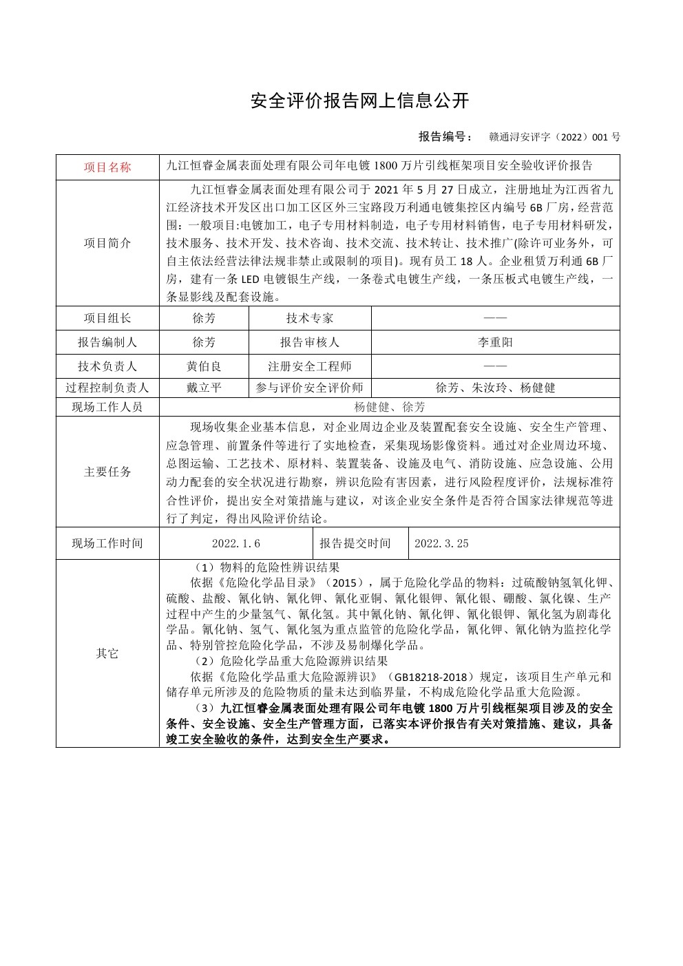 九江恒睿金属表面处理有限公司年电镀1800万片引线框架项目安全验收评价报告