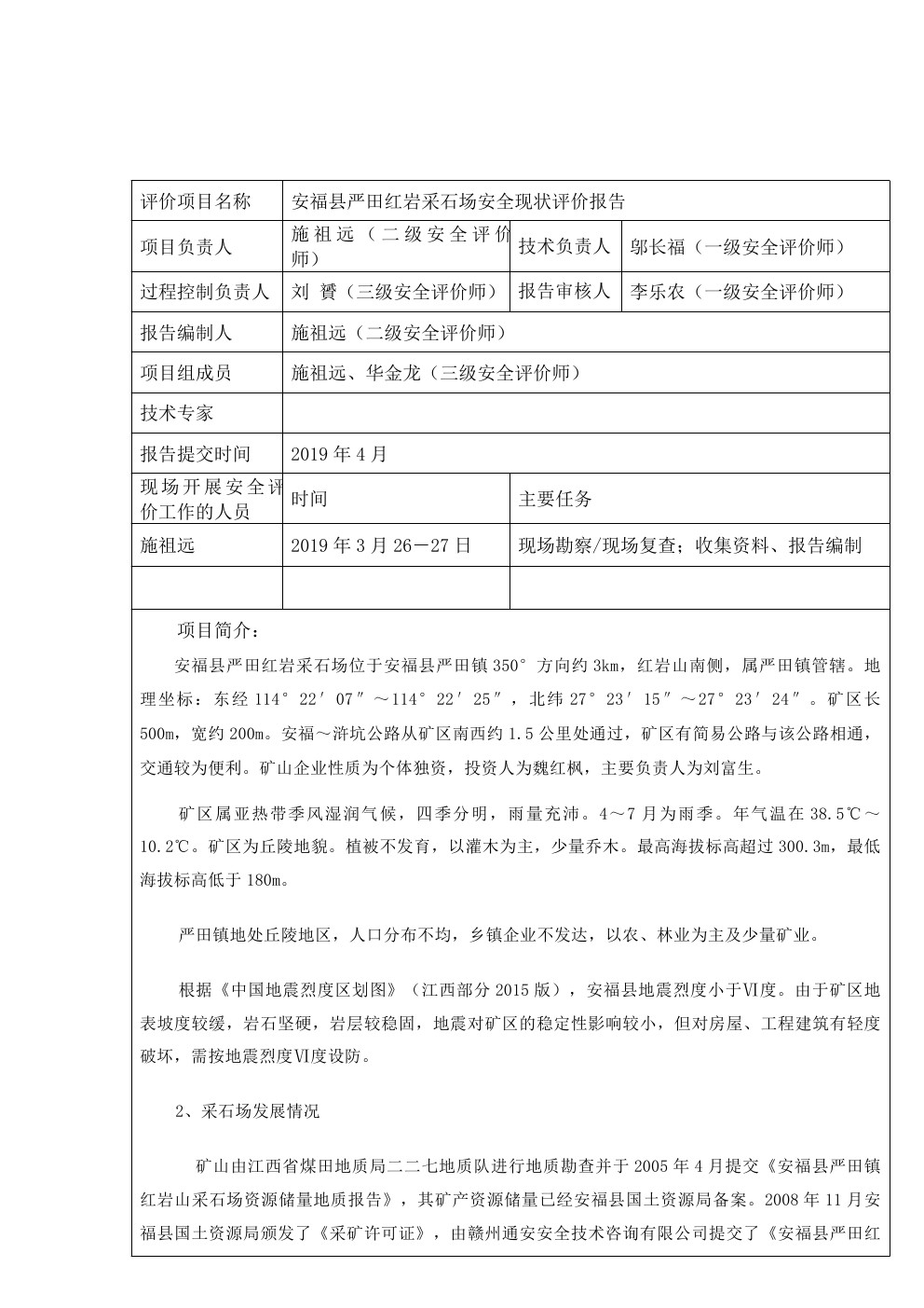 安福县严田红岩采石场安全现状评价报告