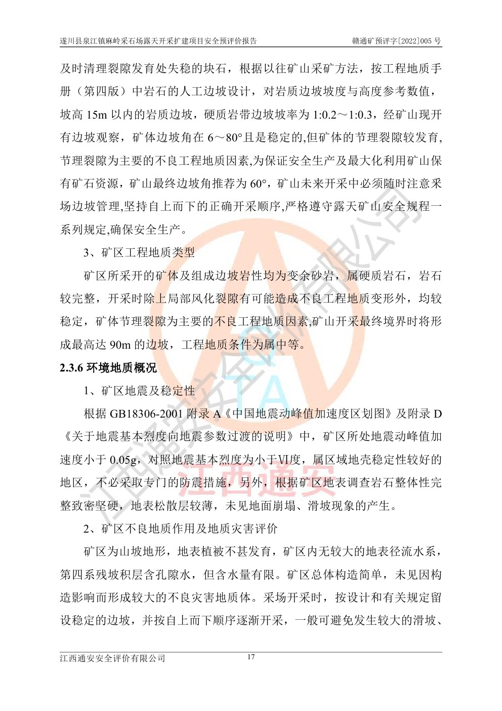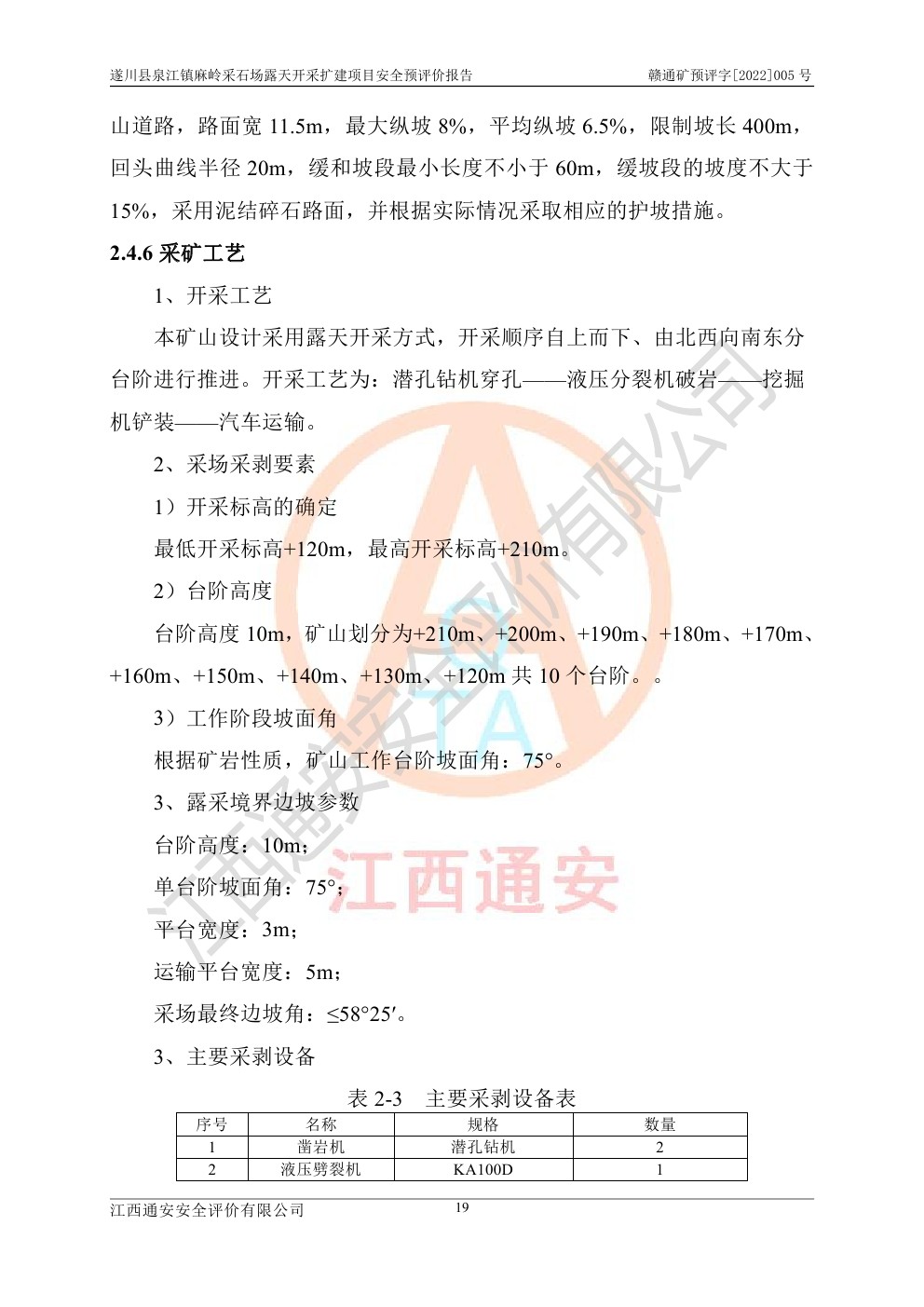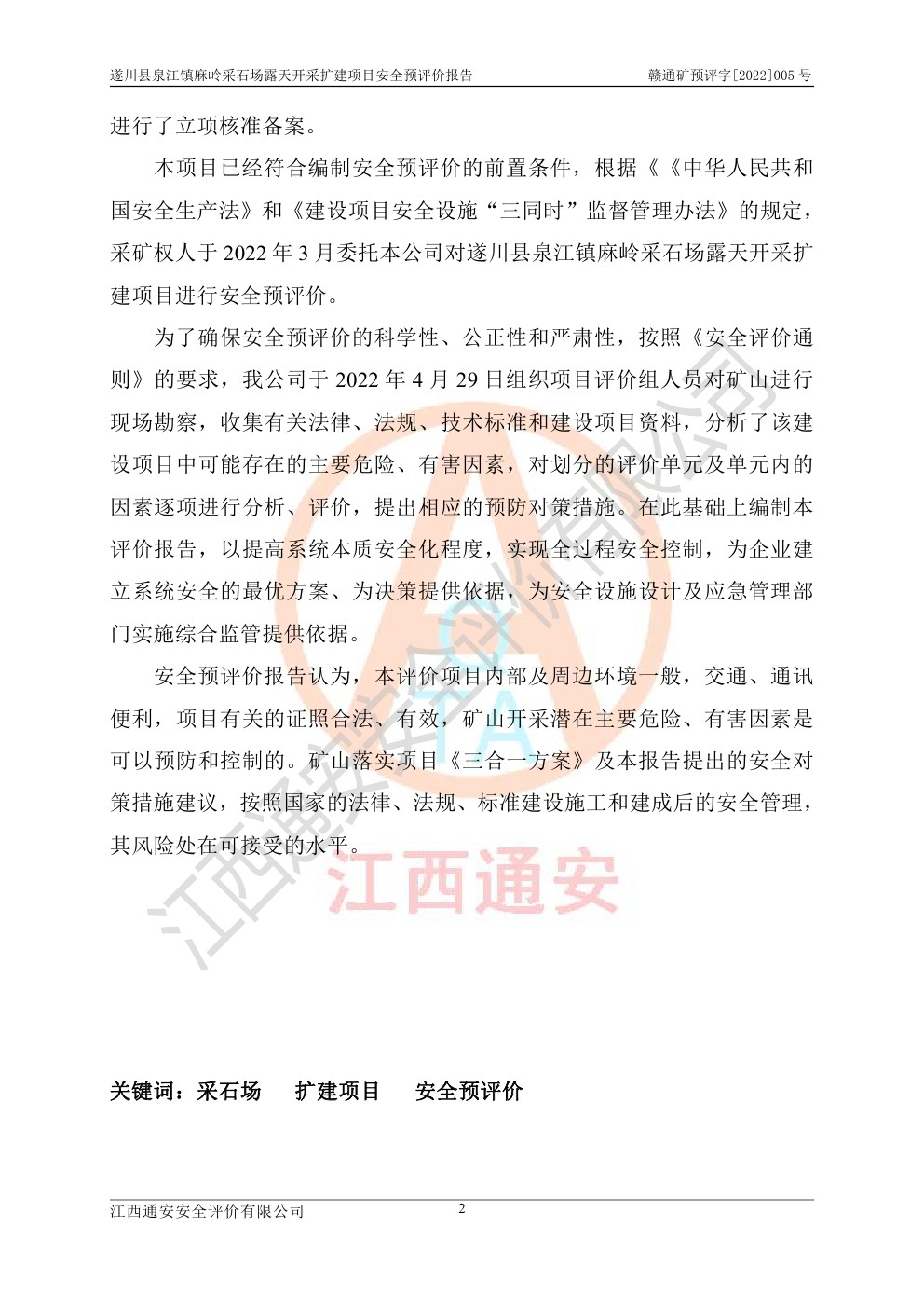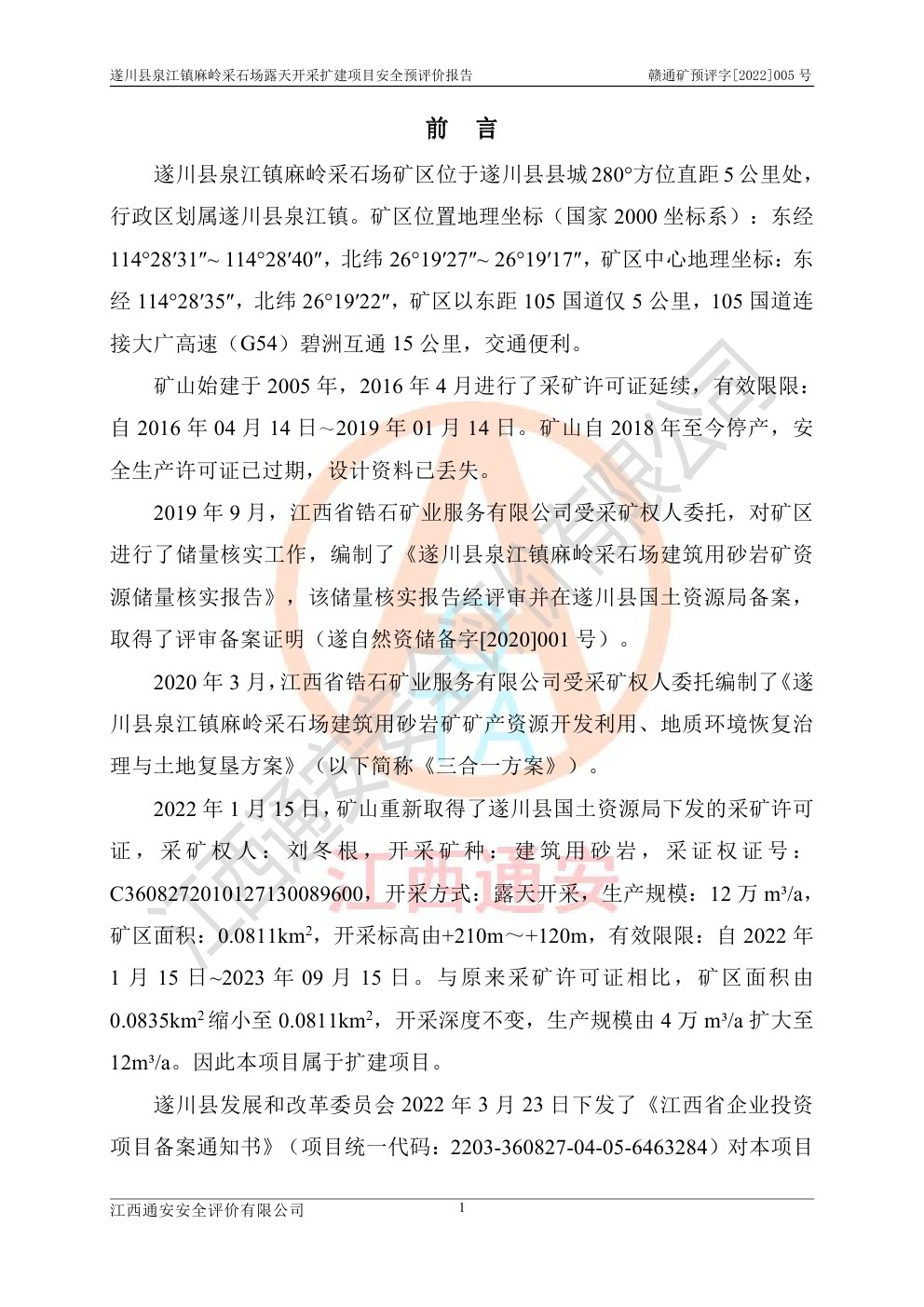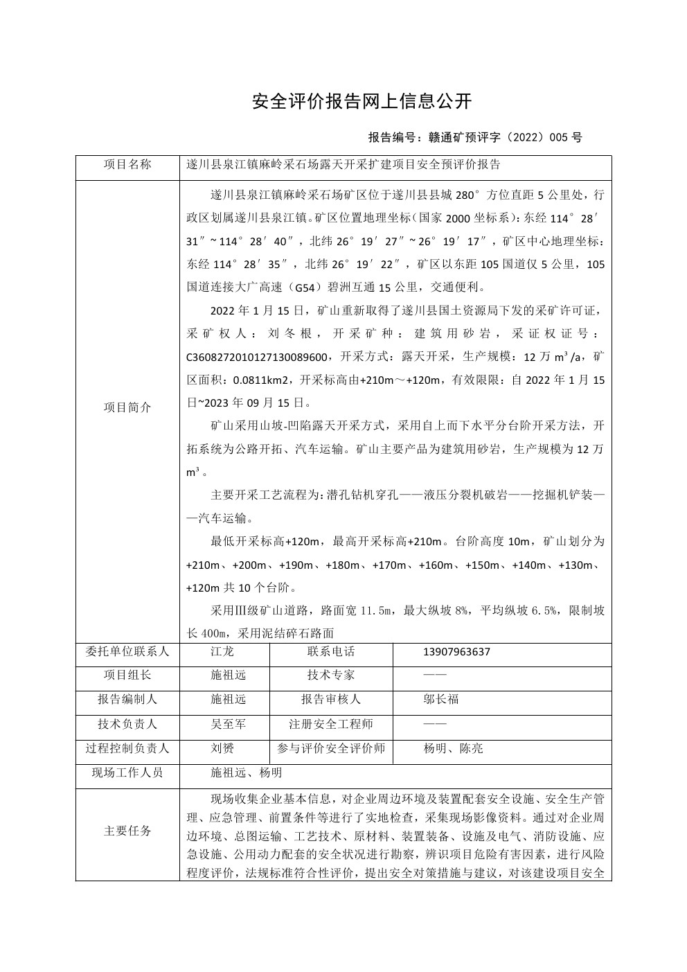 遂川县泉江镇麻岭采石场露天开采扩建项目安全预评价报告