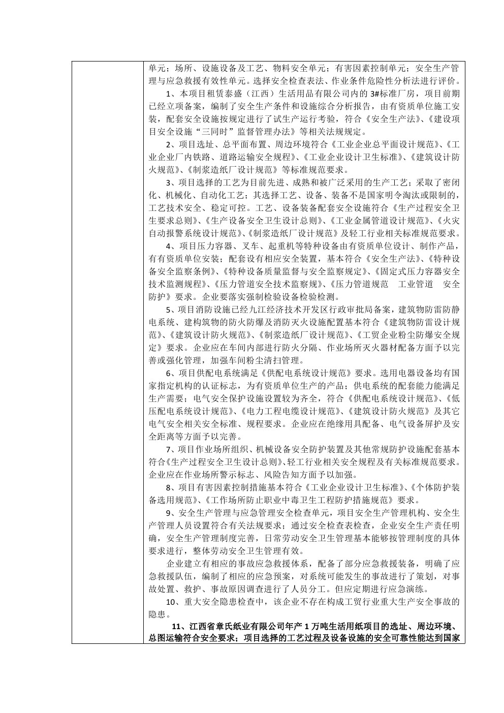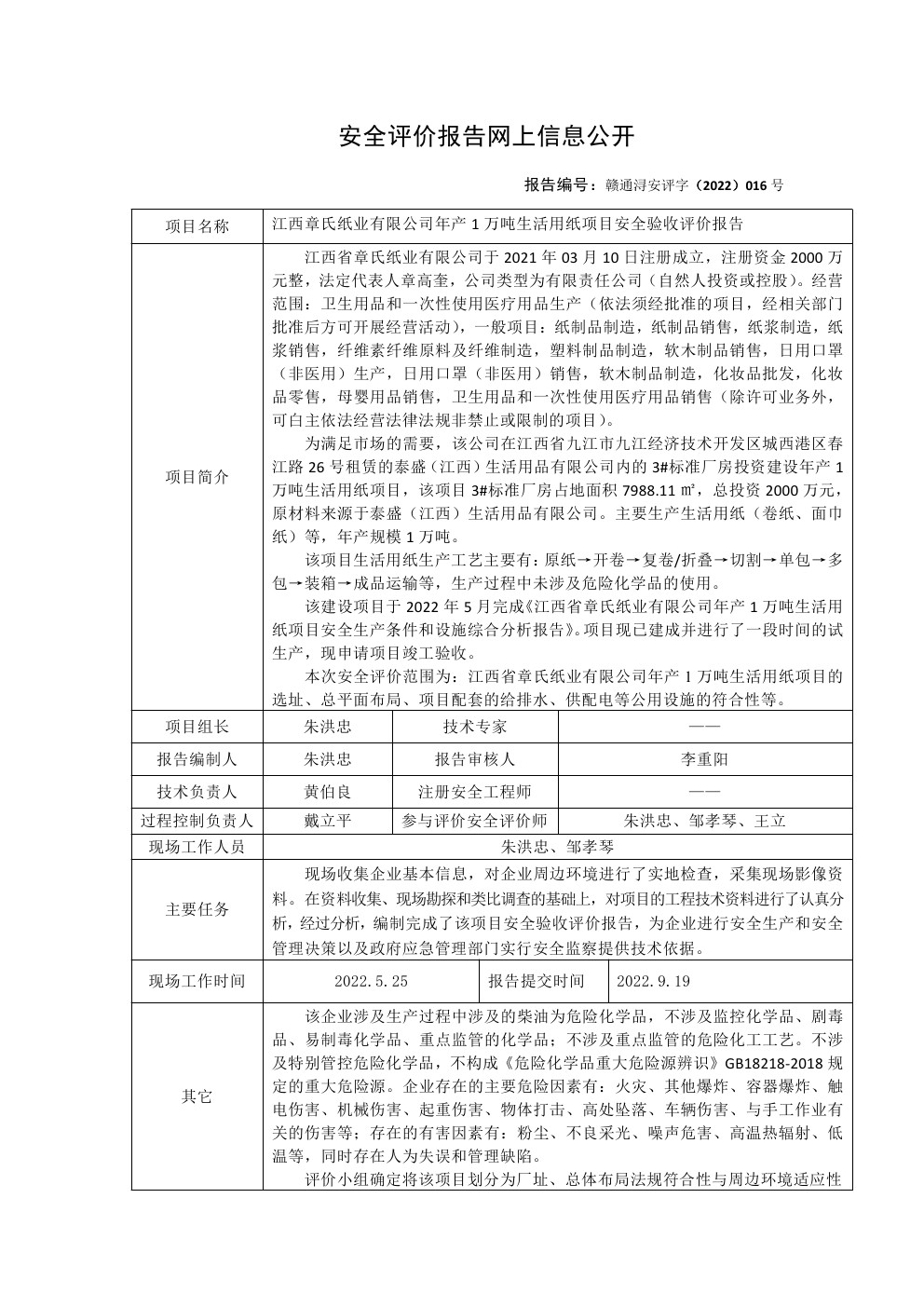 江西章氏纸业有限公司年产1万吨生活用纸项目安全验收评价报告