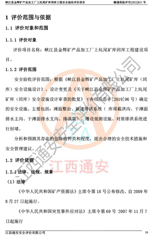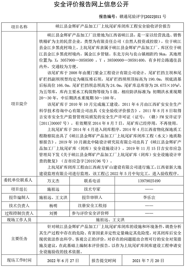 峡江县金辉矿产品加工厂上坑尾矿库闭库工程安全验收评价报告