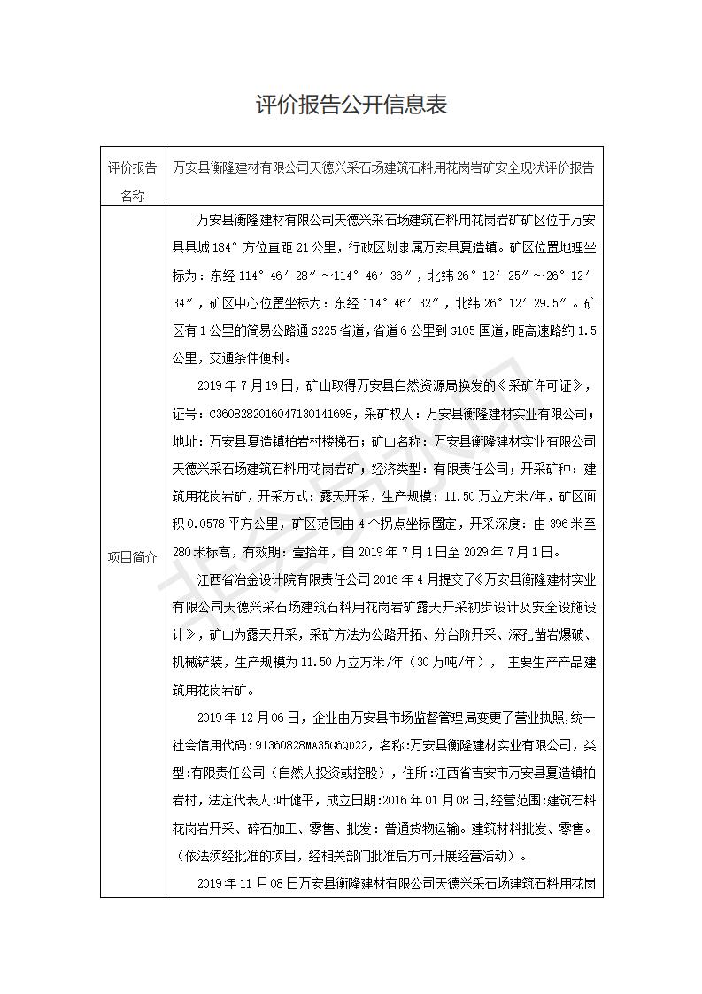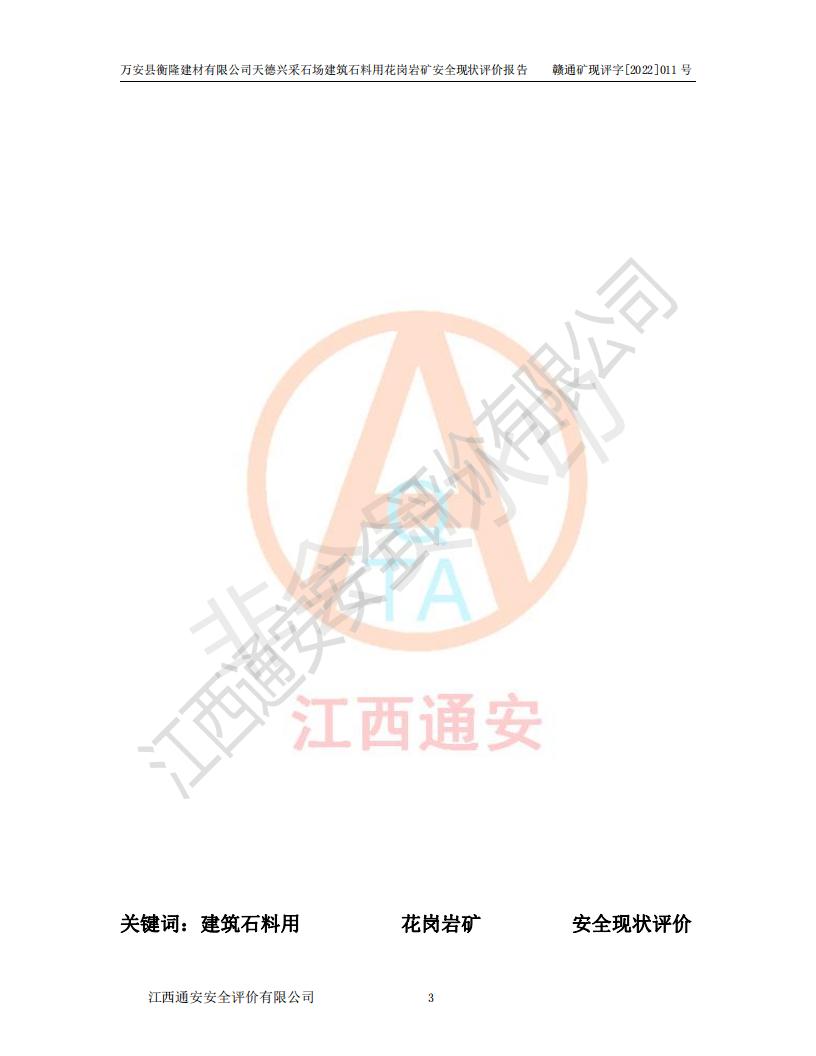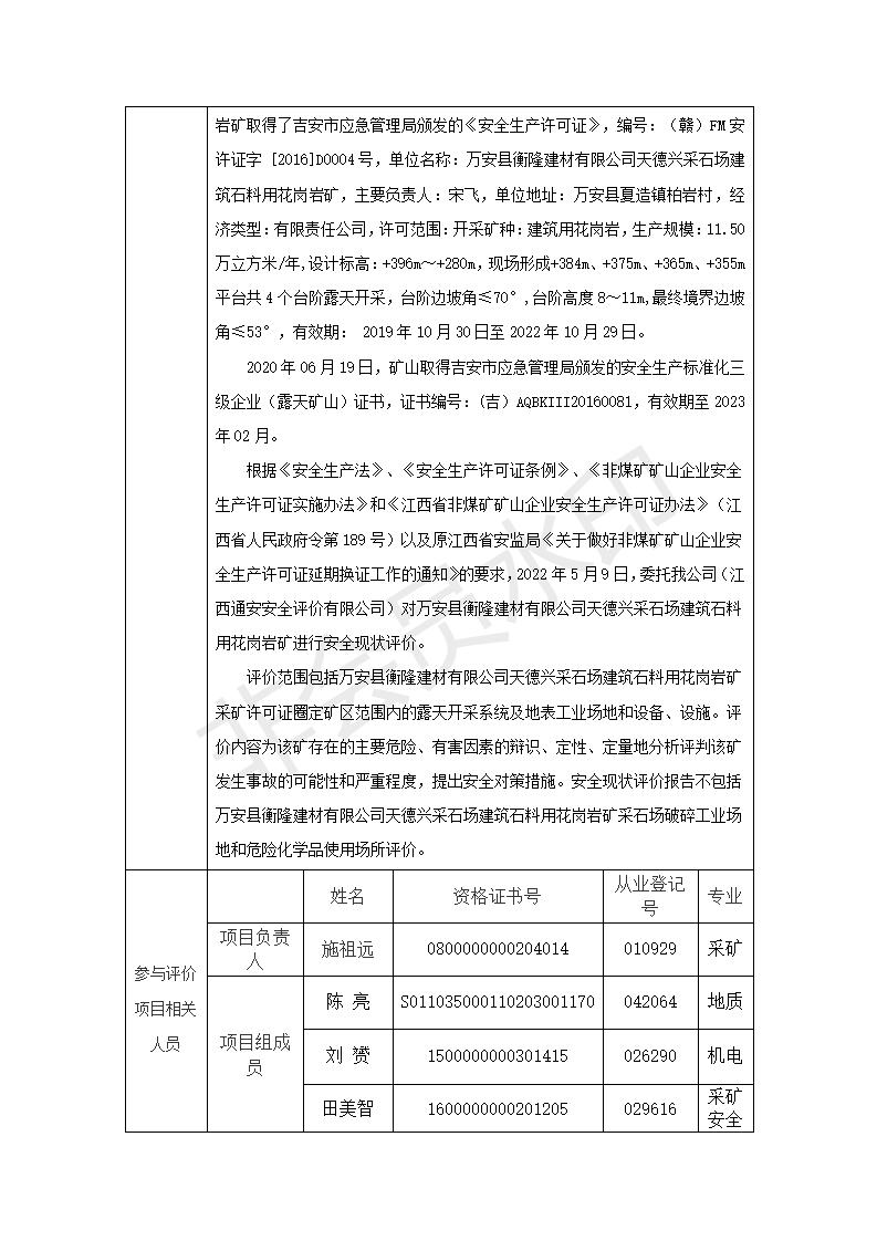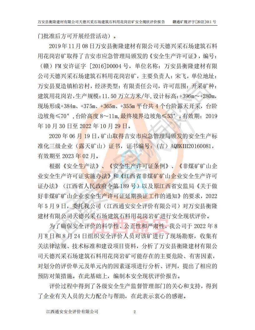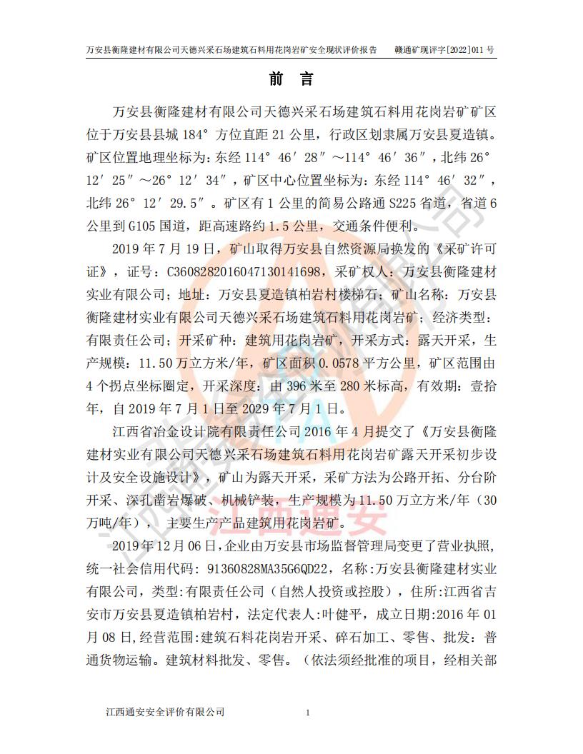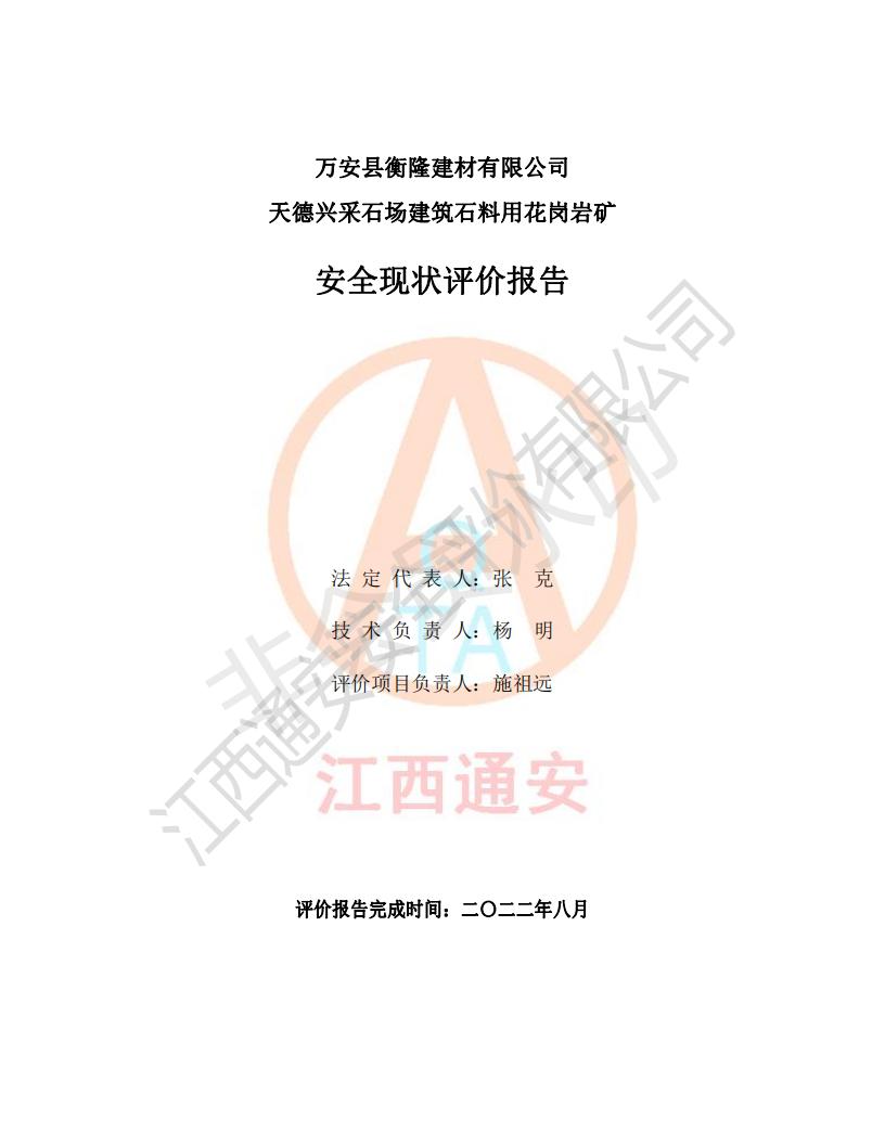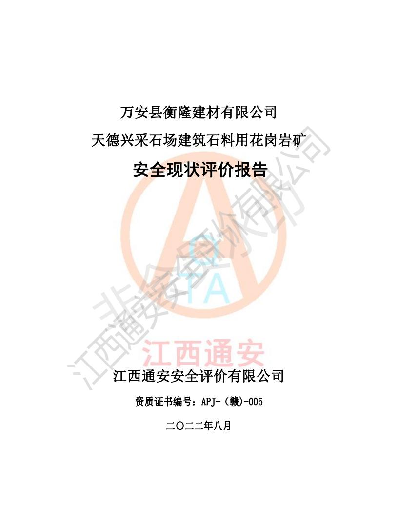 万安县衡隆建材有限公司天德兴采石场建筑石料用花岗岩矿安全现状评价报告