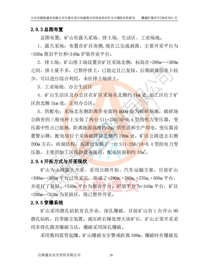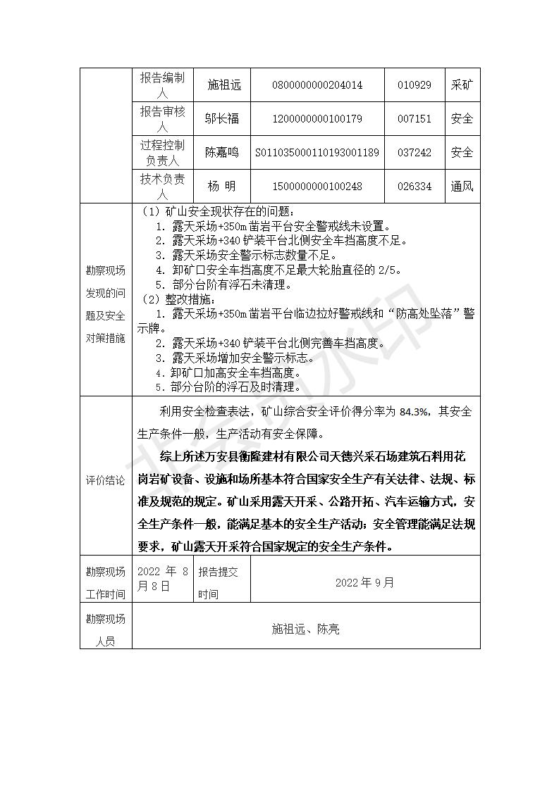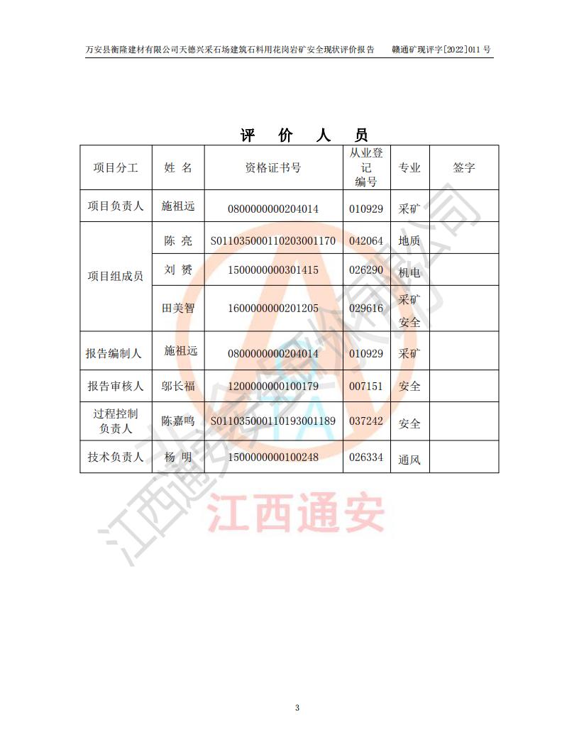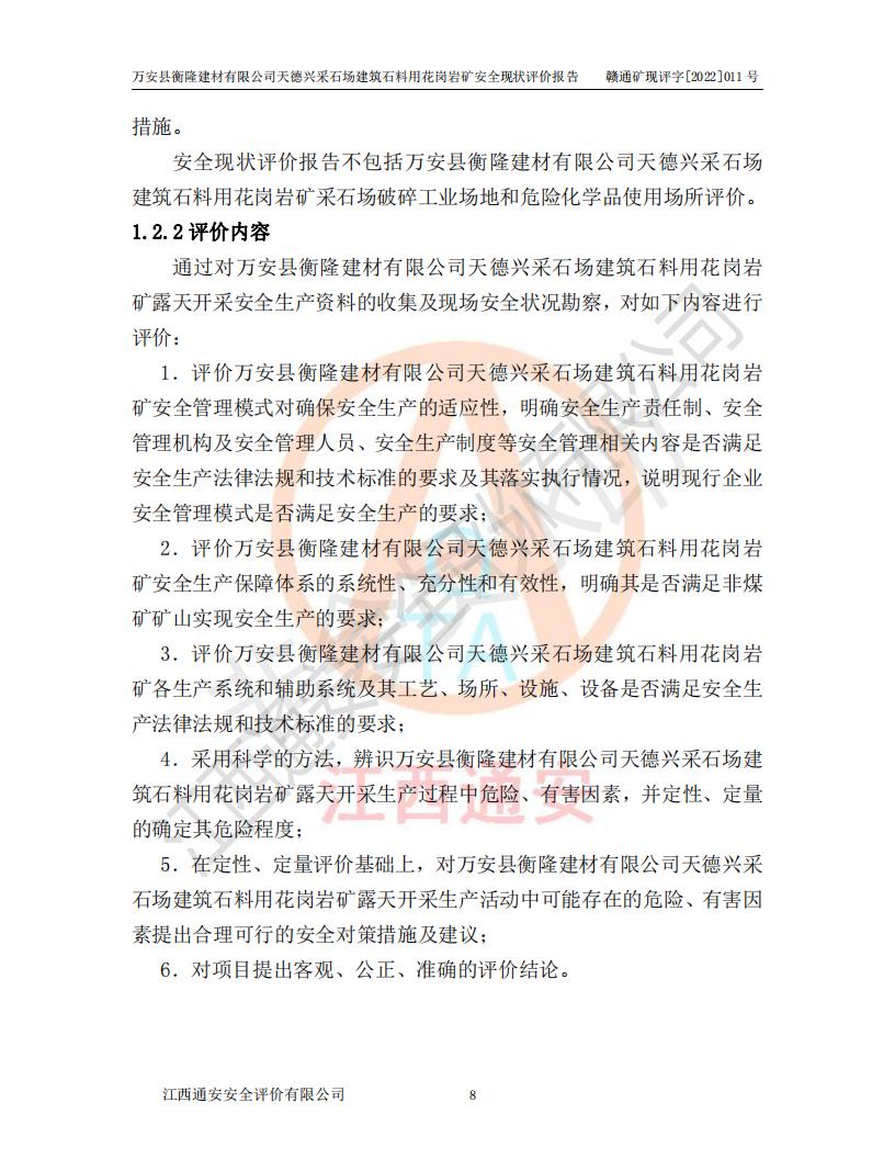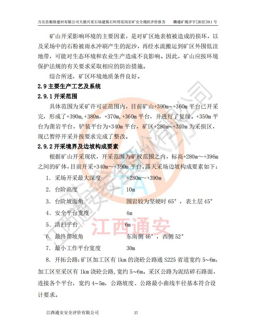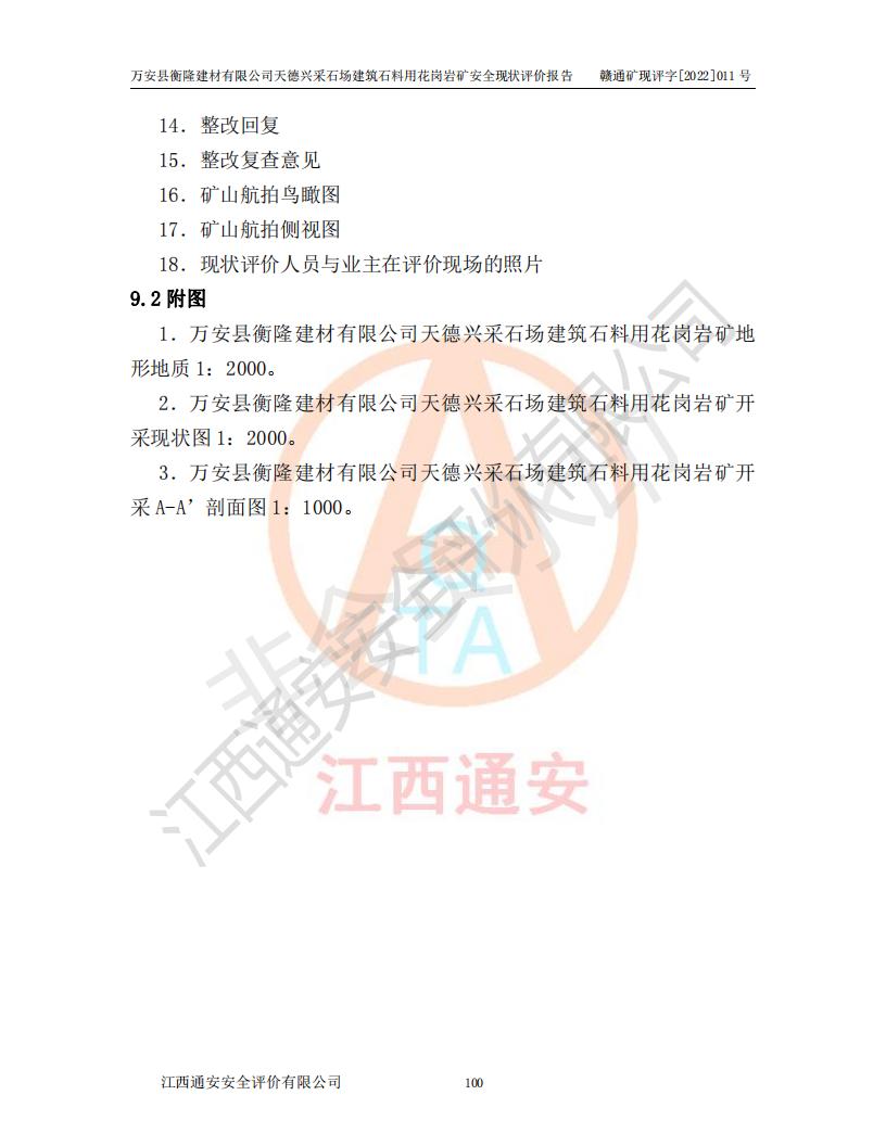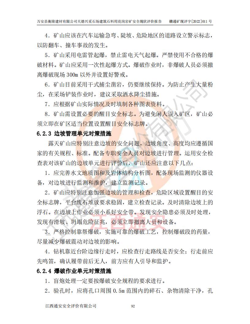 万安县衡隆建材有限公司天德兴采石场建筑石料用花岗岩矿安全现状评价报告