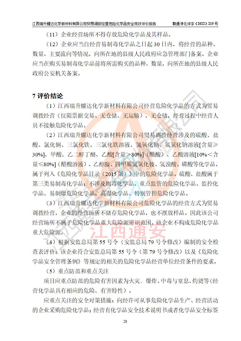 评价结论 | 江西瑞升耀达化学新材料有限公司贸易调拨经营危险化学品的安全条件符合**有关法规、标准、规范要求,落实评价报告有关建议后,风险可控,具备危险化学品经营安全条件。 | |||