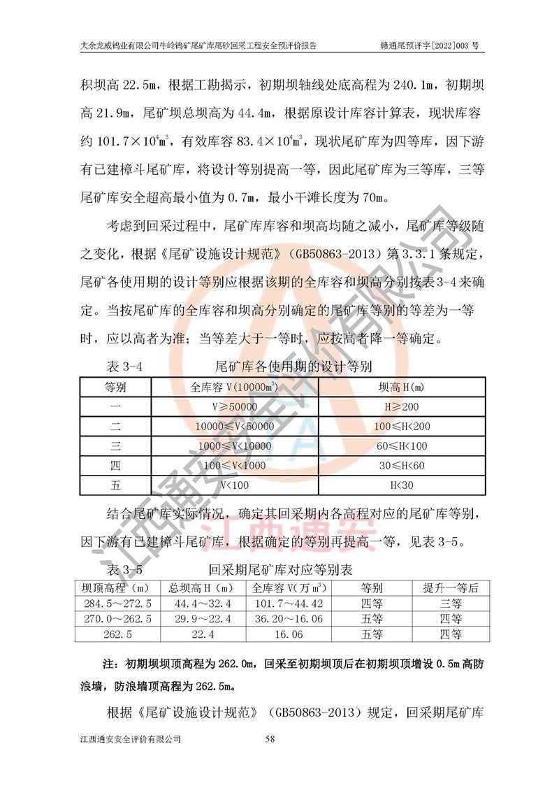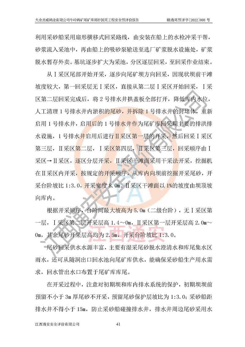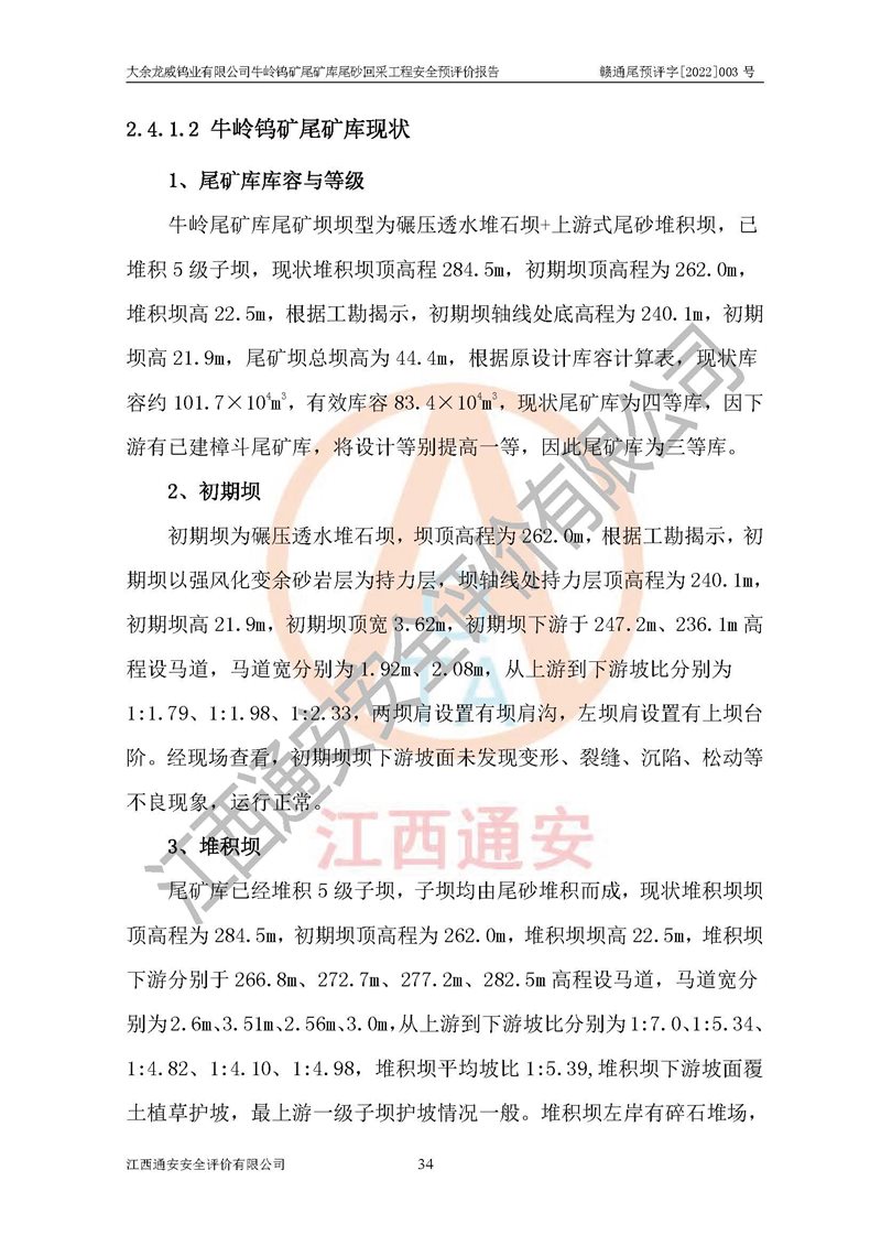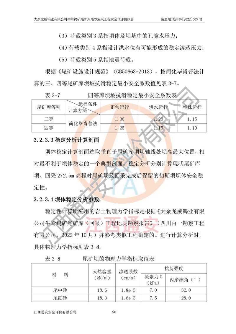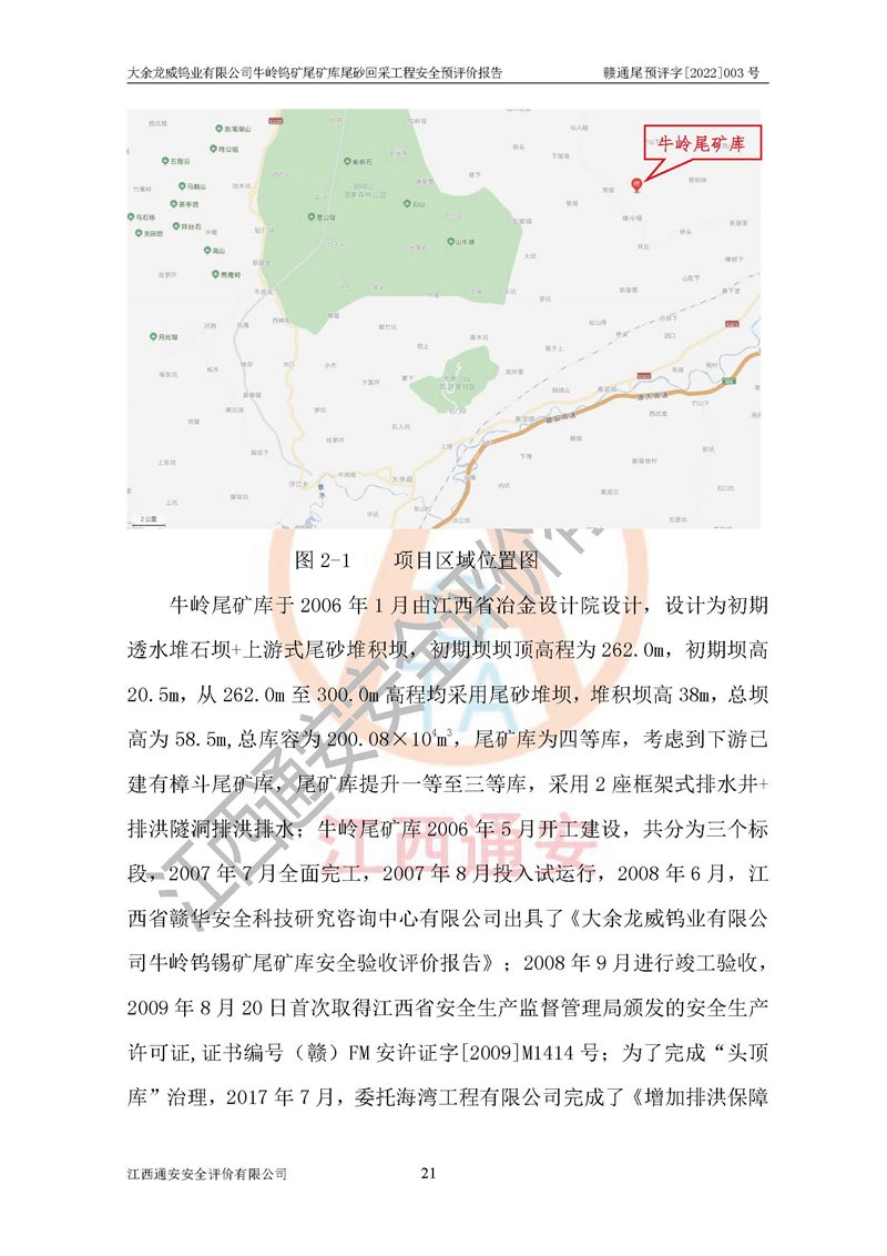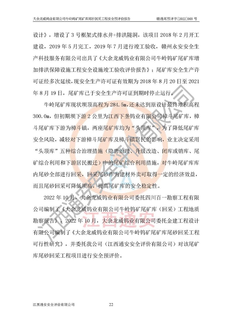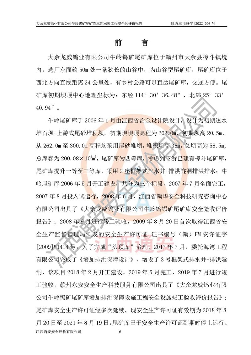 牛岭尾矿库于2006年1月由江西省冶金设计院设计,设计为初期透水堆石坝+上游式尾砂堆积坝,初期坝坝顶高程为262.0m,初期坝高20.5m,从262.0m至300.0m高程均采用尾砂堆坝,堆积坝高38m,总坝高为58.5m,总库容为200.08×104m3,尾矿库为四等库,考虑到下游已建有樟斗尾矿库,尾矿库提升一等至三等库,采用2座框架式排水井+排洪隧洞排洪排水;牛岭尾矿库2006年5月开工建设,共分为三个标段,2007年7月全面完工,2007年8月投入试运行,2008年6月,江西省赣华安全科技研究咨询中心有限公司出具了《大余龙威钨业有限公司牛岭钨锡矿尾矿库安全验收评价报告》;2008年9月进行竣工验收,2009年8月20日首次取得江西省安全生产监督管理局颁发的安全生产许可证,证书编号(赣)FM安许证字[2009]M1414号;为了完成“头顶库”治理,2017年7月,委托海湾工程有限公司完成了《增加排洪保障设计》,增设了3号框架式排水井+排洪隧洞,该项目2018年2月开工建设,2019年5月完工,2019年7月进行竣工验收,赣州永安安全生产科技服务有限公司出具了《大余龙威钨业有限公司牛岭钨矿尾矿库增加排洪保障设施工程安全设施竣工验收评价报告》;尾矿库安全生产许可证经多次延续,现安全生产许可证**期为2018年8月20日至2021年8月19日,尾矿库已于安全生产许可证到期时停止运行。 牛岭尾矿库现状坝顶高程为284.5m,还未达到原设计*终堆积高程300.0m,但初期坝下游2**为江西下垄钨业有限公司樟斗尾矿库,樟斗尾矿库下游为樟斗镇,两座尾矿库均为“头顶库”,为了降低尾矿库安全风险,减轻对下游樟斗尾矿库及樟斗镇居民的影响,大余龙威钨业有限公司决定采用“头顶库”五种综合治理措施(隐患治理、升级改造、闭库或销库、尾矿综合利用和下游居民搬迁)中的尾矿综合利用措施,对牛岭尾矿库库内尾砂**进行回采,回采尾砂作为建材外卖可取得**的经济效益,而且尾砂回采可降低坝高,提高尾矿库的安全稳定性。 2022年10月,大余龙威钨业有限公司委托四川百一勘察工程有限公司编制了《大余龙威钨业有限公司牛岭钨矿尾矿库(回采)工程地质勘察报告》,2022年10月,大余龙威钨业有限公司委托金建工程设计有限公司编制了《大余龙威钨业有限公司牛岭钨矿尾矿库尾砂回采工程可行性研究》,并委托我公司对该尾矿库尾砂回采工程项目进行安全预评价。 |