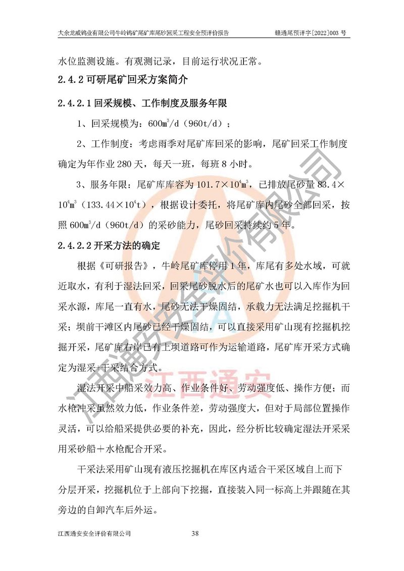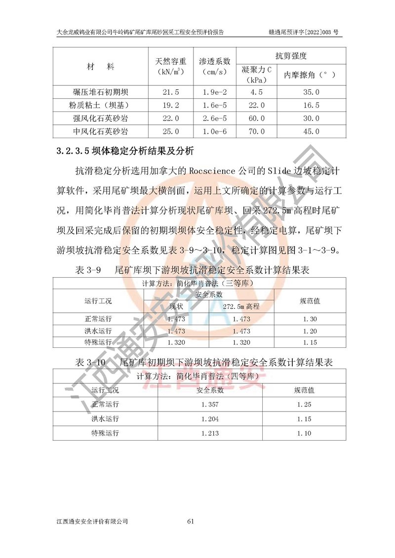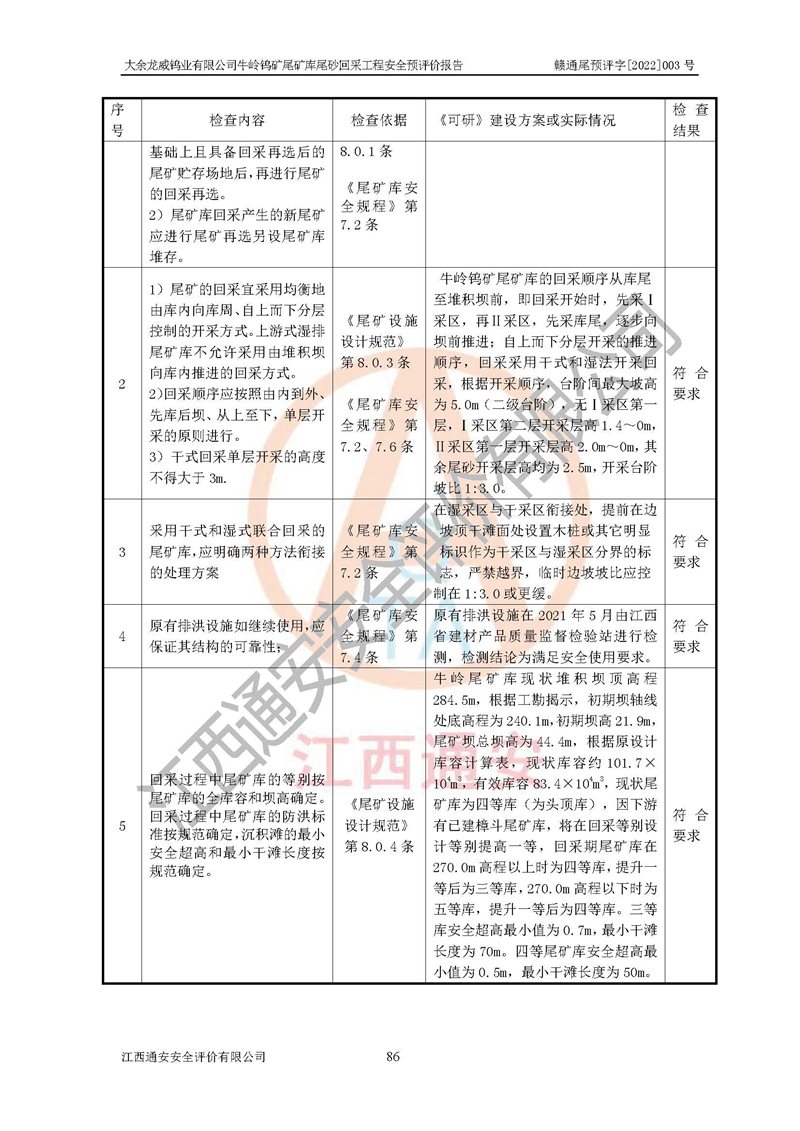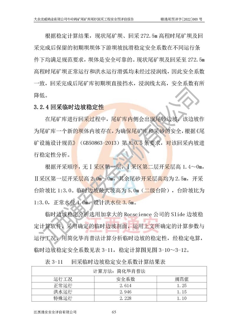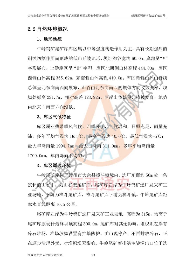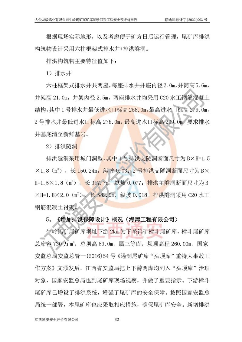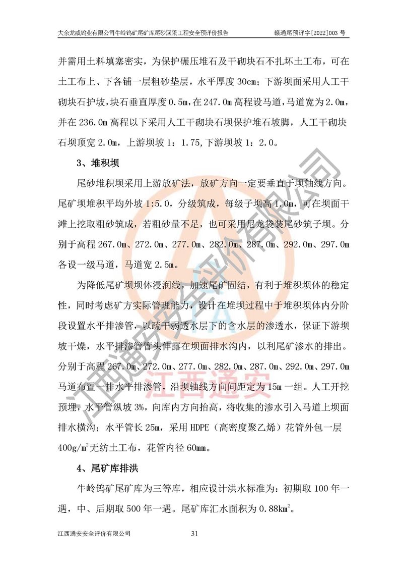 牛岭尾矿库于2006年1月由江西省冶金设计院设计,设计为初期透水堆石坝+上游式尾砂堆积坝,初期坝坝顶高程为262.0m,初期坝高20.5m,从262.0m至300.0m高程均采用尾砂堆坝,堆积坝高38m,总坝高为58.5m,总库容为200.08×104m3,尾矿库为四等库,考虑到下游已建有樟斗尾矿库,尾矿库提升一等至三等库,采用2座框架式排水井+排洪隧洞排洪排水;牛岭尾矿库2006年5月开工建设,共分为三个标段,2007年7月全面完工,2007年8月投入试运行,2008年6月,江西省赣华安全科技研究咨询中心有限公司出具了《大余龙威钨业有限公司牛岭钨锡矿尾矿库安全验收评价报告》;2008年9月进行竣工验收,2009年8月20日首次取得江西省安全生产监督管理局颁发的安全生产许可证,证书编号(赣)FM安许证字[2009]M1414号;为了完成“头顶库”治理,2017年7月,委托海湾工程有限公司完成了《增加排洪保障设计》,增设了3号框架式排水井+排洪隧洞,该项目2018年2月开工建设,2019年5月完工,2019年7月进行竣工验收,赣州永安安全生产科技服务有限公司出具了《大余龙威钨业有限公司牛岭钨矿尾矿库增加排洪保障设施工程安全设施竣工验收评价报告》;尾矿库安全生产许可证经多次延续,现安全生产许可证**期为2018年8月20日至2021年8月19日,尾矿库已于安全生产许可证到期时停止运行。 牛岭尾矿库现状坝顶高程为284.5m,还未达到原设计*终堆积高程300.0m,但初期坝下游2**为江西下垄钨业有限公司樟斗尾矿库,樟斗尾矿库下游为樟斗镇,两座尾矿库均为“头顶库”,为了降低尾矿库安全风险,减轻对下游樟斗尾矿库及樟斗镇居民的影响,大余龙威钨业有限公司决定采用“头顶库”五种综合治理措施(隐患治理、升级改造、闭库或销库、尾矿综合利用和下游居民搬迁)中的尾矿综合利用措施,对牛岭尾矿库库内尾砂**进行回采,回采尾砂作为建材外卖可取得**的经济效益,而且尾砂回采可降低坝高,提高尾矿库的安全稳定性。 2022年10月,大余龙威钨业有限公司委托四川百一勘察工程有限公司编制了《大余龙威钨业有限公司牛岭钨矿尾矿库(回采)工程地质勘察报告》,2022年10月,大余龙威钨业有限公司委托金建工程设计有限公司编制了《大余龙威钨业有限公司牛岭钨矿尾矿库尾砂回采工程可行性研究》,并委托我公司对该尾矿库尾砂回采工程项目进行安全预评价。 |