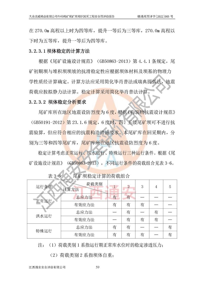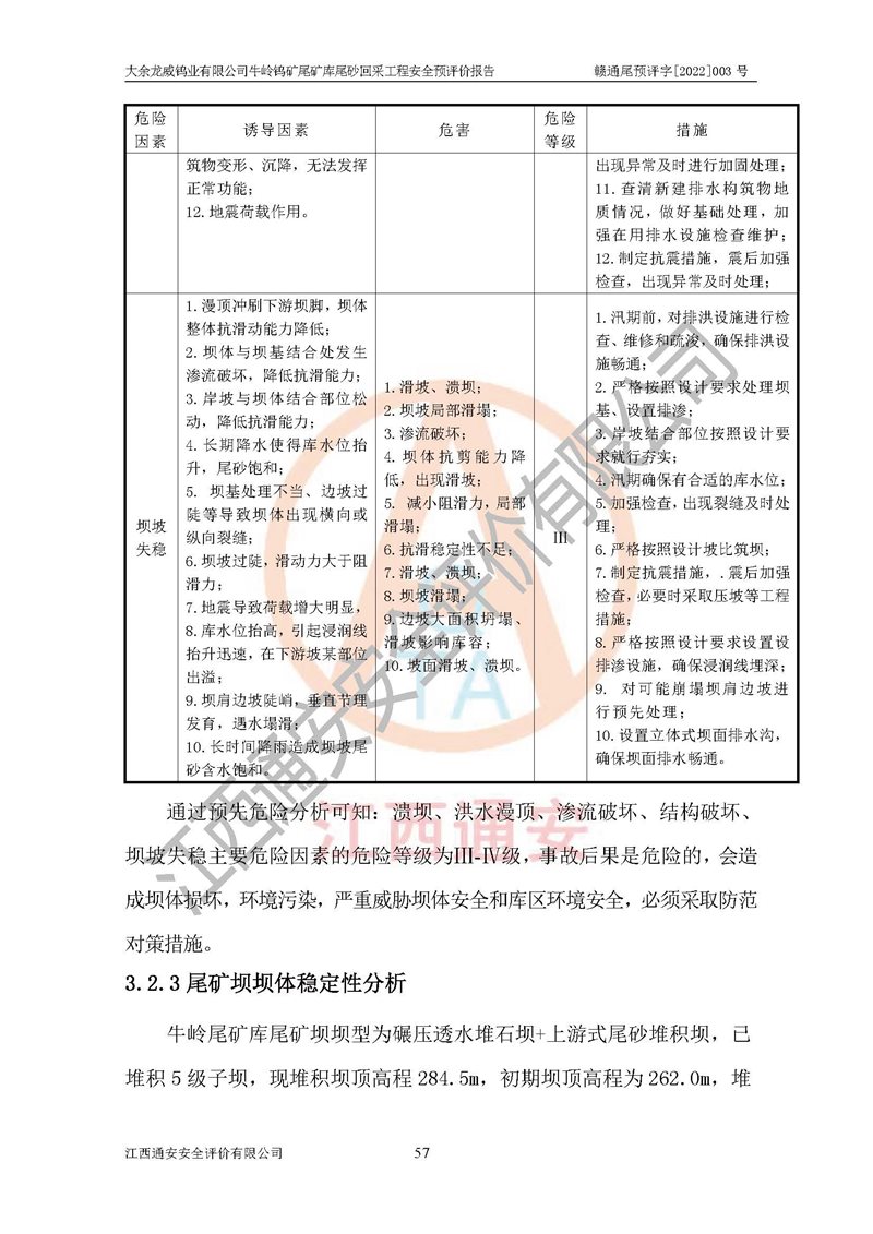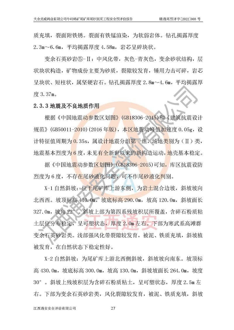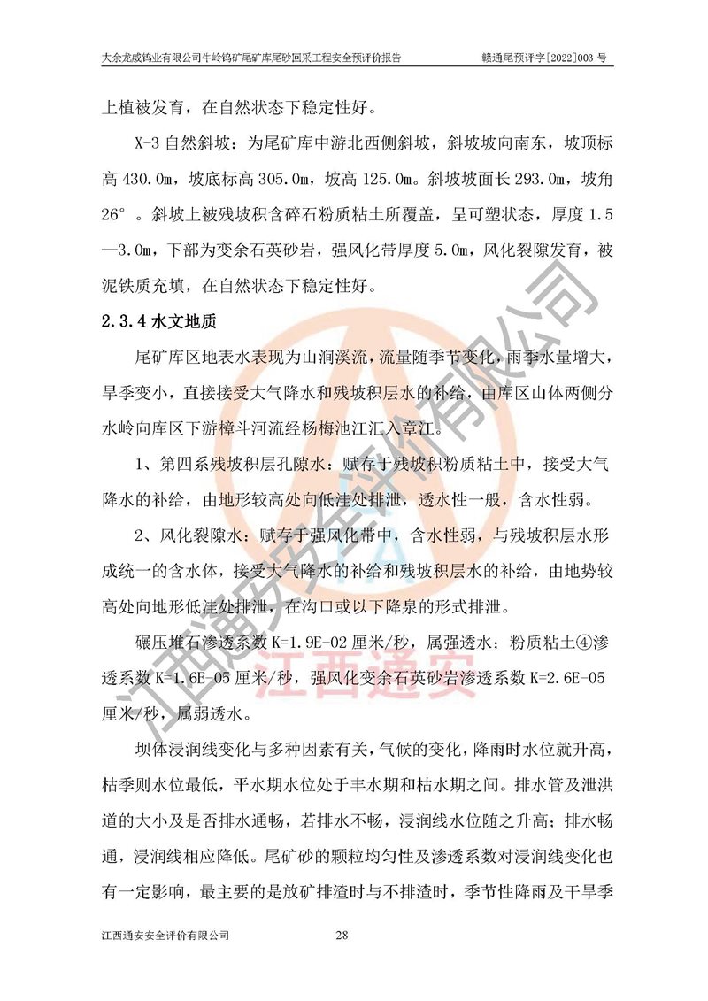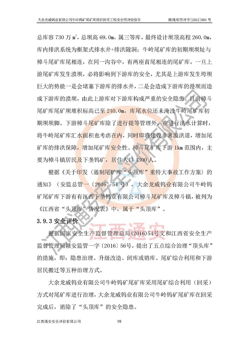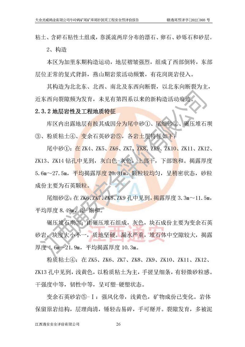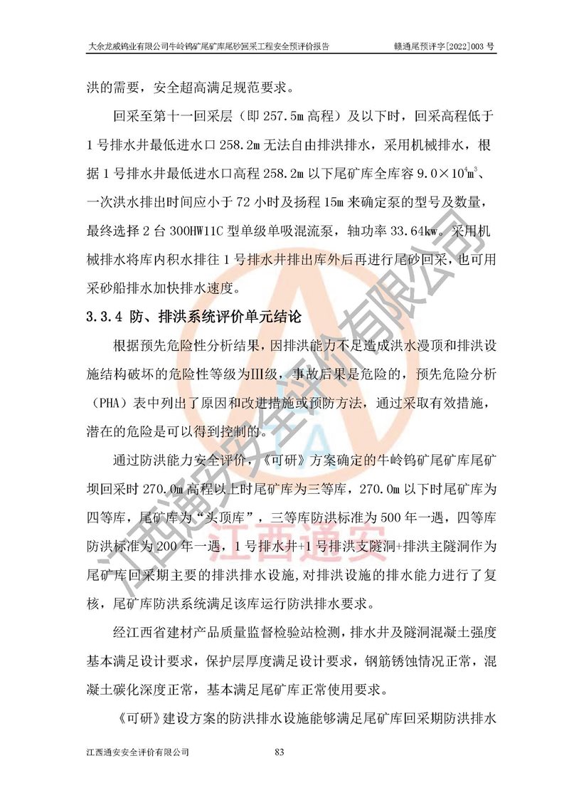 牛岭尾矿库于2006年1月由江西省冶金设计院设计,设计为初期透水堆石坝+上游式尾砂堆积坝,初期坝坝顶高程为262.0m,初期坝高20.5m,从262.0m至300.0m高程均采用尾砂堆坝,堆积坝高38m,总坝高为58.5m,总库容为200.08×104m3,尾矿库为四等库,考虑到下游已建有樟斗尾矿库,尾矿库提升一等至三等库,采用2座框架式排水井+排洪隧洞排洪排水;牛岭尾矿库2006年5月开工建设,共分为三个标段,2007年7月全面完工,2007年8月投入试运行,2008年6月,江西省赣华安全科技研究咨询中心有限公司出具了《大余龙威钨业有限公司牛岭钨锡矿尾矿库安全验收评价报告》;2008年9月进行竣工验收,2009年8月20日首次取得江西省安全生产监督管理局颁发的安全生产许可证,证书编号(赣)FM安许证字[2009]M1414号;为了完成“头顶库”治理,2017年7月,委托海湾工程有限公司完成了《增加排洪保障设计》,增设了3号框架式排水井+排洪隧洞,该项目2018年2月开工建设,2019年5月完工,2019年7月进行竣工验收,赣州永安安全生产科技服务有限公司出具了《大余龙威钨业有限公司牛岭钨矿尾矿库增加排洪保障设施工程安全设施竣工验收评价报告》;尾矿库安全生产许可证经多次延续,现安全生产许可证**期为2018年8月20日至2021年8月19日,尾矿库已于安全生产许可证到期时停止运行。 牛岭尾矿库现状坝顶高程为284.5m,还未达到原设计*终堆积高程300.0m,但初期坝下游2**为江西下垄钨业有限公司樟斗尾矿库,樟斗尾矿库下游为樟斗镇,两座尾矿库均为“头顶库”,为了降低尾矿库安全风险,减轻对下游樟斗尾矿库及樟斗镇居民的影响,大余龙威钨业有限公司决定采用“头顶库”五种综合治理措施(隐患治理、升级改造、闭库或销库、尾矿综合利用和下游居民搬迁)中的尾矿综合利用措施,对牛岭尾矿库库内尾砂**进行回采,回采尾砂作为建材外卖可取得**的经济效益,而且尾砂回采可降低坝高,提高尾矿库的安全稳定性。 2022年10月,大余龙威钨业有限公司委托四川百一勘察工程有限公司编制了《大余龙威钨业有限公司牛岭钨矿尾矿库(回采)工程地质勘察报告》,2022年10月,大余龙威钨业有限公司委托金建工程设计有限公司编制了《大余龙威钨业有限公司牛岭钨矿尾矿库尾砂回采工程可行性研究》,并委托我公司对该尾矿库尾砂回采工程项目进行安全预评价。 |