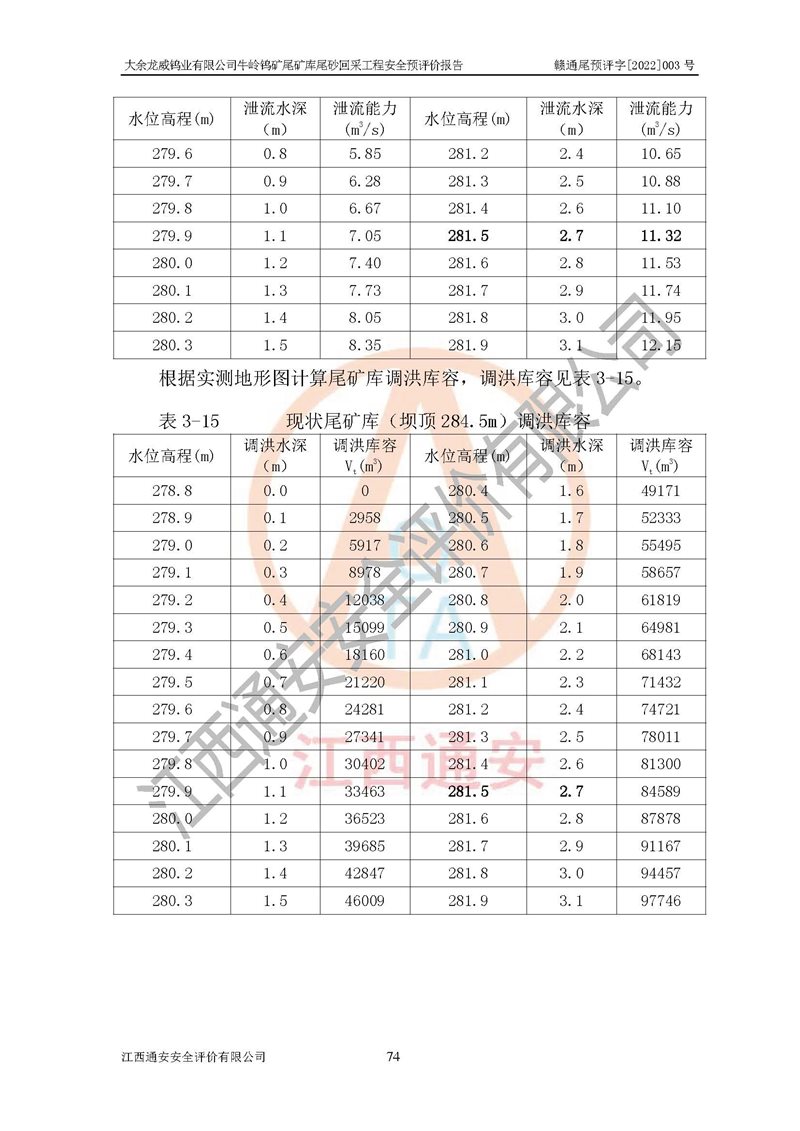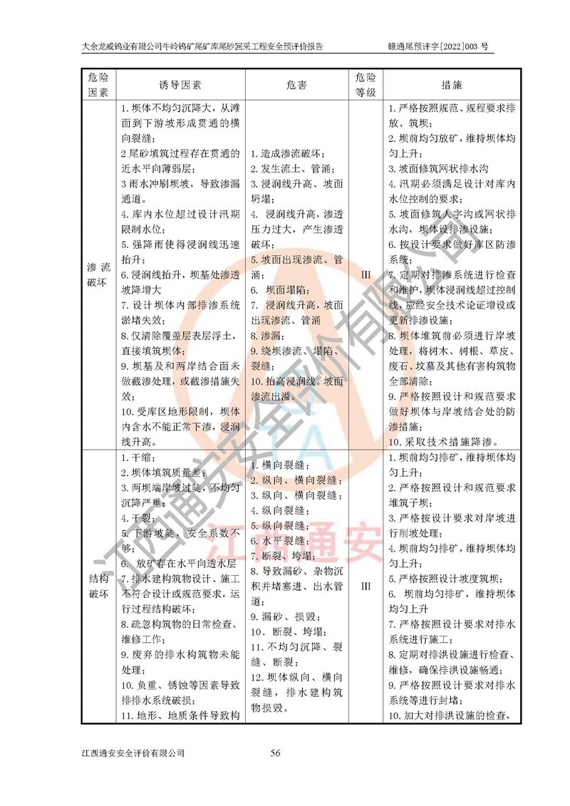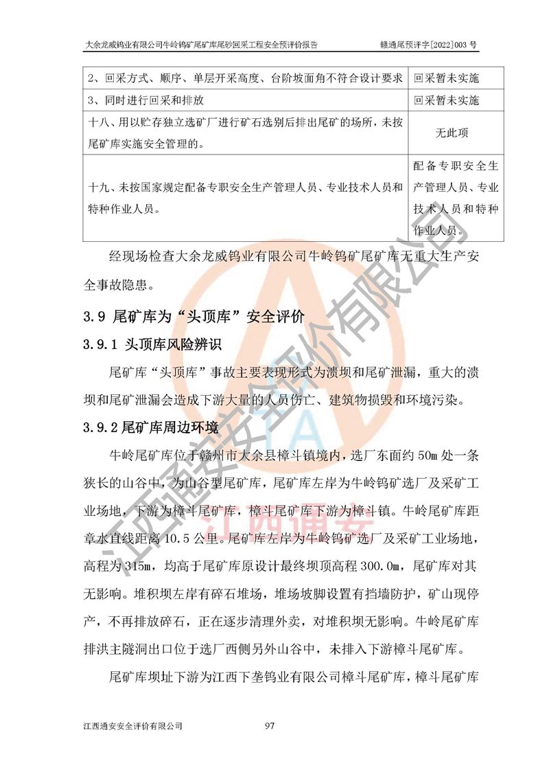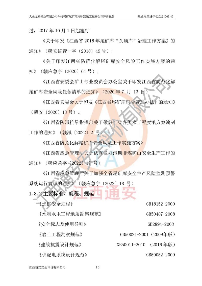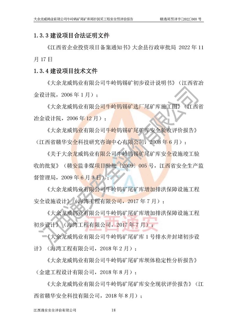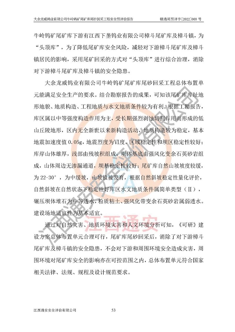 牛岭尾矿库于2006年1月由江西省冶金设计院设计,设计为初期透水堆石坝+上游式尾砂堆积坝,初期坝坝顶高程为262.0m,初期坝高20.5m,从262.0m至300.0m高程均采用尾砂堆坝,堆积坝高38m,总坝高为58.5m,总库容为200.08×104m3,尾矿库为四等库,考虑到下游已建有樟斗尾矿库,尾矿库提升一等至三等库,采用2座框架式排水井+排洪隧洞排洪排水;牛岭尾矿库2006年5月开工建设,共分为三个标段,2007年7月全面完工,2007年8月投入试运行,2008年6月,江西省赣华安全科技研究咨询中心有限公司出具了《大余龙威钨业有限公司牛岭钨锡矿尾矿库安全验收评价报告》;2008年9月进行竣工验收,2009年8月20日首次取得江西省安全生产监督管理局颁发的安全生产许可证,证书编号(赣)FM安许证字[2009]M1414号;为了完成“头顶库”治理,2017年7月,委托海湾工程有限公司完成了《增加排洪保障设计》,增设了3号框架式排水井+排洪隧洞,该项目2018年2月开工建设,2019年5月完工,2019年7月进行竣工验收,赣州永安安全生产科技服务有限公司出具了《大余龙威钨业有限公司牛岭钨矿尾矿库增加排洪保障设施工程安全设施竣工验收评价报告》;尾矿库安全生产许可证经多次延续,现安全生产许可证**期为2018年8月20日至2021年8月19日,尾矿库已于安全生产许可证到期时停止运行。 牛岭尾矿库现状坝顶高程为284.5m,还未达到原设计*终堆积高程300.0m,但初期坝下游2**为江西下垄钨业有限公司樟斗尾矿库,樟斗尾矿库下游为樟斗镇,两座尾矿库均为“头顶库”,为了降低尾矿库安全风险,减轻对下游樟斗尾矿库及樟斗镇居民的影响,大余龙威钨业有限公司决定采用“头顶库”五种综合治理措施(隐患治理、升级改造、闭库或销库、尾矿综合利用和下游居民搬迁)中的尾矿综合利用措施,对牛岭尾矿库库内尾砂**进行回采,回采尾砂作为建材外卖可取得**的经济效益,而且尾砂回采可降低坝高,提高尾矿库的安全稳定性。 2022年10月,大余龙威钨业有限公司委托四川百一勘察工程有限公司编制了《大余龙威钨业有限公司牛岭钨矿尾矿库(回采)工程地质勘察报告》,2022年10月,大余龙威钨业有限公司委托金建工程设计有限公司编制了《大余龙威钨业有限公司牛岭钨矿尾矿库尾砂回采工程可行性研究》,并委托我公司对该尾矿库尾砂回采工程项目进行安全预评价。 |