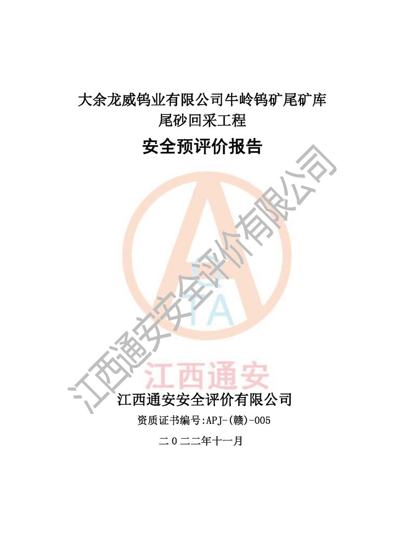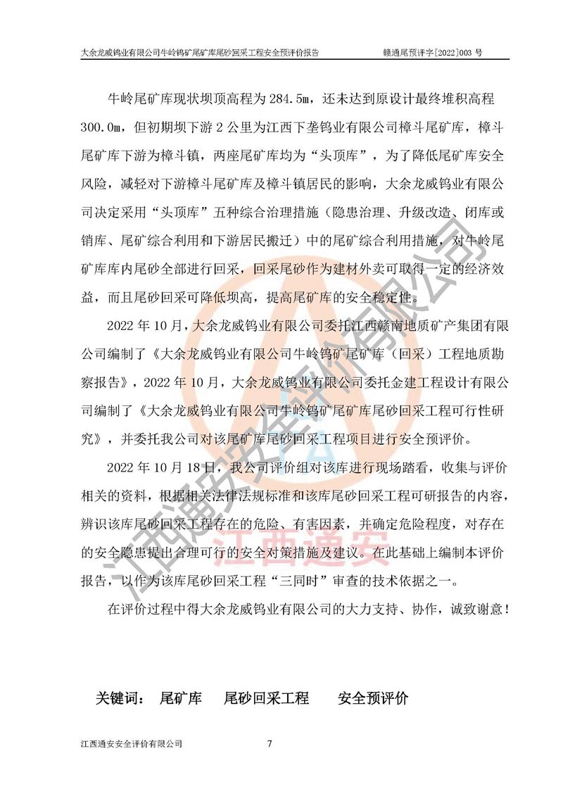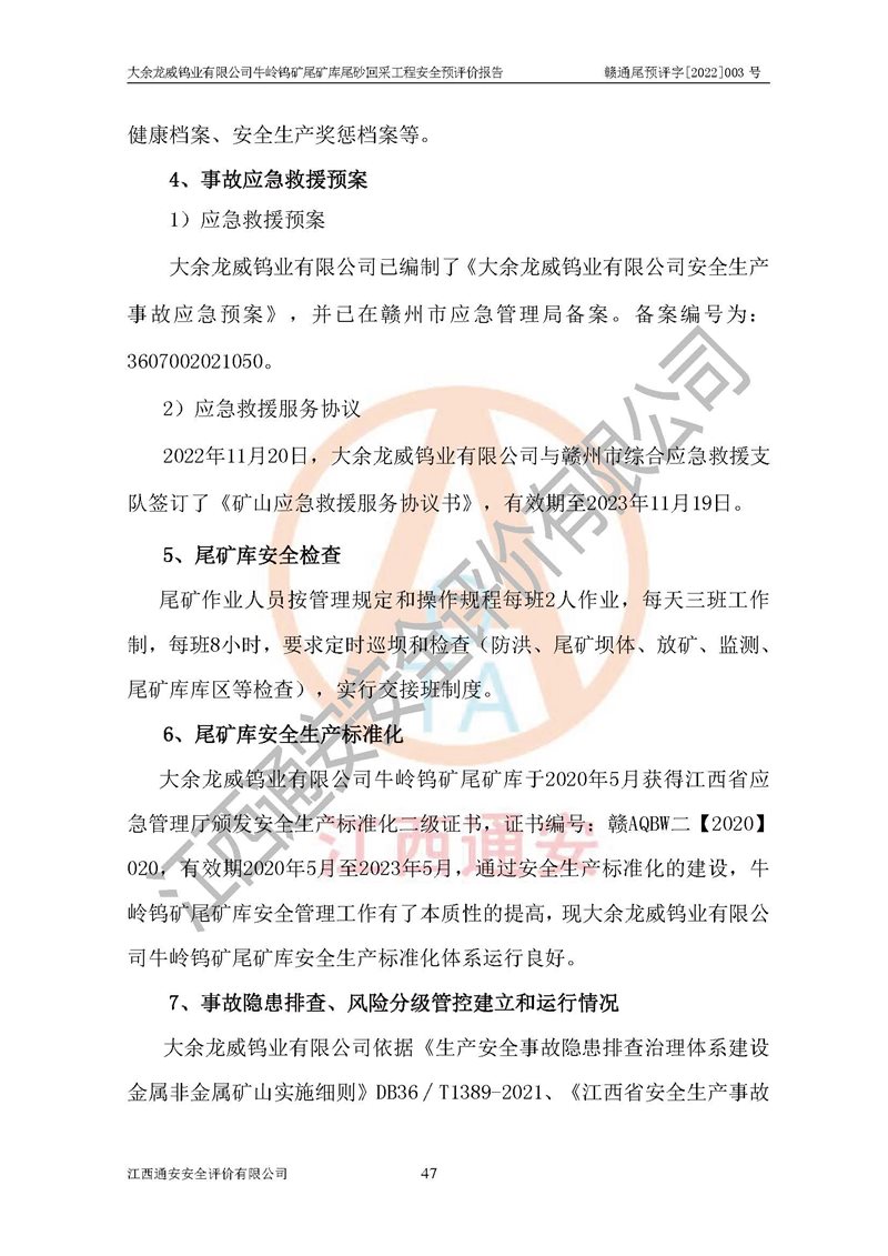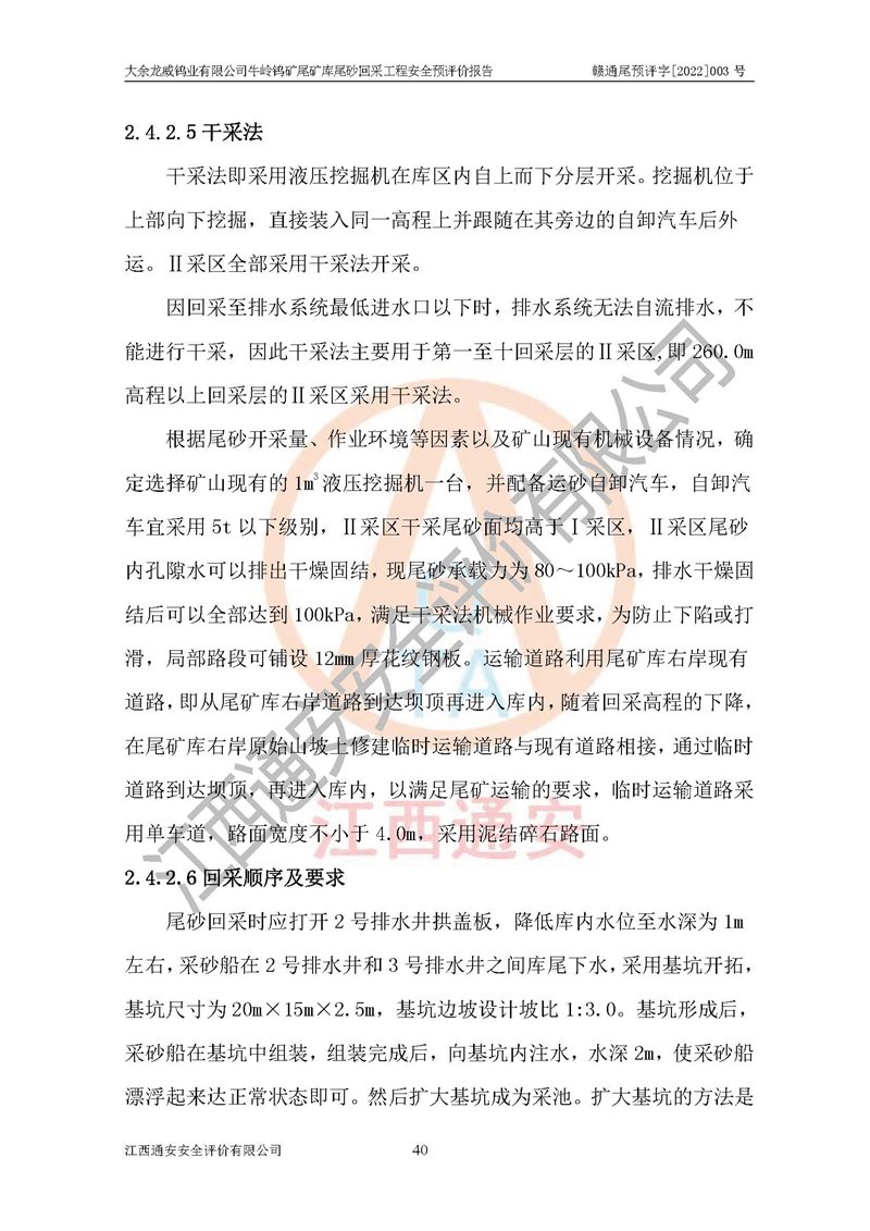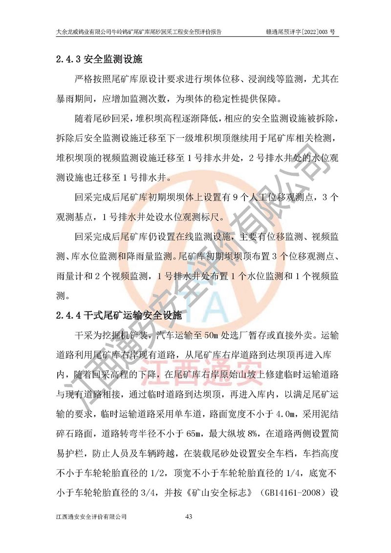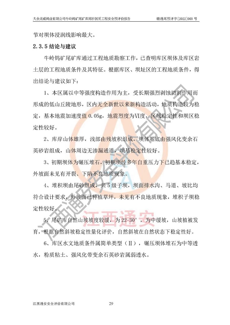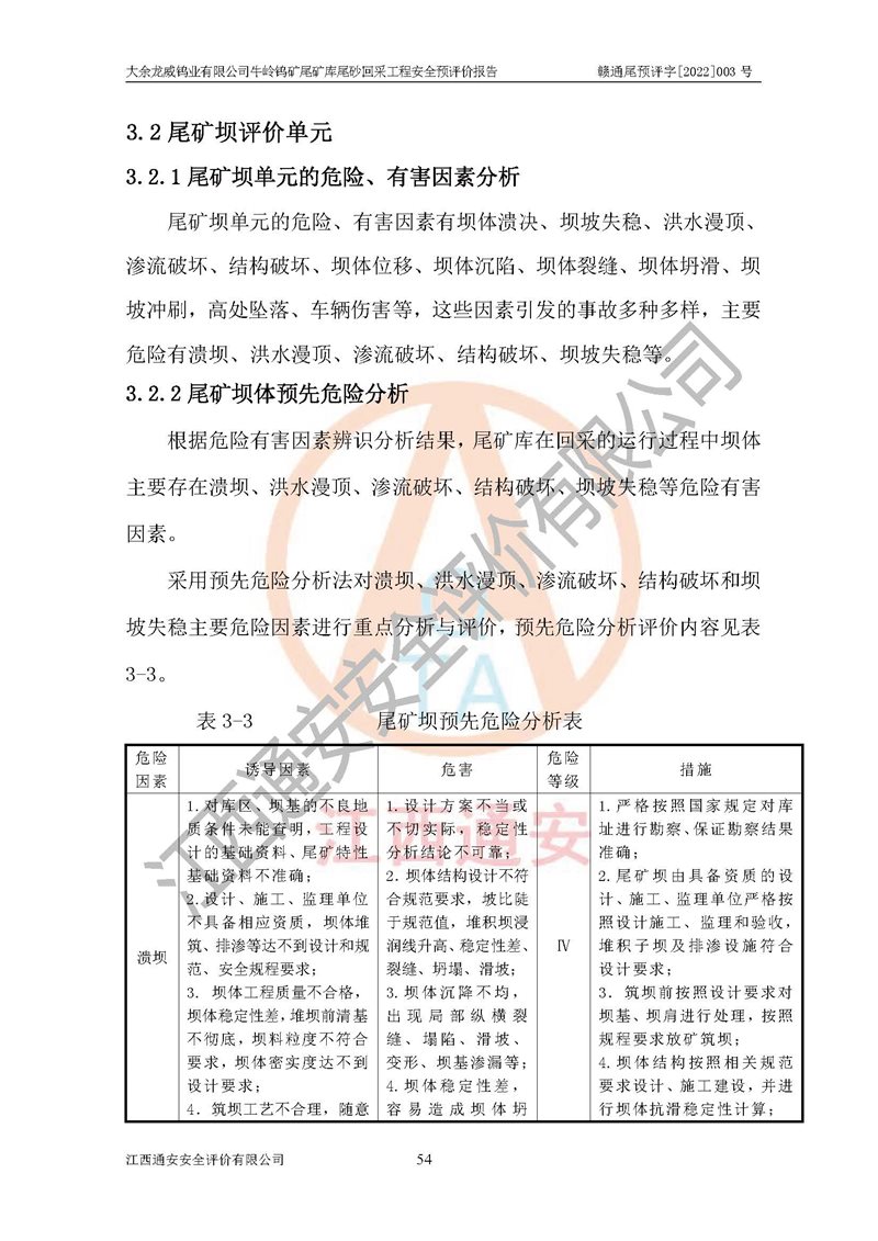 牛岭尾矿库于2006年1月由江西省冶金设计院设计,设计为初期透水堆石坝+上游式尾砂堆积坝,初期坝坝顶高程为262.0m,初期坝高20.5m,从262.0m至300.0m高程均采用尾砂堆坝,堆积坝高38m,总坝高为58.5m,总库容为200.08×104m3,尾矿库为四等库,考虑到下游已建有樟斗尾矿库,尾矿库提升一等至三等库,采用2座框架式排水井+排洪隧洞排洪排水;牛岭尾矿库2006年5月开工建设,共分为三个标段,2007年7月全面完工,2007年8月投入试运行,2008年6月,江西省赣华安全科技研究咨询中心有限公司出具了《大余龙威钨业有限公司牛岭钨锡矿尾矿库安全验收评价报告》;2008年9月进行竣工验收,2009年8月20日首次取得江西省安全生产监督管理局颁发的安全生产许可证,证书编号(赣)FM安许证字[2009]M1414号;为了完成“头顶库”治理,2017年7月,委托海湾工程有限公司完成了《增加排洪保障设计》,增设了3号框架式排水井+排洪隧洞,该项目2018年2月开工建设,2019年5月完工,2019年7月进行竣工验收,赣州永安安全生产科技服务有限公司出具了《大余龙威钨业有限公司牛岭钨矿尾矿库增加排洪保障设施工程安全设施竣工验收评价报告》;尾矿库安全生产许可证经多次延续,现安全生产许可证**期为2018年8月20日至2021年8月19日,尾矿库已于安全生产许可证到期时停止运行。 牛岭尾矿库现状坝顶高程为284.5m,还未达到原设计*终堆积高程300.0m,但初期坝下游2**为江西下垄钨业有限公司樟斗尾矿库,樟斗尾矿库下游为樟斗镇,两座尾矿库均为“头顶库”,为了降低尾矿库安全风险,减轻对下游樟斗尾矿库及樟斗镇居民的影响,大余龙威钨业有限公司决定采用“头顶库”五种综合治理措施(隐患治理、升级改造、闭库或销库、尾矿综合利用和下游居民搬迁)中的尾矿综合利用措施,对牛岭尾矿库库内尾砂**进行回采,回采尾砂作为建材外卖可取得**的经济效益,而且尾砂回采可降低坝高,提高尾矿库的安全稳定性。 2022年10月,大余龙威钨业有限公司委托四川百一勘察工程有限公司编制了《大余龙威钨业有限公司牛岭钨矿尾矿库(回采)工程地质勘察报告》,2022年10月,大余龙威钨业有限公司委托金建工程设计有限公司编制了《大余龙威钨业有限公司牛岭钨矿尾矿库尾砂回采工程可行性研究》,并委托我公司对该尾矿库尾砂回采工程项目进行安全预评价。 |