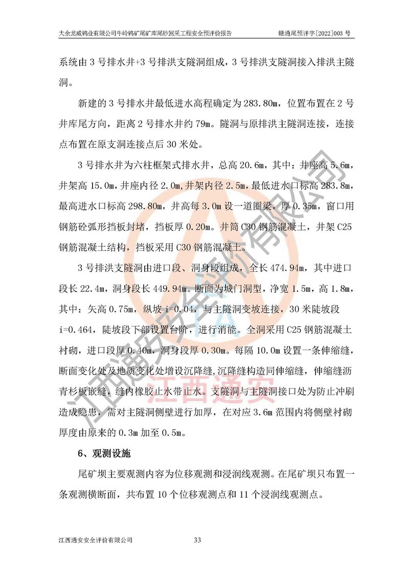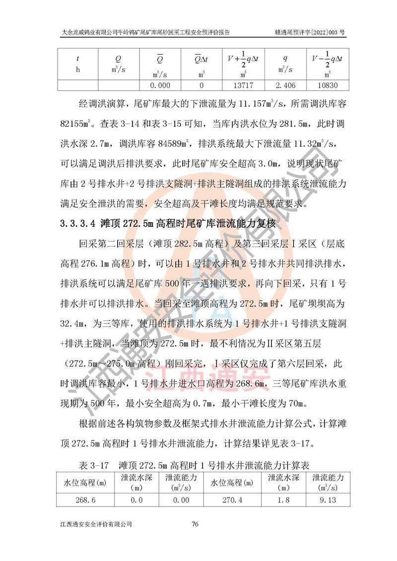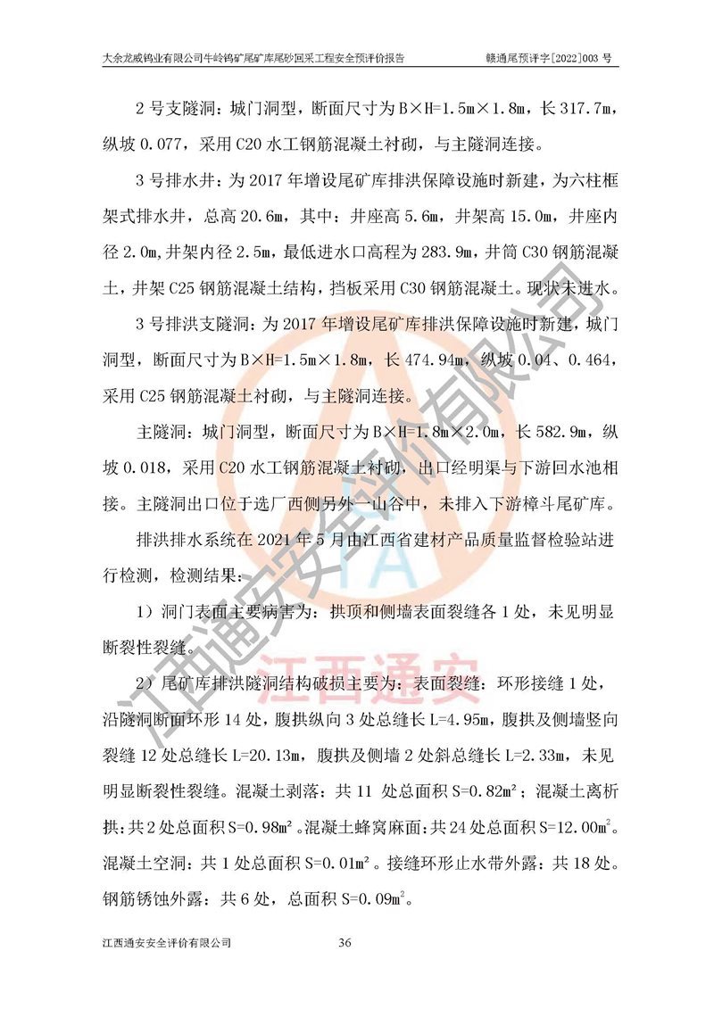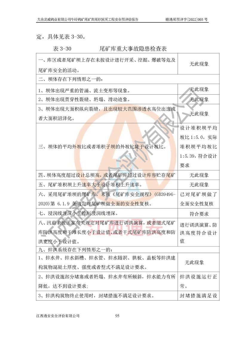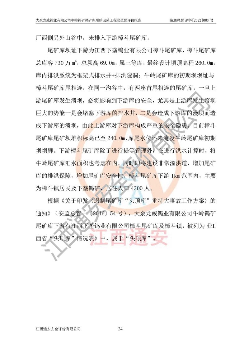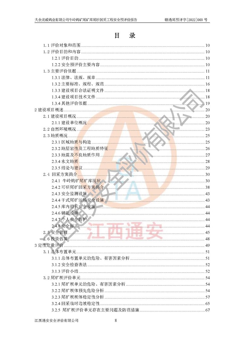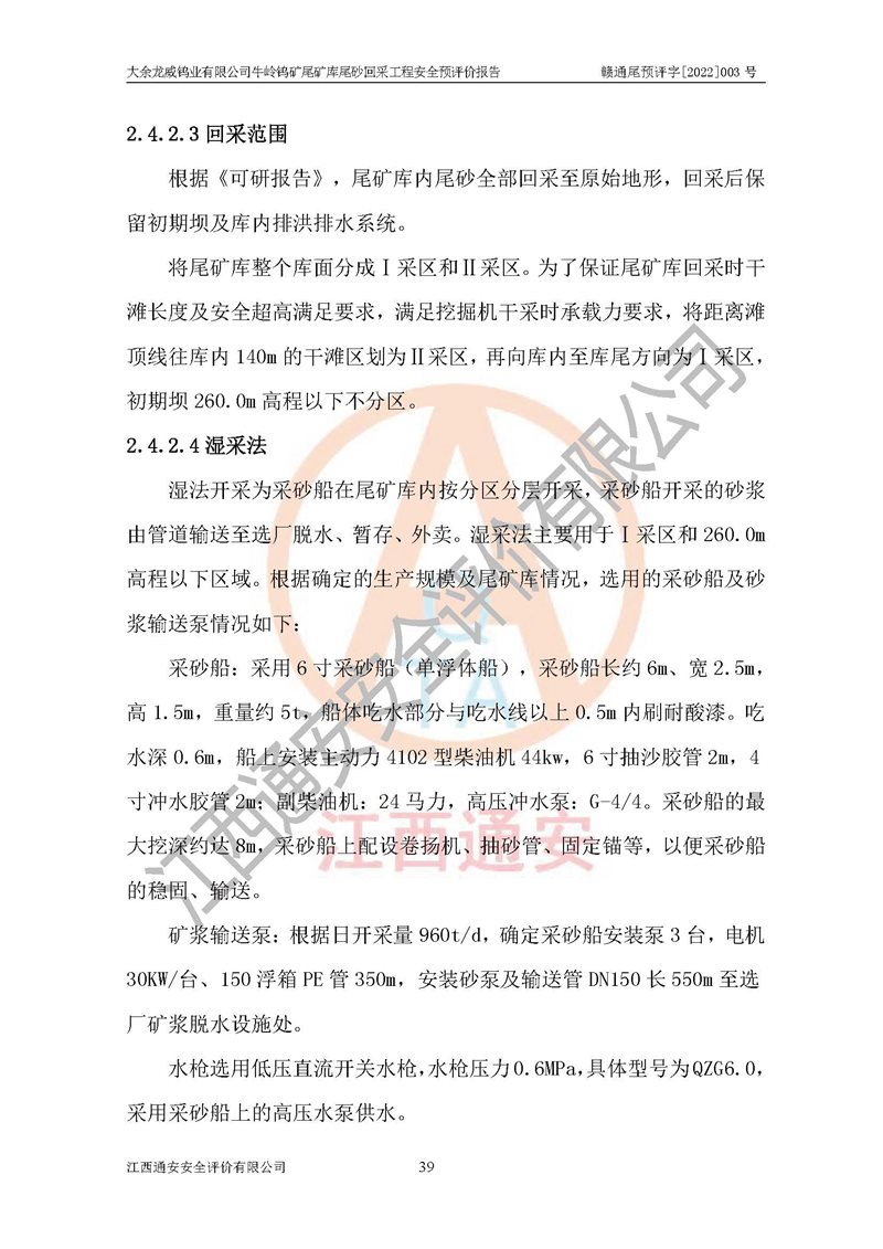 牛岭尾矿库于2006年1月由江西省冶金设计院设计,设计为初期透水堆石坝+上游式尾砂堆积坝,初期坝坝顶高程为262.0m,初期坝高20.5m,从262.0m至300.0m高程均采用尾砂堆坝,堆积坝高38m,总坝高为58.5m,总库容为200.08×104m3,尾矿库为四等库,考虑到下游已建有樟斗尾矿库,尾矿库提升一等至三等库,采用2座框架式排水井+排洪隧洞排洪排水;牛岭尾矿库2006年5月开工建设,共分为三个标段,2007年7月全面完工,2007年8月投入试运行,2008年6月,江西省赣华安全科技研究咨询中心有限公司出具了《大余龙威钨业有限公司牛岭钨锡矿尾矿库安全验收评价报告》;2008年9月进行竣工验收,2009年8月20日首次取得江西省安全生产监督管理局颁发的安全生产许可证,证书编号(赣)FM安许证字[2009]M1414号;为了完成“头顶库”治理,2017年7月,委托海湾工程有限公司完成了《增加排洪保障设计》,增设了3号框架式排水井+排洪隧洞,该项目2018年2月开工建设,2019年5月完工,2019年7月进行竣工验收,赣州永安安全生产科技服务有限公司出具了《大余龙威钨业有限公司牛岭钨矿尾矿库增加排洪保障设施工程安全设施竣工验收评价报告》;尾矿库安全生产许可证经多次延续,现安全生产许可证**期为2018年8月20日至2021年8月19日,尾矿库已于安全生产许可证到期时停止运行。 牛岭尾矿库现状坝顶高程为284.5m,还未达到原设计*终堆积高程300.0m,但初期坝下游2**为江西下垄钨业有限公司樟斗尾矿库,樟斗尾矿库下游为樟斗镇,两座尾矿库均为“头顶库”,为了降低尾矿库安全风险,减轻对下游樟斗尾矿库及樟斗镇居民的影响,大余龙威钨业有限公司决定采用“头顶库”五种综合治理措施(隐患治理、升级改造、闭库或销库、尾矿综合利用和下游居民搬迁)中的尾矿综合利用措施,对牛岭尾矿库库内尾砂**进行回采,回采尾砂作为建材外卖可取得**的经济效益,而且尾砂回采可降低坝高,提高尾矿库的安全稳定性。 2022年10月,大余龙威钨业有限公司委托四川百一勘察工程有限公司编制了《大余龙威钨业有限公司牛岭钨矿尾矿库(回采)工程地质勘察报告》,2022年10月,大余龙威钨业有限公司委托金建工程设计有限公司编制了《大余龙威钨业有限公司牛岭钨矿尾矿库尾砂回采工程可行性研究》,并委托我公司对该尾矿库尾砂回采工程项目进行安全预评价。 |