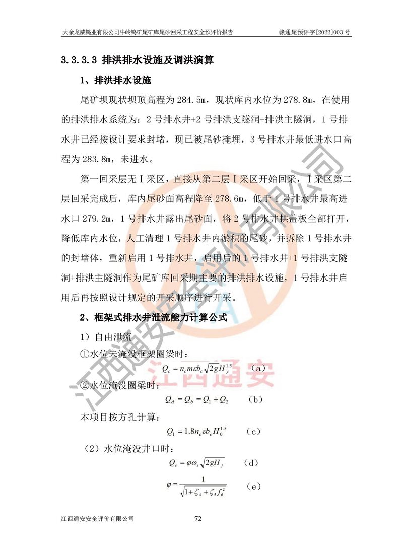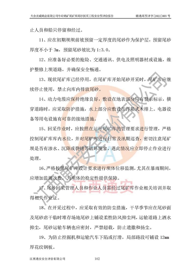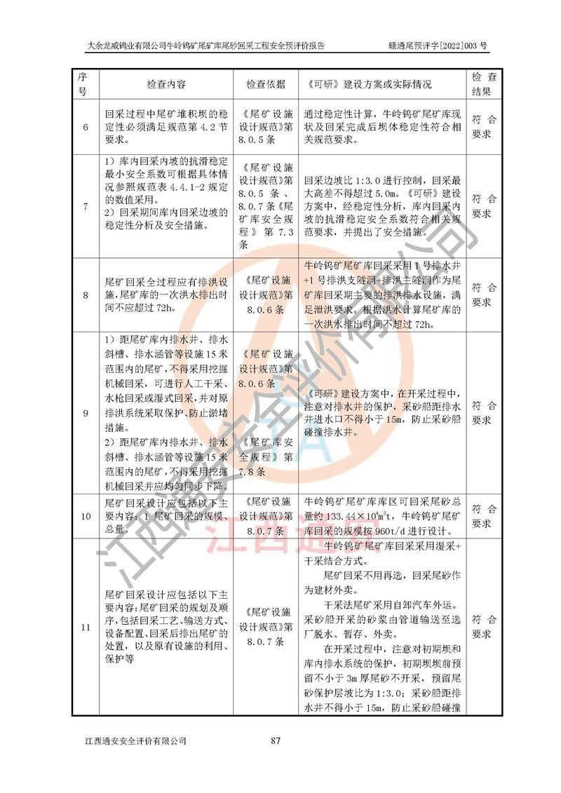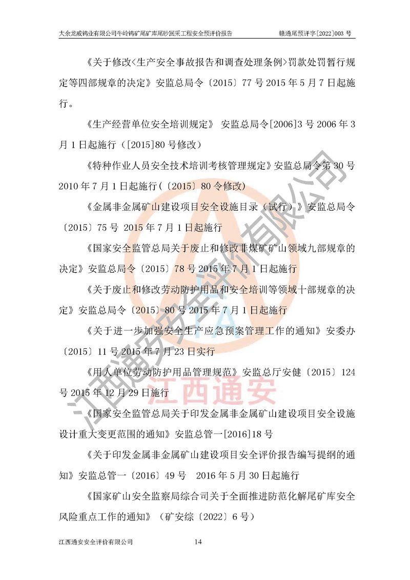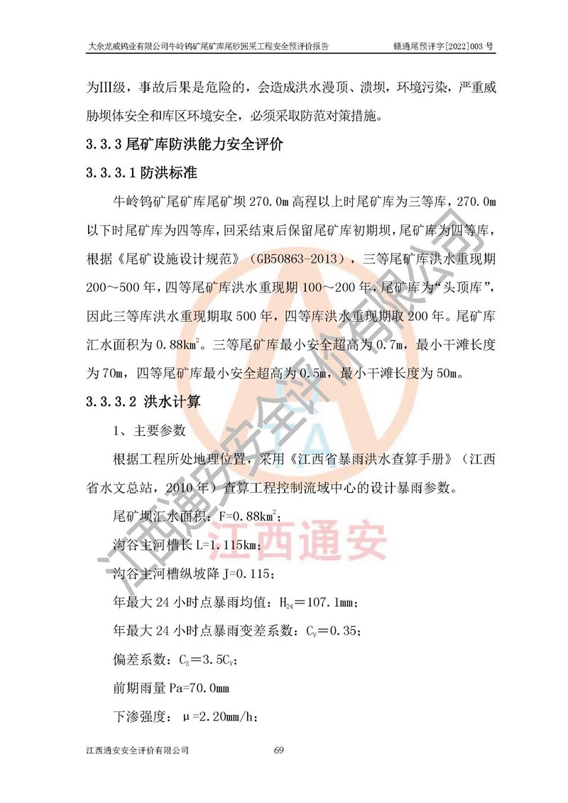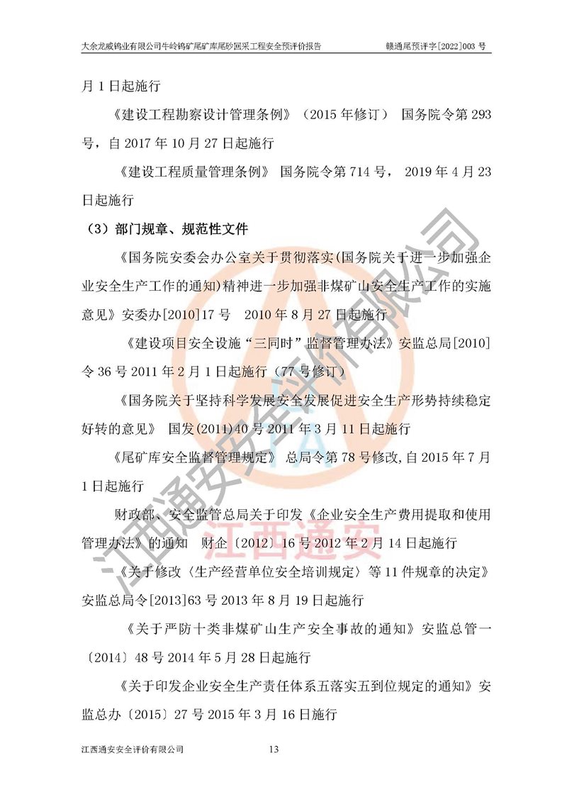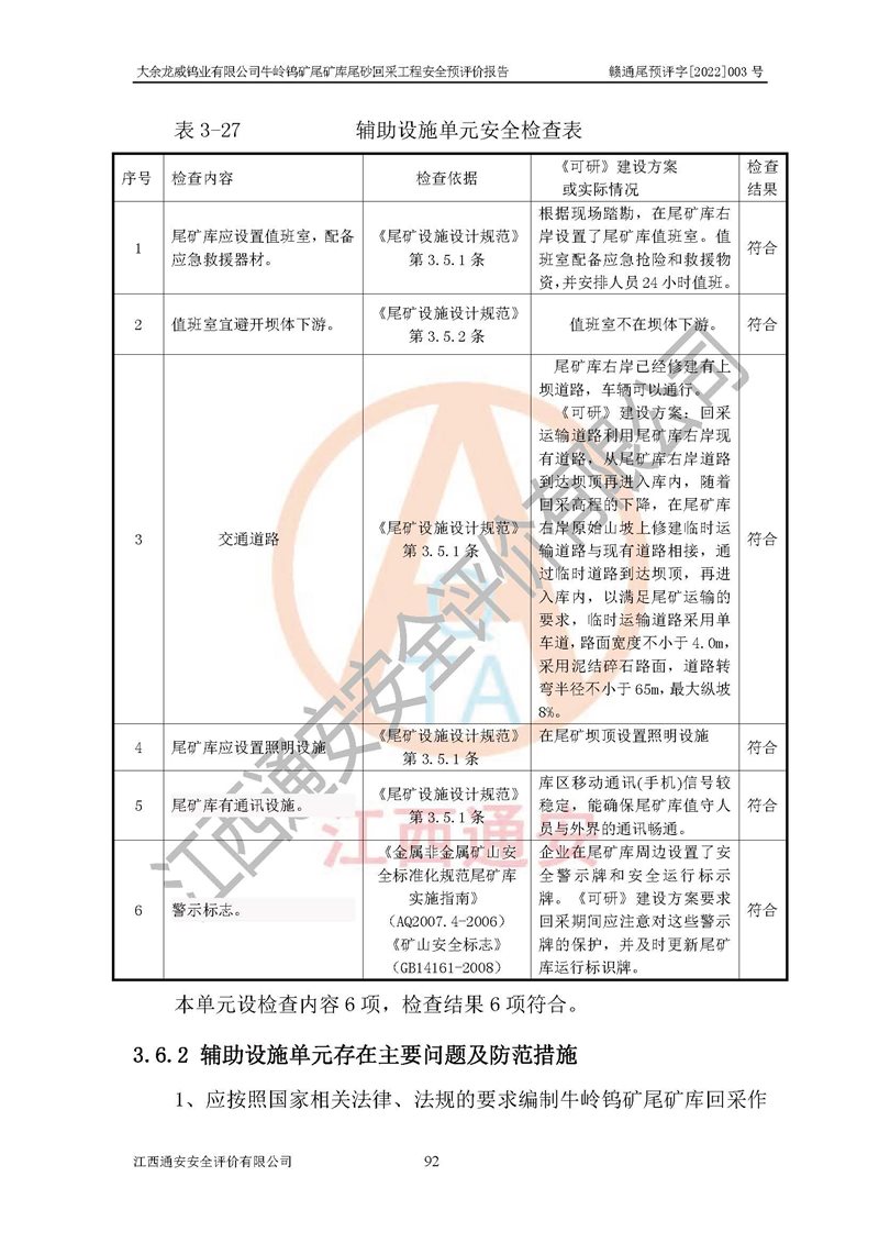 牛岭尾矿库于2006年1月由江西省冶金设计院设计,设计为初期透水堆石坝+上游式尾砂堆积坝,初期坝坝顶高程为262.0m,初期坝高20.5m,从262.0m至300.0m高程均采用尾砂堆坝,堆积坝高38m,总坝高为58.5m,总库容为200.08×104m3,尾矿库为四等库,考虑到下游已建有樟斗尾矿库,尾矿库提升一等至三等库,采用2座框架式排水井+排洪隧洞排洪排水;牛岭尾矿库2006年5月开工建设,共分为三个标段,2007年7月全面完工,2007年8月投入试运行,2008年6月,江西省赣华安全科技研究咨询中心有限公司出具了《大余龙威钨业有限公司牛岭钨锡矿尾矿库安全验收评价报告》;2008年9月进行竣工验收,2009年8月20日首次取得江西省安全生产监督管理局颁发的安全生产许可证,证书编号(赣)FM安许证字[2009]M1414号;为了完成“头顶库”治理,2017年7月,委托海湾工程有限公司完成了《增加排洪保障设计》,增设了3号框架式排水井+排洪隧洞,该项目2018年2月开工建设,2019年5月完工,2019年7月进行竣工验收,赣州永安安全生产科技服务有限公司出具了《大余龙威钨业有限公司牛岭钨矿尾矿库增加排洪保障设施工程安全设施竣工验收评价报告》;尾矿库安全生产许可证经多次延续,现安全生产许可证**期为2018年8月20日至2021年8月19日,尾矿库已于安全生产许可证到期时停止运行。 牛岭尾矿库现状坝顶高程为284.5m,还未达到原设计*终堆积高程300.0m,但初期坝下游2**为江西下垄钨业有限公司樟斗尾矿库,樟斗尾矿库下游为樟斗镇,两座尾矿库均为“头顶库”,为了降低尾矿库安全风险,减轻对下游樟斗尾矿库及樟斗镇居民的影响,大余龙威钨业有限公司决定采用“头顶库”五种综合治理措施(隐患治理、升级改造、闭库或销库、尾矿综合利用和下游居民搬迁)中的尾矿综合利用措施,对牛岭尾矿库库内尾砂**进行回采,回采尾砂作为建材外卖可取得**的经济效益,而且尾砂回采可降低坝高,提高尾矿库的安全稳定性。 2022年10月,大余龙威钨业有限公司委托四川百一勘察工程有限公司编制了《大余龙威钨业有限公司牛岭钨矿尾矿库(回采)工程地质勘察报告》,2022年10月,大余龙威钨业有限公司委托金建工程设计有限公司编制了《大余龙威钨业有限公司牛岭钨矿尾矿库尾砂回采工程可行性研究》,并委托我公司对该尾矿库尾砂回采工程项目进行安全预评价。 |