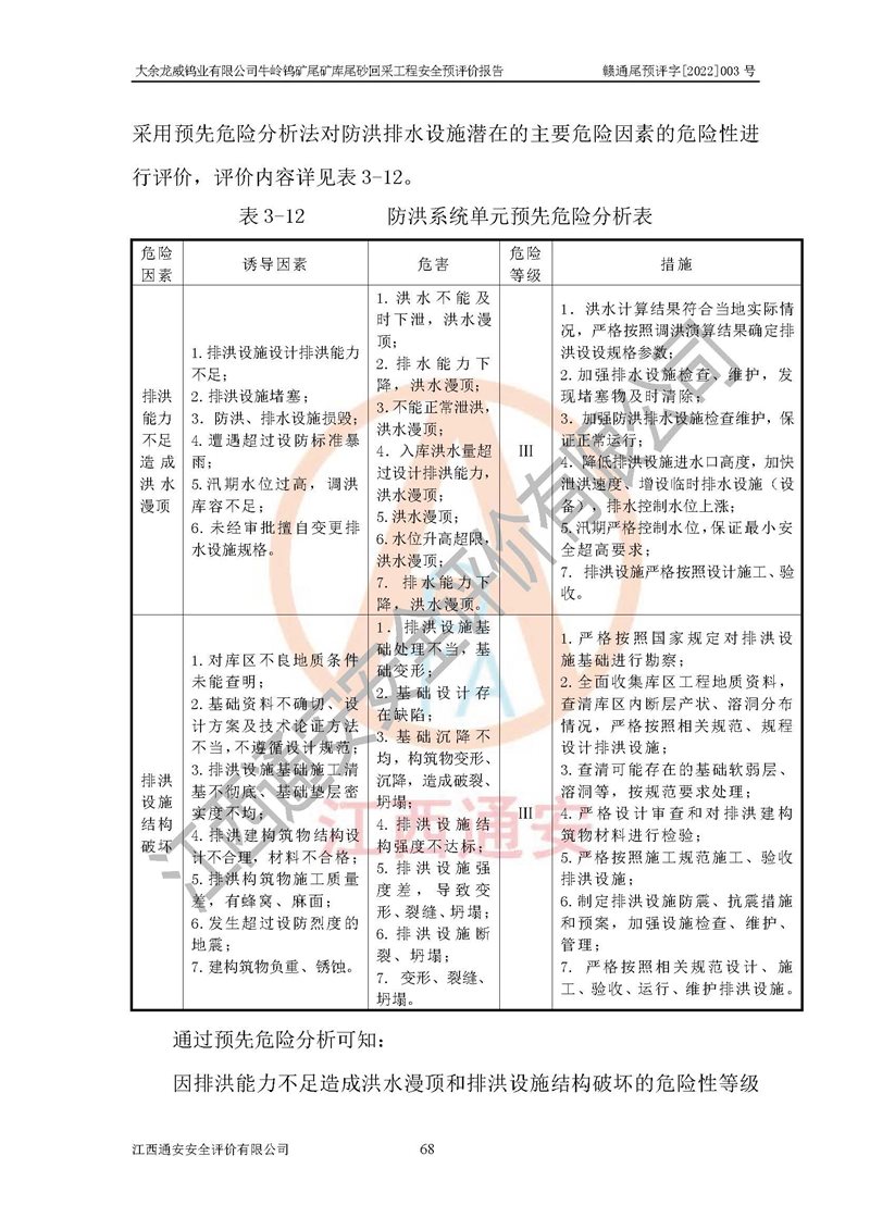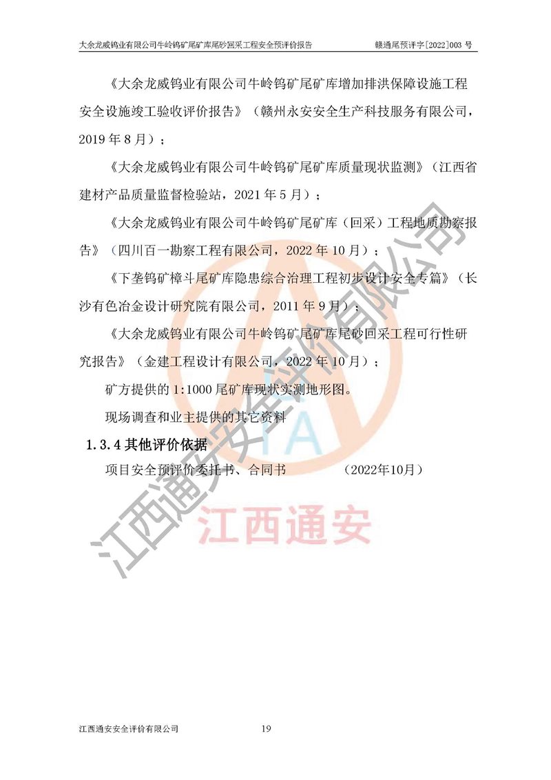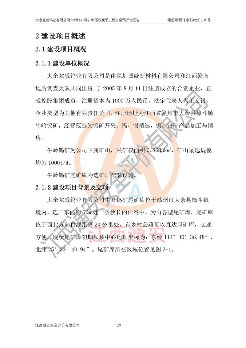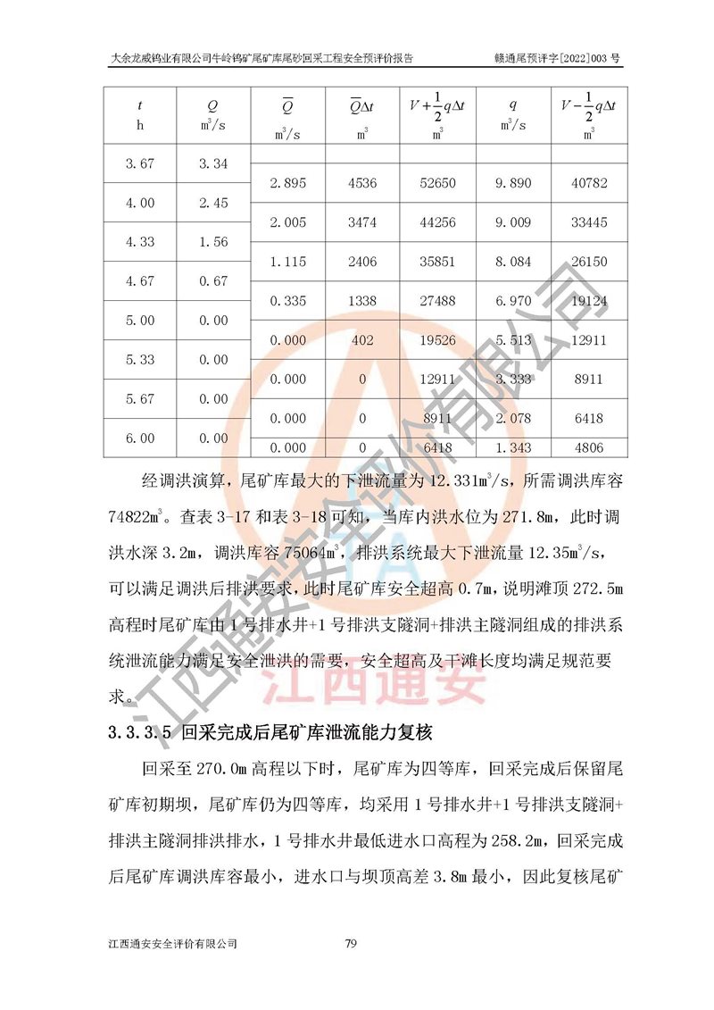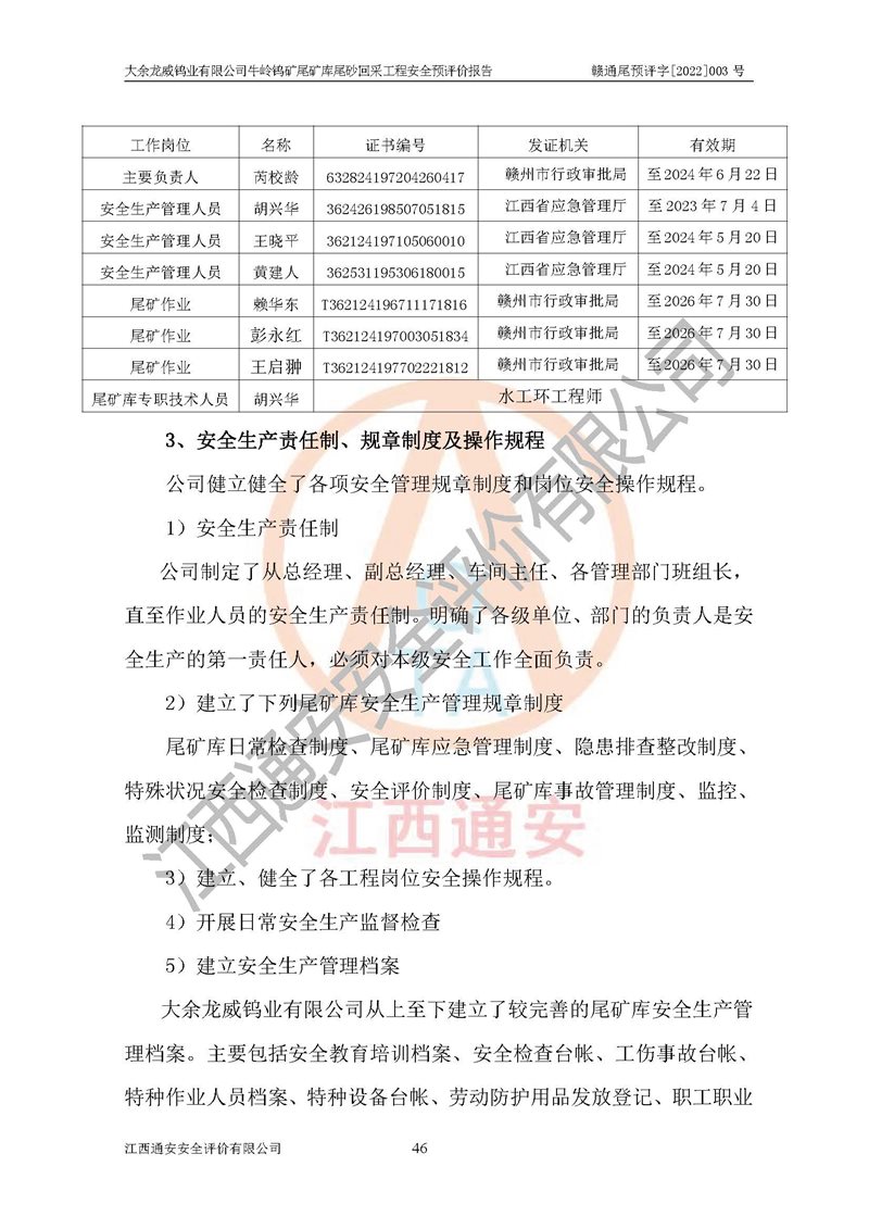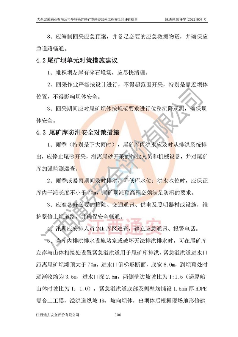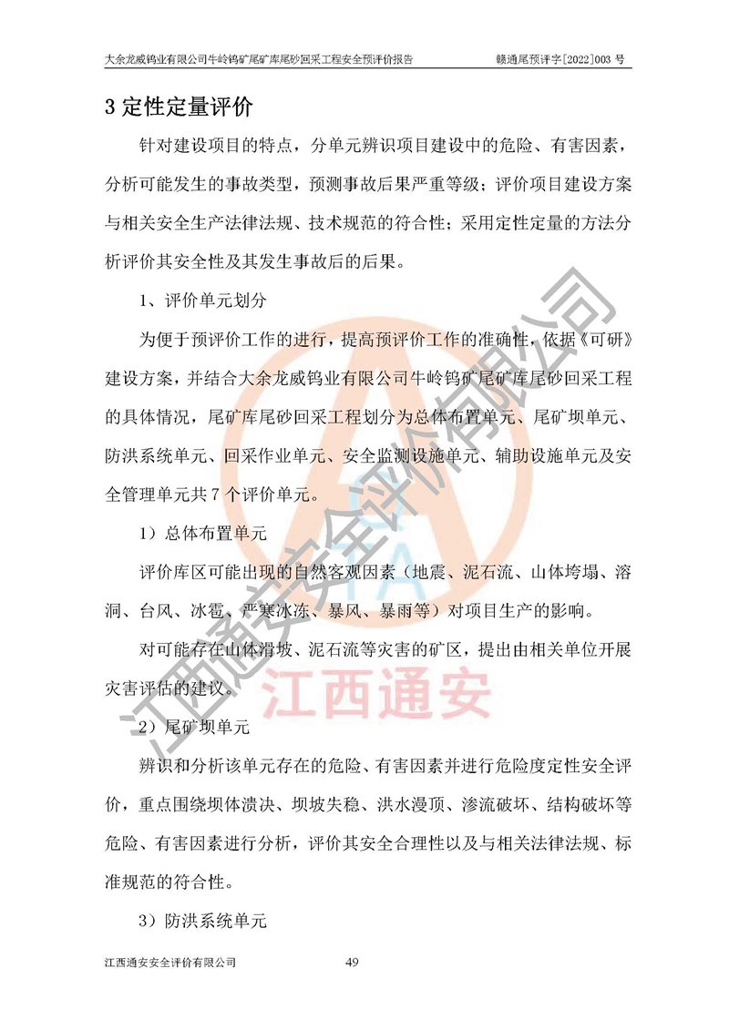 牛岭尾矿库于2006年1月由江西省冶金设计院设计,设计为初期透水堆石坝+上游式尾砂堆积坝,初期坝坝顶高程为262.0m,初期坝高20.5m,从262.0m至300.0m高程均采用尾砂堆坝,堆积坝高38m,总坝高为58.5m,总库容为200.08×104m3,尾矿库为四等库,考虑到下游已建有樟斗尾矿库,尾矿库提升一等至三等库,采用2座框架式排水井+排洪隧洞排洪排水;牛岭尾矿库2006年5月开工建设,共分为三个标段,2007年7月全面完工,2007年8月投入试运行,2008年6月,江西省赣华安全科技研究咨询中心有限公司出具了《大余龙威钨业有限公司牛岭钨锡矿尾矿库安全验收评价报告》;2008年9月进行竣工验收,2009年8月20日首次取得江西省安全生产监督管理局颁发的安全生产许可证,证书编号(赣)FM安许证字[2009]M1414号;为了完成“头顶库”治理,2017年7月,委托海湾工程有限公司完成了《增加排洪保障设计》,增设了3号框架式排水井+排洪隧洞,该项目2018年2月开工建设,2019年5月完工,2019年7月进行竣工验收,赣州永安安全生产科技服务有限公司出具了《大余龙威钨业有限公司牛岭钨矿尾矿库增加排洪保障设施工程安全设施竣工验收评价报告》;尾矿库安全生产许可证经多次延续,现安全生产许可证**期为2018年8月20日至2021年8月19日,尾矿库已于安全生产许可证到期时停止运行。 牛岭尾矿库现状坝顶高程为284.5m,还未达到原设计*终堆积高程300.0m,但初期坝下游2**为江西下垄钨业有限公司樟斗尾矿库,樟斗尾矿库下游为樟斗镇,两座尾矿库均为“头顶库”,为了降低尾矿库安全风险,减轻对下游樟斗尾矿库及樟斗镇居民的影响,大余龙威钨业有限公司决定采用“头顶库”五种综合治理措施(隐患治理、升级改造、闭库或销库、尾矿综合利用和下游居民搬迁)中的尾矿综合利用措施,对牛岭尾矿库库内尾砂**进行回采,回采尾砂作为建材外卖可取得**的经济效益,而且尾砂回采可降低坝高,提高尾矿库的安全稳定性。 2022年10月,大余龙威钨业有限公司委托四川百一勘察工程有限公司编制了《大余龙威钨业有限公司牛岭钨矿尾矿库(回采)工程地质勘察报告》,2022年10月,大余龙威钨业有限公司委托金建工程设计有限公司编制了《大余龙威钨业有限公司牛岭钨矿尾矿库尾砂回采工程可行性研究》,并委托我公司对该尾矿库尾砂回采工程项目进行安全预评价。 |