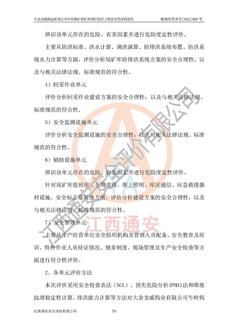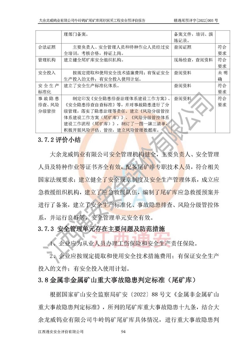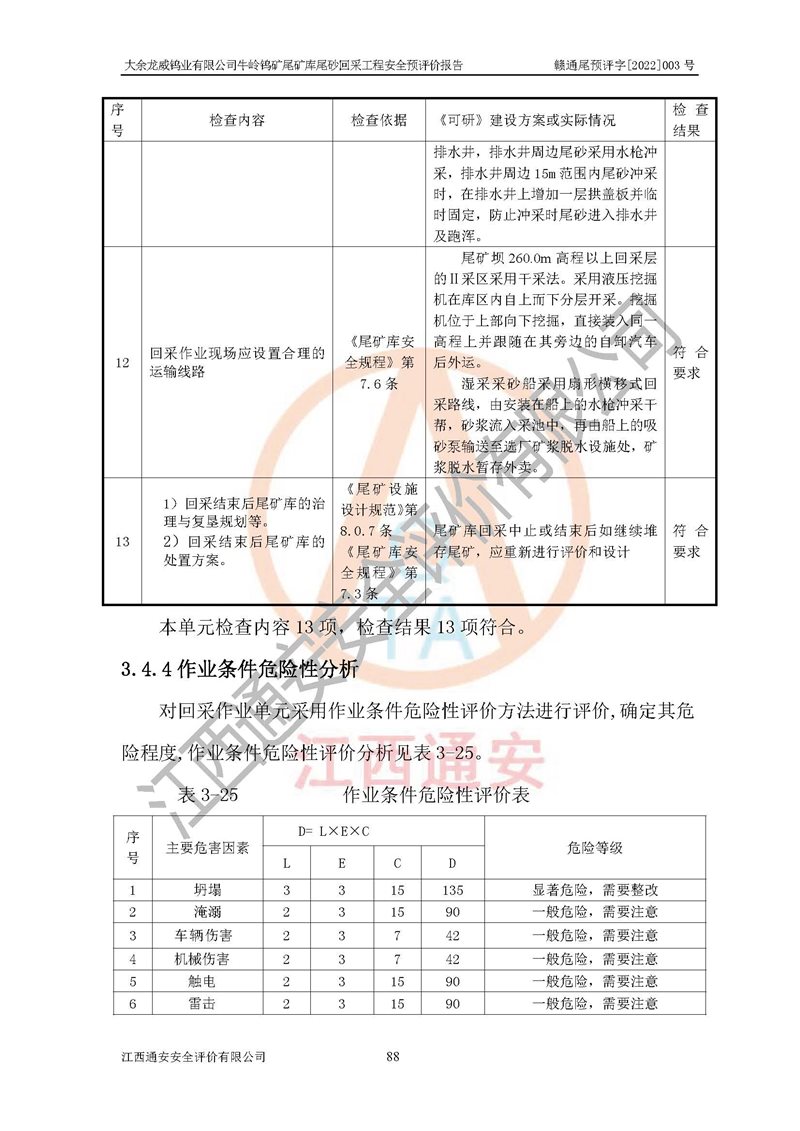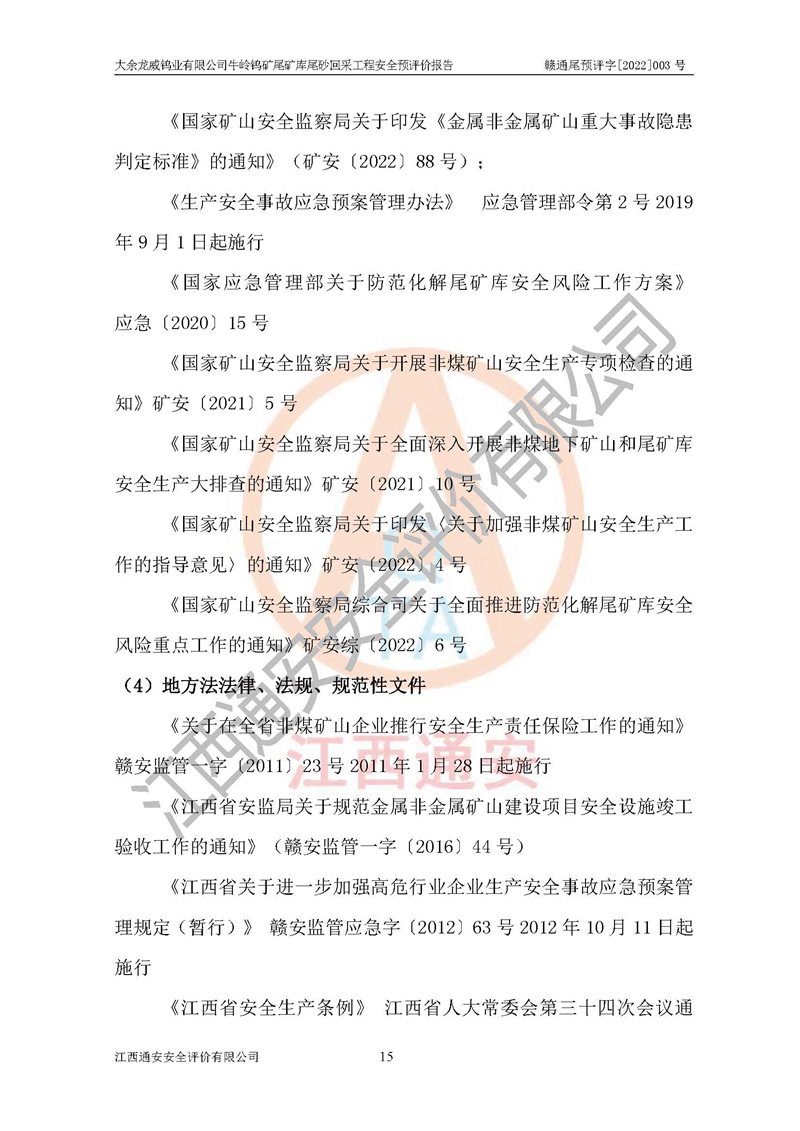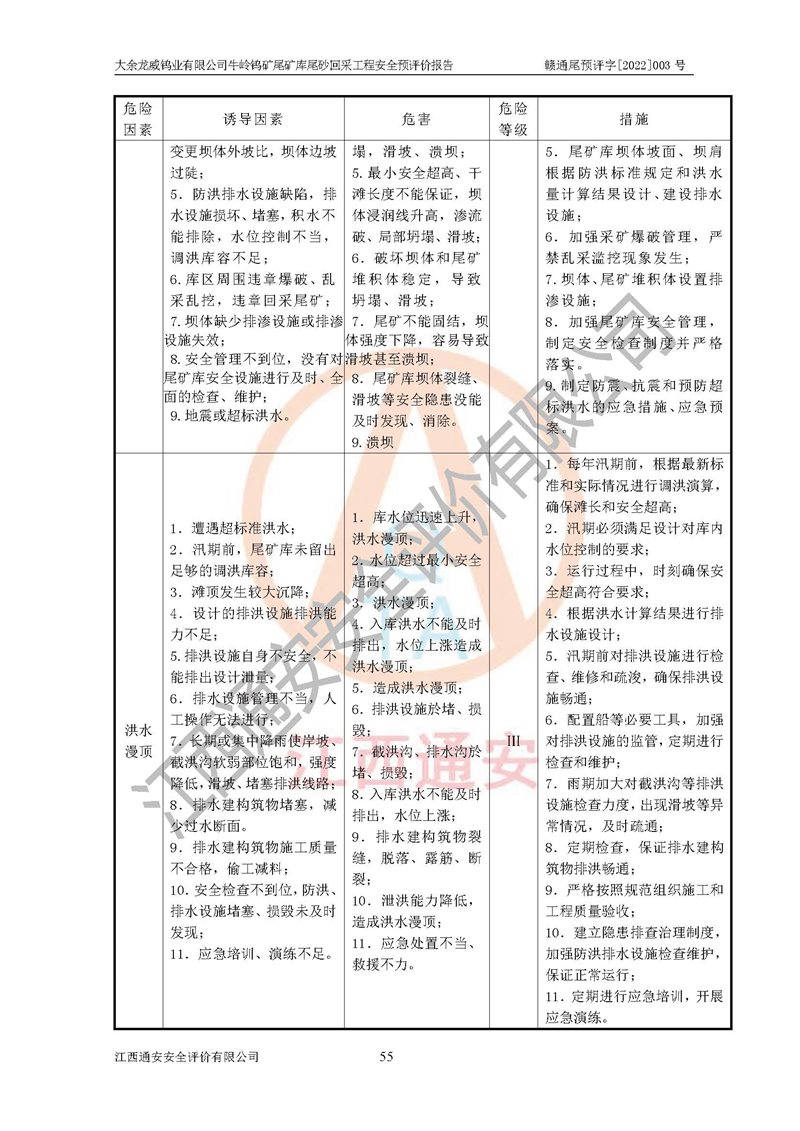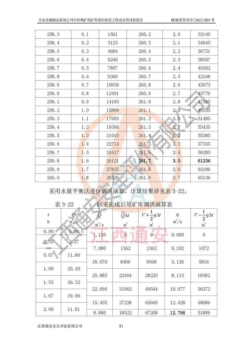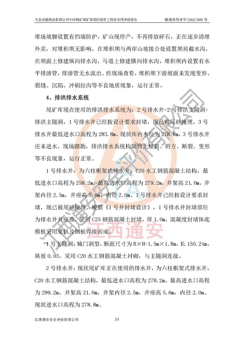 牛岭尾矿库于2006年1月由江西省冶金设计院设计,设计为初期透水堆石坝+上游式尾砂堆积坝,初期坝坝顶高程为262.0m,初期坝高20.5m,从262.0m至300.0m高程均采用尾砂堆坝,堆积坝高38m,总坝高为58.5m,总库容为200.08×104m3,尾矿库为四等库,考虑到下游已建有樟斗尾矿库,尾矿库提升一等至三等库,采用2座框架式排水井+排洪隧洞排洪排水;牛岭尾矿库2006年5月开工建设,共分为三个标段,2007年7月全面完工,2007年8月投入试运行,2008年6月,江西省赣华安全科技研究咨询中心有限公司出具了《大余龙威钨业有限公司牛岭钨锡矿尾矿库安全验收评价报告》;2008年9月进行竣工验收,2009年8月20日首次取得江西省安全生产监督管理局颁发的安全生产许可证,证书编号(赣)FM安许证字[2009]M1414号;为了完成“头顶库”治理,2017年7月,委托海湾工程有限公司完成了《增加排洪保障设计》,增设了3号框架式排水井+排洪隧洞,该项目2018年2月开工建设,2019年5月完工,2019年7月进行竣工验收,赣州永安安全生产科技服务有限公司出具了《大余龙威钨业有限公司牛岭钨矿尾矿库增加排洪保障设施工程安全设施竣工验收评价报告》;尾矿库安全生产许可证经多次延续,现安全生产许可证**期为2018年8月20日至2021年8月19日,尾矿库已于安全生产许可证到期时停止运行。 牛岭尾矿库现状坝顶高程为284.5m,还未达到原设计*终堆积高程300.0m,但初期坝下游2**为江西下垄钨业有限公司樟斗尾矿库,樟斗尾矿库下游为樟斗镇,两座尾矿库均为“头顶库”,为了降低尾矿库安全风险,减轻对下游樟斗尾矿库及樟斗镇居民的影响,大余龙威钨业有限公司决定采用“头顶库”五种综合治理措施(隐患治理、升级改造、闭库或销库、尾矿综合利用和下游居民搬迁)中的尾矿综合利用措施,对牛岭尾矿库库内尾砂**进行回采,回采尾砂作为建材外卖可取得**的经济效益,而且尾砂回采可降低坝高,提高尾矿库的安全稳定性。 2022年10月,大余龙威钨业有限公司委托四川百一勘察工程有限公司编制了《大余龙威钨业有限公司牛岭钨矿尾矿库(回采)工程地质勘察报告》,2022年10月,大余龙威钨业有限公司委托金建工程设计有限公司编制了《大余龙威钨业有限公司牛岭钨矿尾矿库尾砂回采工程可行性研究》,并委托我公司对该尾矿库尾砂回采工程项目进行安全预评价。 |