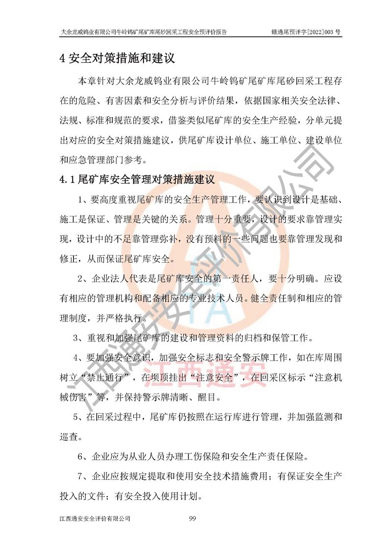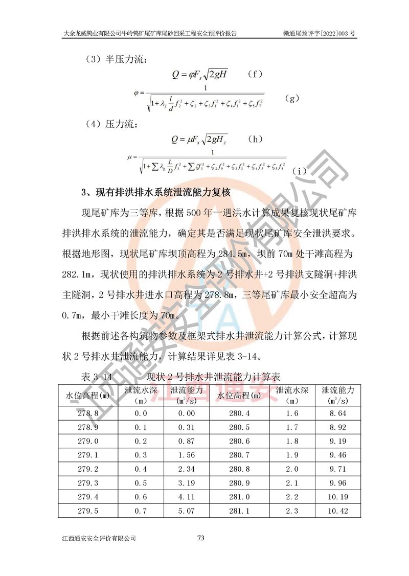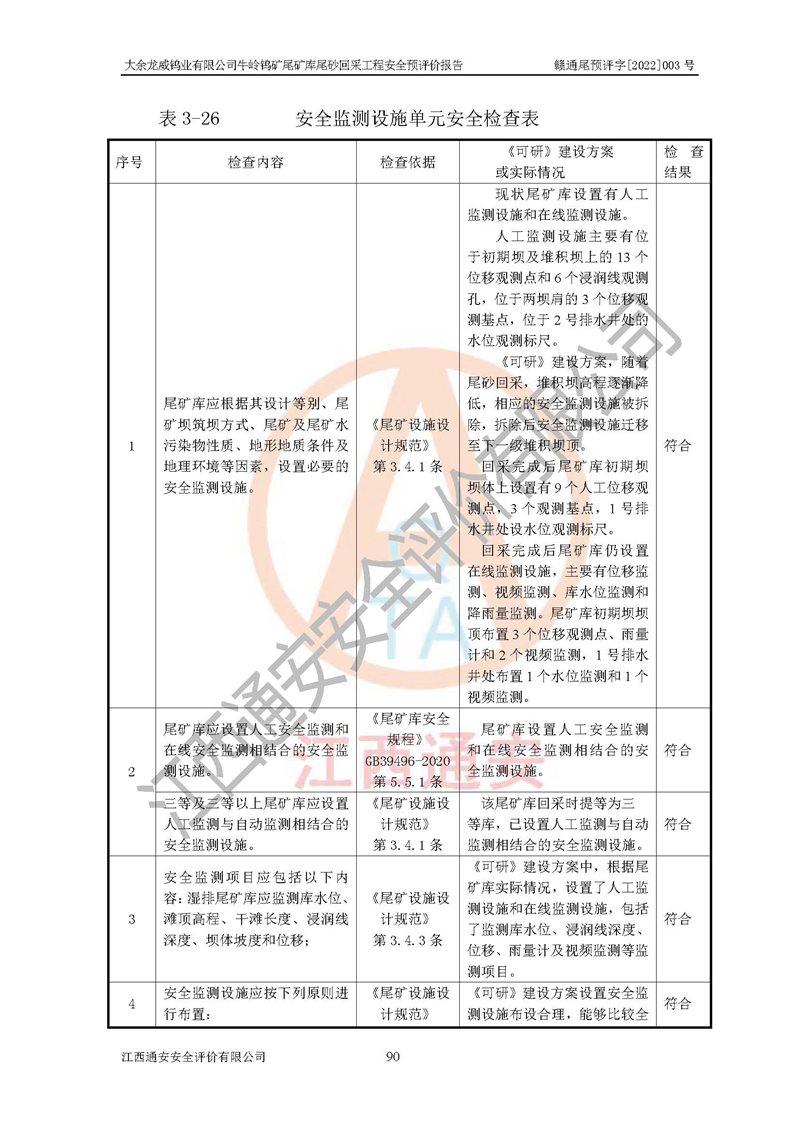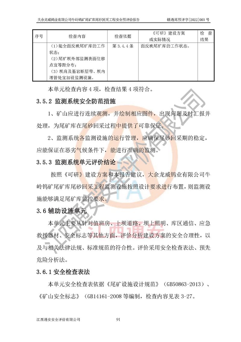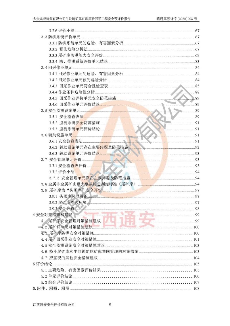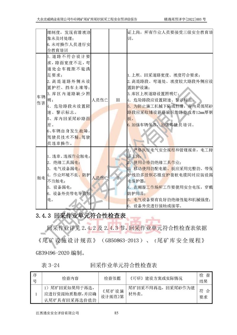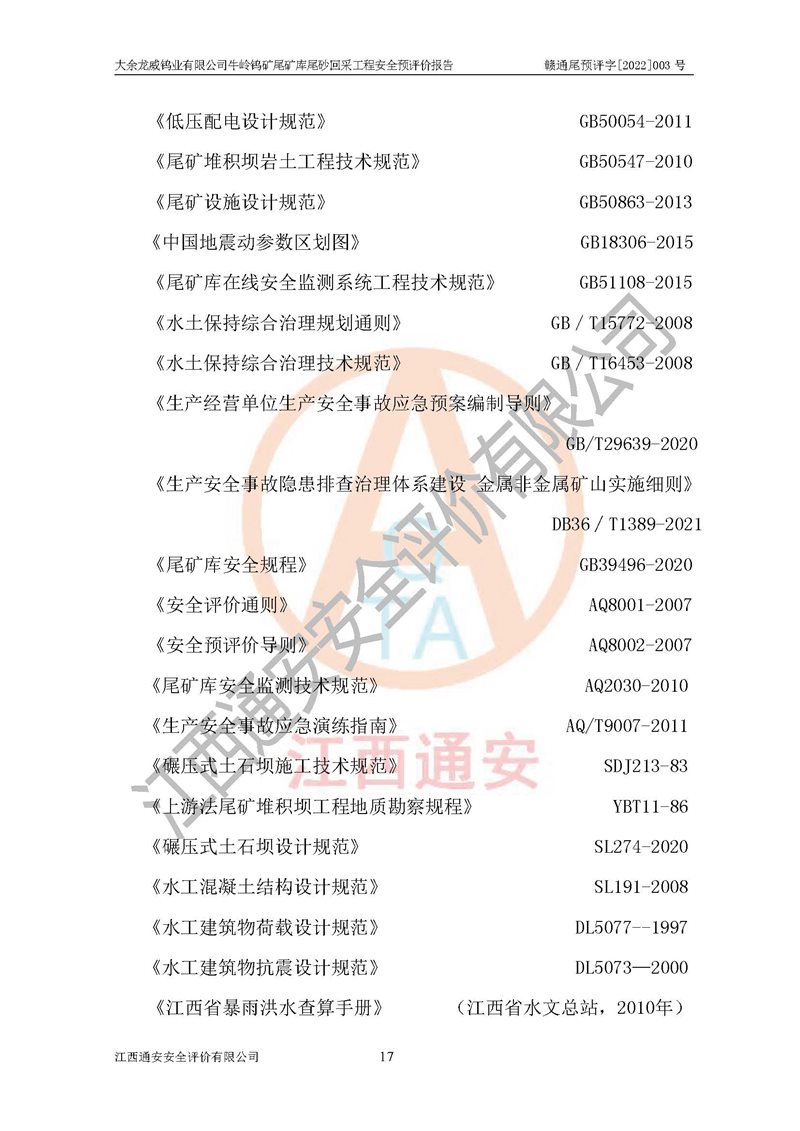 牛岭尾矿库于2006年1月由江西省冶金设计院设计,设计为初期透水堆石坝+上游式尾砂堆积坝,初期坝坝顶高程为262.0m,初期坝高20.5m,从262.0m至300.0m高程均采用尾砂堆坝,堆积坝高38m,总坝高为58.5m,总库容为200.08×104m3,尾矿库为四等库,考虑到下游已建有樟斗尾矿库,尾矿库提升一等至三等库,采用2座框架式排水井+排洪隧洞排洪排水;牛岭尾矿库2006年5月开工建设,共分为三个标段,2007年7月全面完工,2007年8月投入试运行,2008年6月,江西省赣华安全科技研究咨询中心有限公司出具了《大余龙威钨业有限公司牛岭钨锡矿尾矿库安全验收评价报告》;2008年9月进行竣工验收,2009年8月20日首次取得江西省安全生产监督管理局颁发的安全生产许可证,证书编号(赣)FM安许证字[2009]M1414号;为了完成“头顶库”治理,2017年7月,委托海湾工程有限公司完成了《增加排洪保障设计》,增设了3号框架式排水井+排洪隧洞,该项目2018年2月开工建设,2019年5月完工,2019年7月进行竣工验收,赣州永安安全生产科技服务有限公司出具了《大余龙威钨业有限公司牛岭钨矿尾矿库增加排洪保障设施工程安全设施竣工验收评价报告》;尾矿库安全生产许可证经多次延续,现安全生产许可证**期为2018年8月20日至2021年8月19日,尾矿库已于安全生产许可证到期时停止运行。 牛岭尾矿库现状坝顶高程为284.5m,还未达到原设计*终堆积高程300.0m,但初期坝下游2**为江西下垄钨业有限公司樟斗尾矿库,樟斗尾矿库下游为樟斗镇,两座尾矿库均为“头顶库”,为了降低尾矿库安全风险,减轻对下游樟斗尾矿库及樟斗镇居民的影响,大余龙威钨业有限公司决定采用“头顶库”五种综合治理措施(隐患治理、升级改造、闭库或销库、尾矿综合利用和下游居民搬迁)中的尾矿综合利用措施,对牛岭尾矿库库内尾砂**进行回采,回采尾砂作为建材外卖可取得**的经济效益,而且尾砂回采可降低坝高,提高尾矿库的安全稳定性。 2022年10月,大余龙威钨业有限公司委托四川百一勘察工程有限公司编制了《大余龙威钨业有限公司牛岭钨矿尾矿库(回采)工程地质勘察报告》,2022年10月,大余龙威钨业有限公司委托金建工程设计有限公司编制了《大余龙威钨业有限公司牛岭钨矿尾矿库尾砂回采工程可行性研究》,并委托我公司对该尾矿库尾砂回采工程项目进行安全预评价。 |