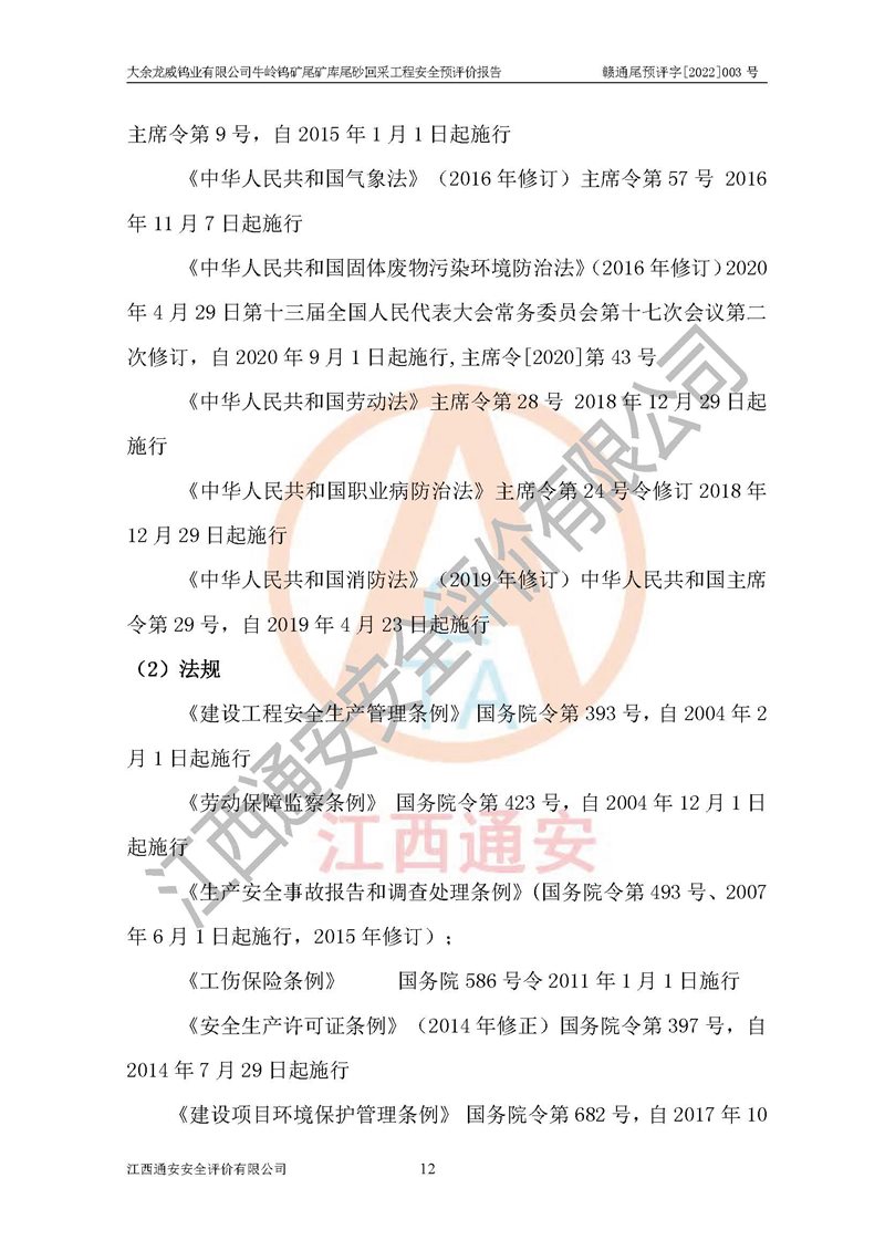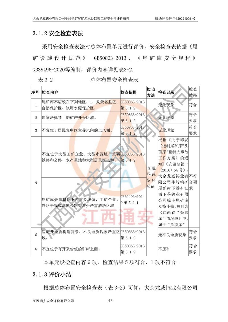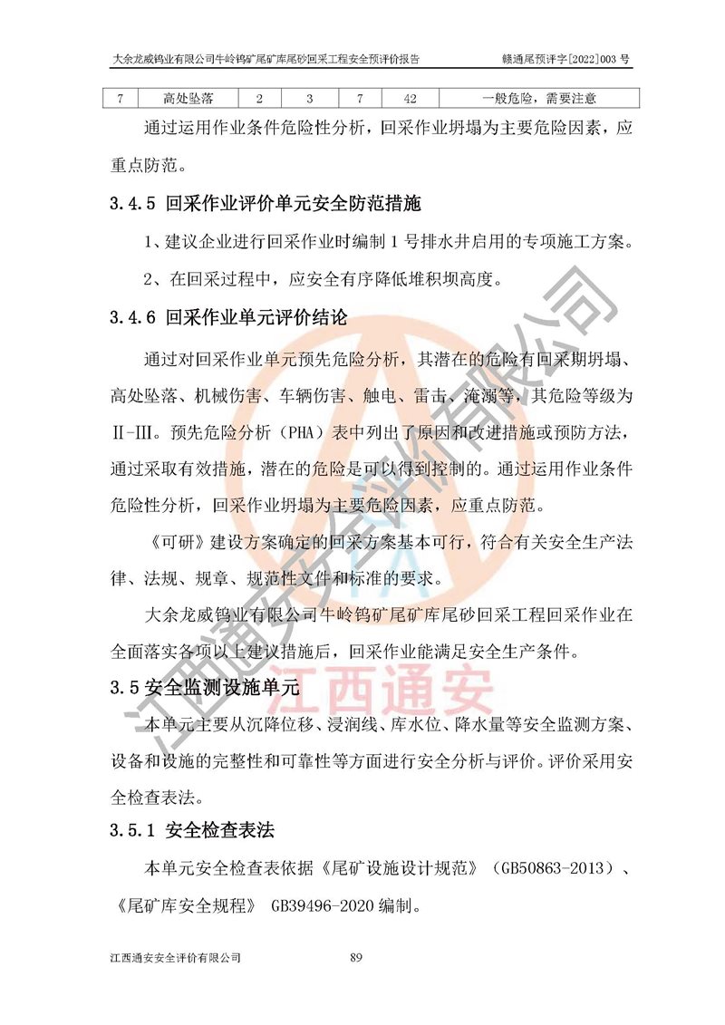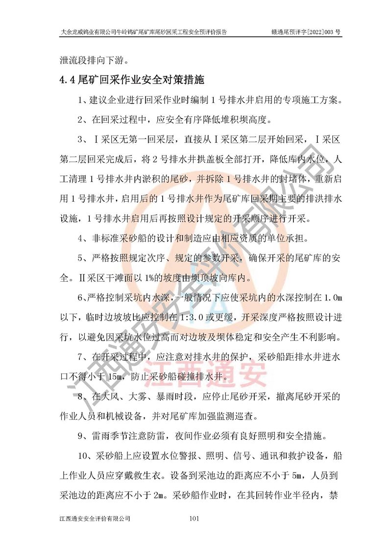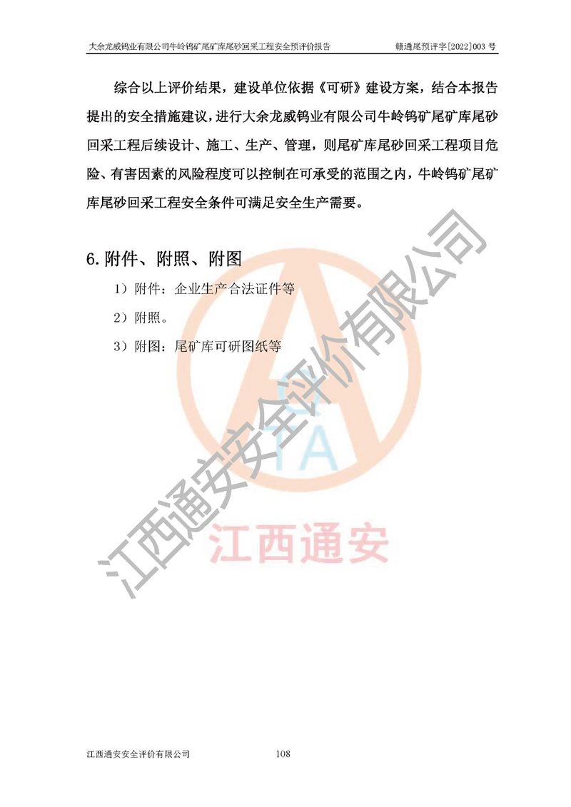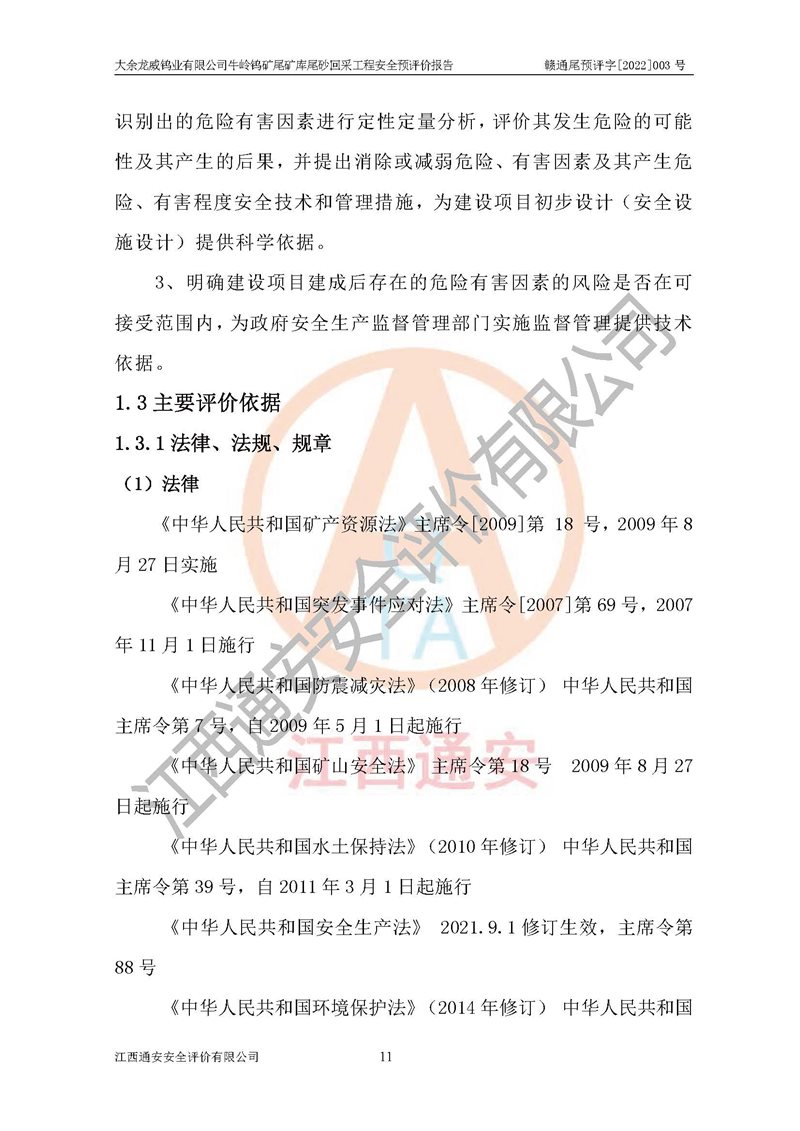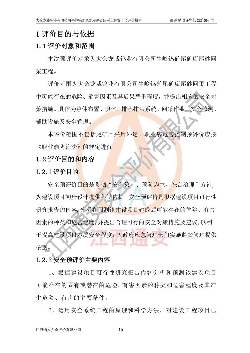 牛岭尾矿库于2006年1月由江西省冶金设计院设计,设计为初期透水堆石坝+上游式尾砂堆积坝,初期坝坝顶高程为262.0m,初期坝高20.5m,从262.0m至300.0m高程均采用尾砂堆坝,堆积坝高38m,总坝高为58.5m,总库容为200.08×104m3,尾矿库为四等库,考虑到下游已建有樟斗尾矿库,尾矿库提升一等至三等库,采用2座框架式排水井+排洪隧洞排洪排水;牛岭尾矿库2006年5月开工建设,共分为三个标段,2007年7月全面完工,2007年8月投入试运行,2008年6月,江西省赣华安全科技研究咨询中心有限公司出具了《大余龙威钨业有限公司牛岭钨锡矿尾矿库安全验收评价报告》;2008年9月进行竣工验收,2009年8月20日首次取得江西省安全生产监督管理局颁发的安全生产许可证,证书编号(赣)FM安许证字[2009]M1414号;为了完成“头顶库”治理,2017年7月,委托海湾工程有限公司完成了《增加排洪保障设计》,增设了3号框架式排水井+排洪隧洞,该项目2018年2月开工建设,2019年5月完工,2019年7月进行竣工验收,赣州永安安全生产科技服务有限公司出具了《大余龙威钨业有限公司牛岭钨矿尾矿库增加排洪保障设施工程安全设施竣工验收评价报告》;尾矿库安全生产许可证经多次延续,现安全生产许可证**期为2018年8月20日至2021年8月19日,尾矿库已于安全生产许可证到期时停止运行。 牛岭尾矿库现状坝顶高程为284.5m,还未达到原设计*终堆积高程300.0m,但初期坝下游2**为江西下垄钨业有限公司樟斗尾矿库,樟斗尾矿库下游为樟斗镇,两座尾矿库均为“头顶库”,为了降低尾矿库安全风险,减轻对下游樟斗尾矿库及樟斗镇居民的影响,大余龙威钨业有限公司决定采用“头顶库”五种综合治理措施(隐患治理、升级改造、闭库或销库、尾矿综合利用和下游居民搬迁)中的尾矿综合利用措施,对牛岭尾矿库库内尾砂**进行回采,回采尾砂作为建材外卖可取得**的经济效益,而且尾砂回采可降低坝高,提高尾矿库的安全稳定性。 2022年10月,大余龙威钨业有限公司委托四川百一勘察工程有限公司编制了《大余龙威钨业有限公司牛岭钨矿尾矿库(回采)工程地质勘察报告》,2022年10月,大余龙威钨业有限公司委托金建工程设计有限公司编制了《大余龙威钨业有限公司牛岭钨矿尾矿库尾砂回采工程可行性研究》,并委托我公司对该尾矿库尾砂回采工程项目进行安全预评价。 |