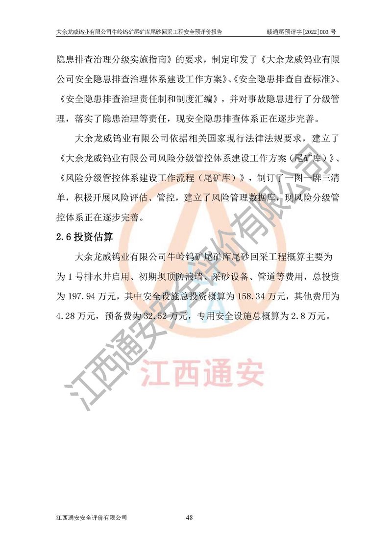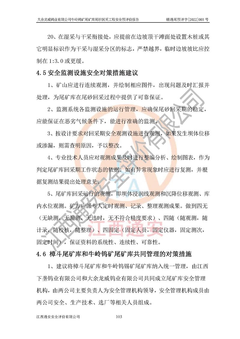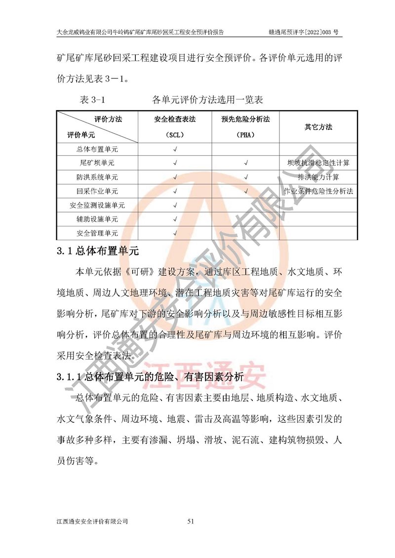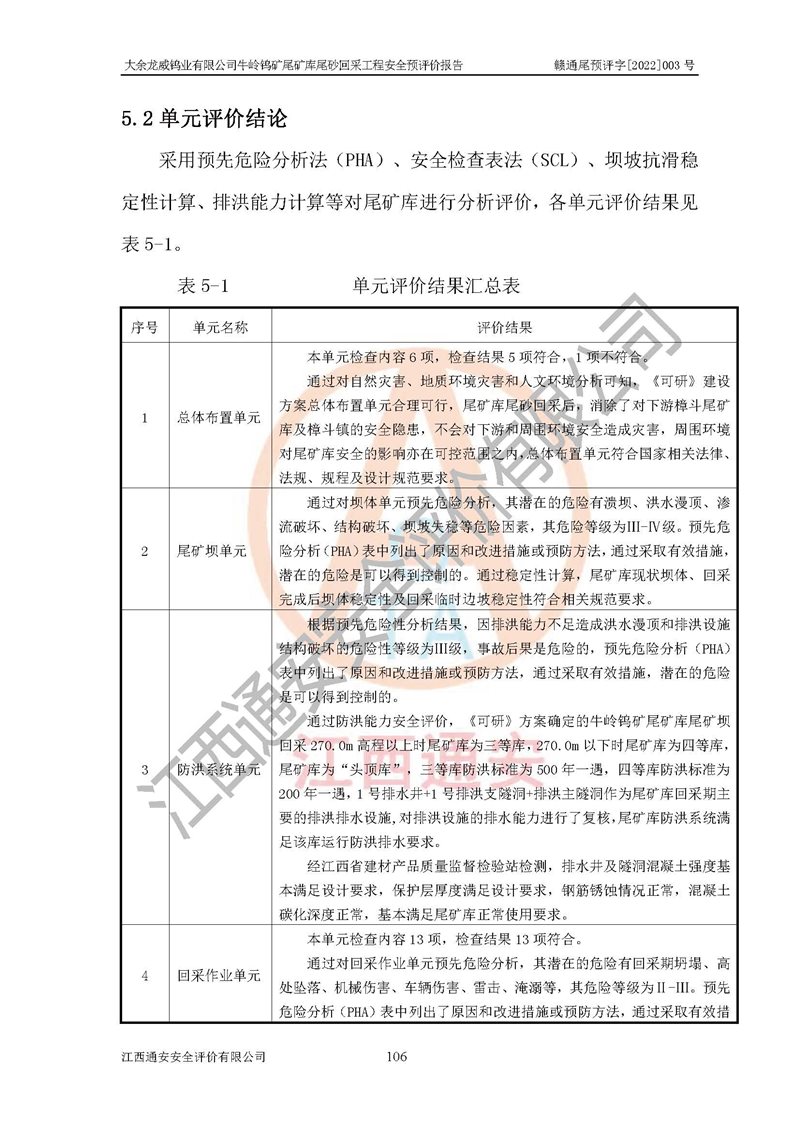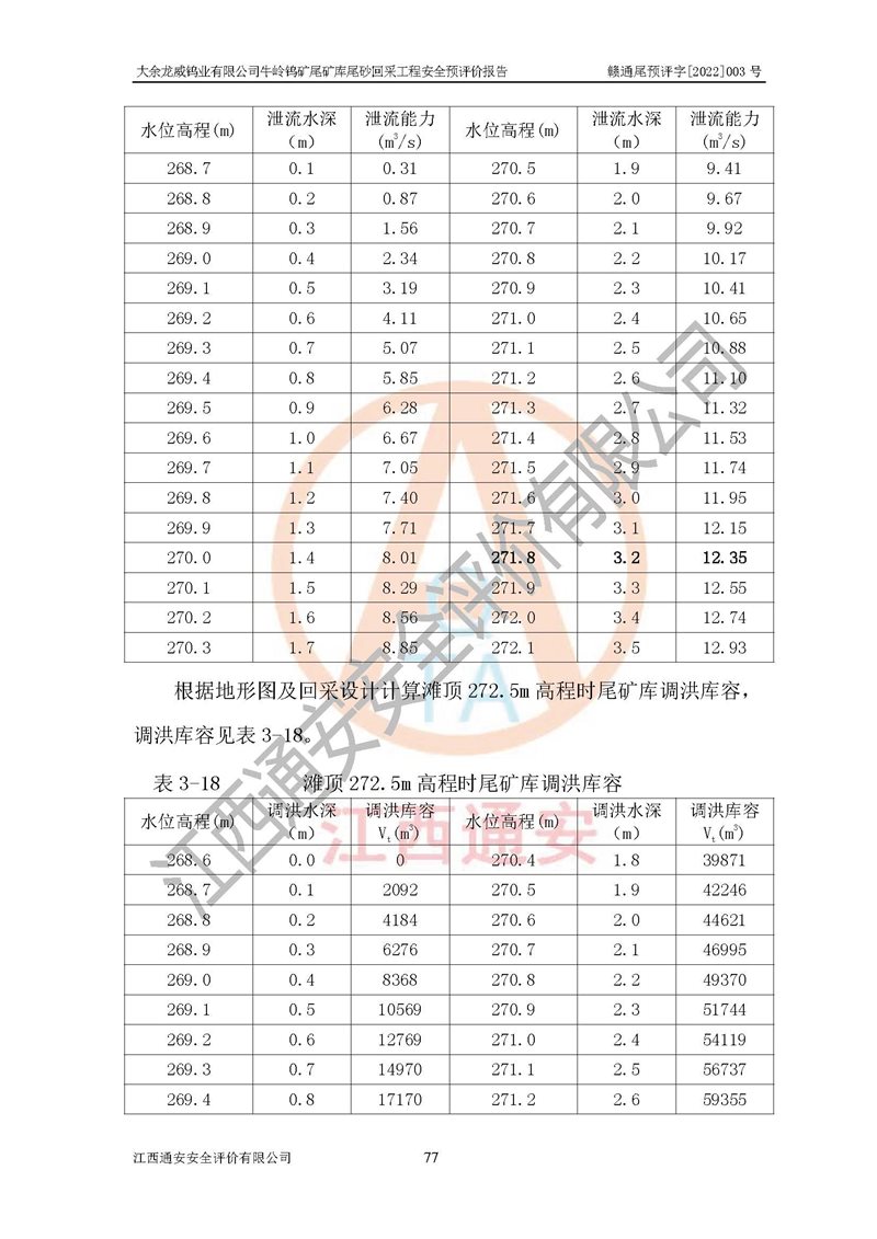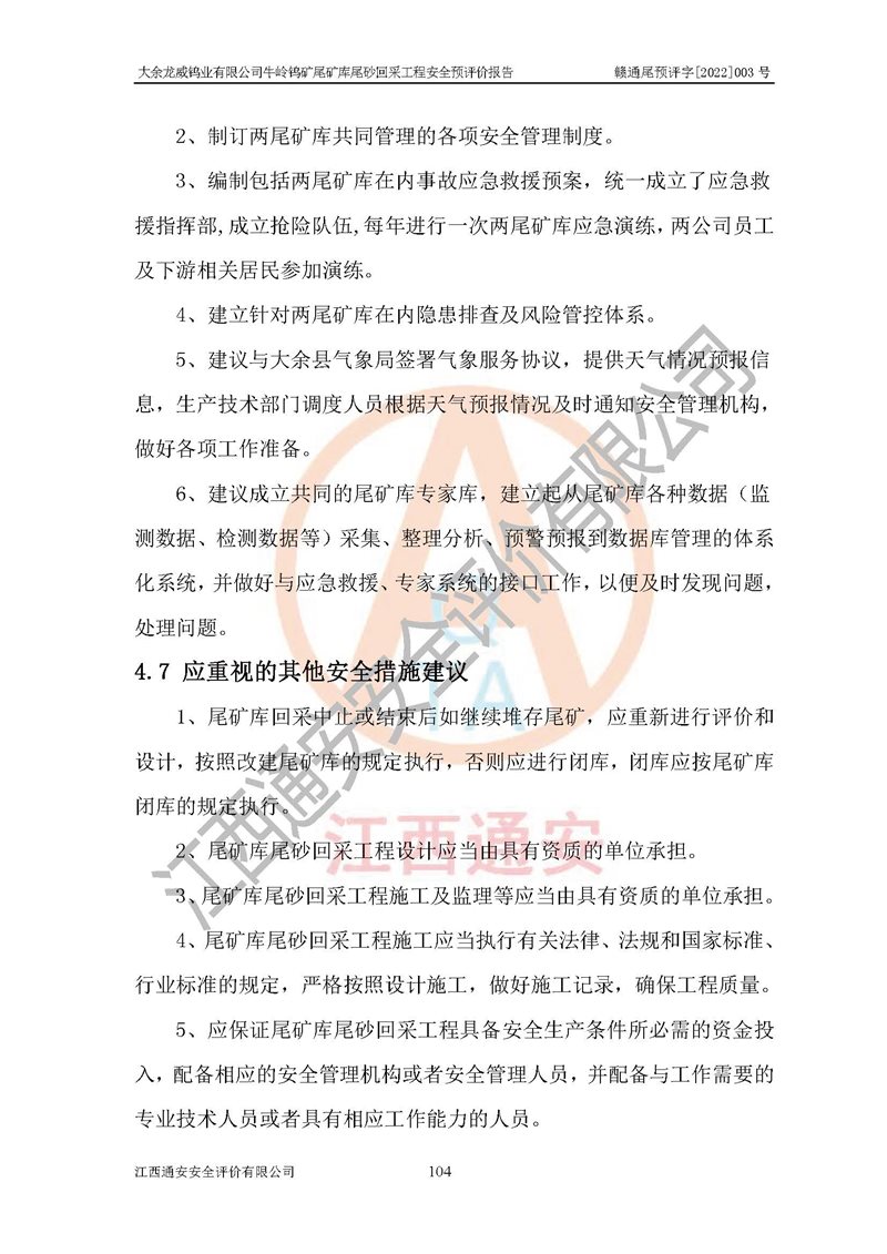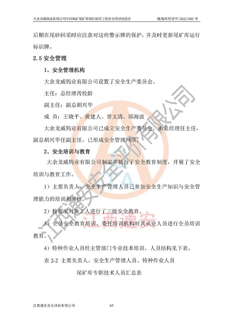 牛岭尾矿库于2006年1月由江西省冶金设计院设计,设计为初期透水堆石坝+上游式尾砂堆积坝,初期坝坝顶高程为262.0m,初期坝高20.5m,从262.0m至300.0m高程均采用尾砂堆坝,堆积坝高38m,总坝高为58.5m,总库容为200.08×104m3,尾矿库为四等库,考虑到下游已建有樟斗尾矿库,尾矿库提升一等至三等库,采用2座框架式排水井+排洪隧洞排洪排水;牛岭尾矿库2006年5月开工建设,共分为三个标段,2007年7月全面完工,2007年8月投入试运行,2008年6月,江西省赣华安全科技研究咨询中心有限公司出具了《大余龙威钨业有限公司牛岭钨锡矿尾矿库安全验收评价报告》;2008年9月进行竣工验收,2009年8月20日首次取得江西省安全生产监督管理局颁发的安全生产许可证,证书编号(赣)FM安许证字[2009]M1414号;为了完成“头顶库”治理,2017年7月,委托海湾工程有限公司完成了《增加排洪保障设计》,增设了3号框架式排水井+排洪隧洞,该项目2018年2月开工建设,2019年5月完工,2019年7月进行竣工验收,赣州永安安全生产科技服务有限公司出具了《大余龙威钨业有限公司牛岭钨矿尾矿库增加排洪保障设施工程安全设施竣工验收评价报告》;尾矿库安全生产许可证经多次延续,现安全生产许可证**期为2018年8月20日至2021年8月19日,尾矿库已于安全生产许可证到期时停止运行。 牛岭尾矿库现状坝顶高程为284.5m,还未达到原设计*终堆积高程300.0m,但初期坝下游2**为江西下垄钨业有限公司樟斗尾矿库,樟斗尾矿库下游为樟斗镇,两座尾矿库均为“头顶库”,为了降低尾矿库安全风险,减轻对下游樟斗尾矿库及樟斗镇居民的影响,大余龙威钨业有限公司决定采用“头顶库”五种综合治理措施(隐患治理、升级改造、闭库或销库、尾矿综合利用和下游居民搬迁)中的尾矿综合利用措施,对牛岭尾矿库库内尾砂**进行回采,回采尾砂作为建材外卖可取得**的经济效益,而且尾砂回采可降低坝高,提高尾矿库的安全稳定性。 2022年10月,大余龙威钨业有限公司委托四川百一勘察工程有限公司编制了《大余龙威钨业有限公司牛岭钨矿尾矿库(回采)工程地质勘察报告》,2022年10月,大余龙威钨业有限公司委托金建工程设计有限公司编制了《大余龙威钨业有限公司牛岭钨矿尾矿库尾砂回采工程可行性研究》,并委托我公司对该尾矿库尾砂回采工程项目进行安全预评价。 |
