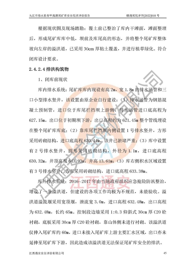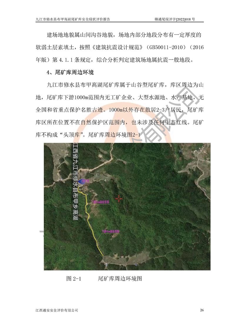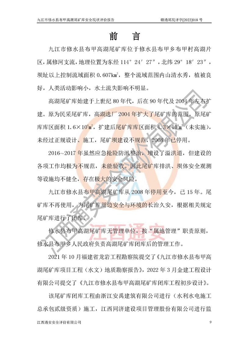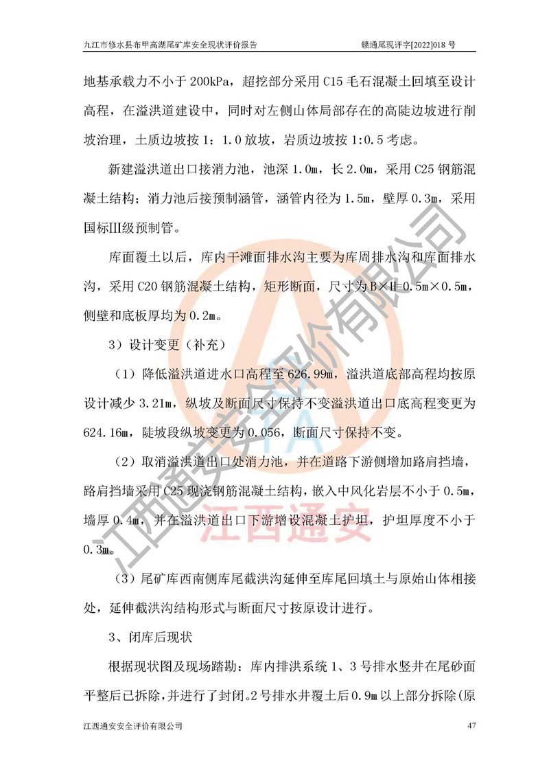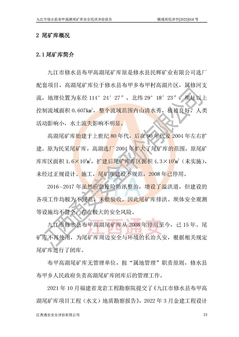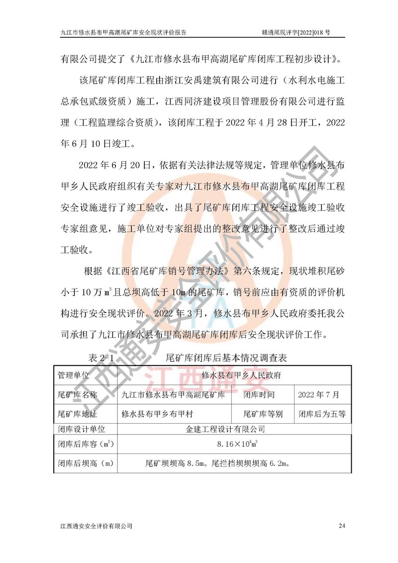 九江市修水县布甲高湖尾矿库位于修水县布甲乡布甲村高湖片区,属修河支流,地理位置为东经114°24′27″,北纬29°18′23″,坝址以上控制流域面积0.607km2,整个流域范围内山清水秀,植被良好,人类活动影响小,水土流失影响不明显。 高湖尾矿库始建于上世纪80年代,后在90年代及2004年左右扩建。原为民采尾矿库,高湖选厂2004年扩大了尾矿库的范围,原尾矿库库区面积1.6×104m2,扩建后尾矿库库区面积4.3×104m2(未实施),未经过正规设计、施工,尾矿坝建设不规范,2008年已停用。 2016~2017年虽然应急抢险防汛整治,增设了溢洪道,但建设的各项工作均极为不规范,未能验收。因此尾矿库排洪、坝体安全观测等设施均不健全,存在**的安全风险。 九江市修水县布甲高湖尾矿库从2008年停用至今,已15年。尾矿库不再使用,为尾矿库周边安全与环境的长治久安,根据相关规定尾矿库进行了闭库。 修水县布甲高湖尾矿库无管理单位,按“属地管理”职责原则,修水县布甲乡人民**负责高湖尾矿库闭库后的管理工作。 2021年10月福建省龙岩工程勘察院提交了《九江市修水县布甲高湖尾矿库项目工程(水文)地质勘察报告》,2022年3月金建工程设计有限公司提交了《九江市修水县布甲高湖尾矿库闭库工程初步设计》。 该尾矿库闭库工程由浙江安禹建筑有限公司进行(水利水电施工总承包贰级资质)施工,江西同济建设项目管理股份有限公司进行监理(工程监理综合资质),该闭库工程于2022年4月28日开工,2022年6月10日竣工。 |