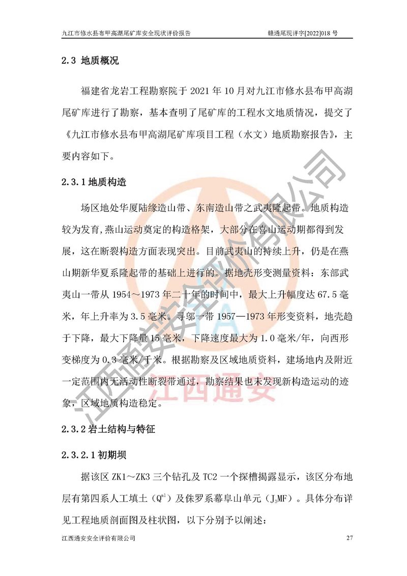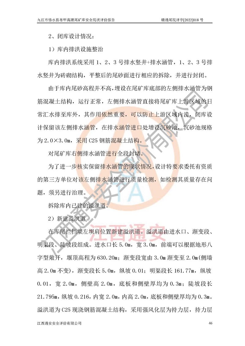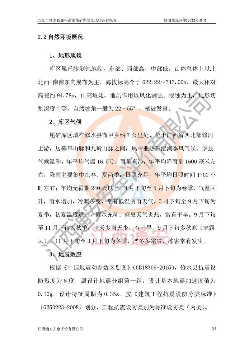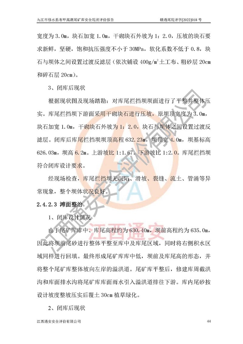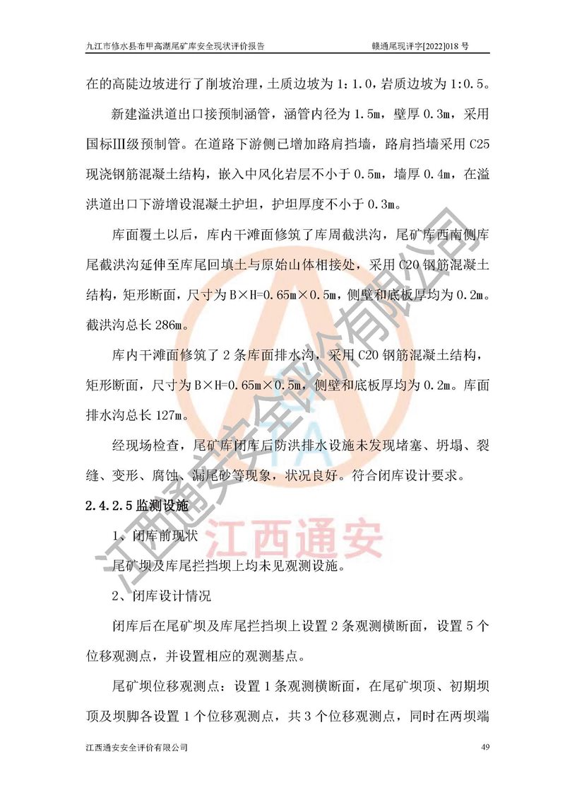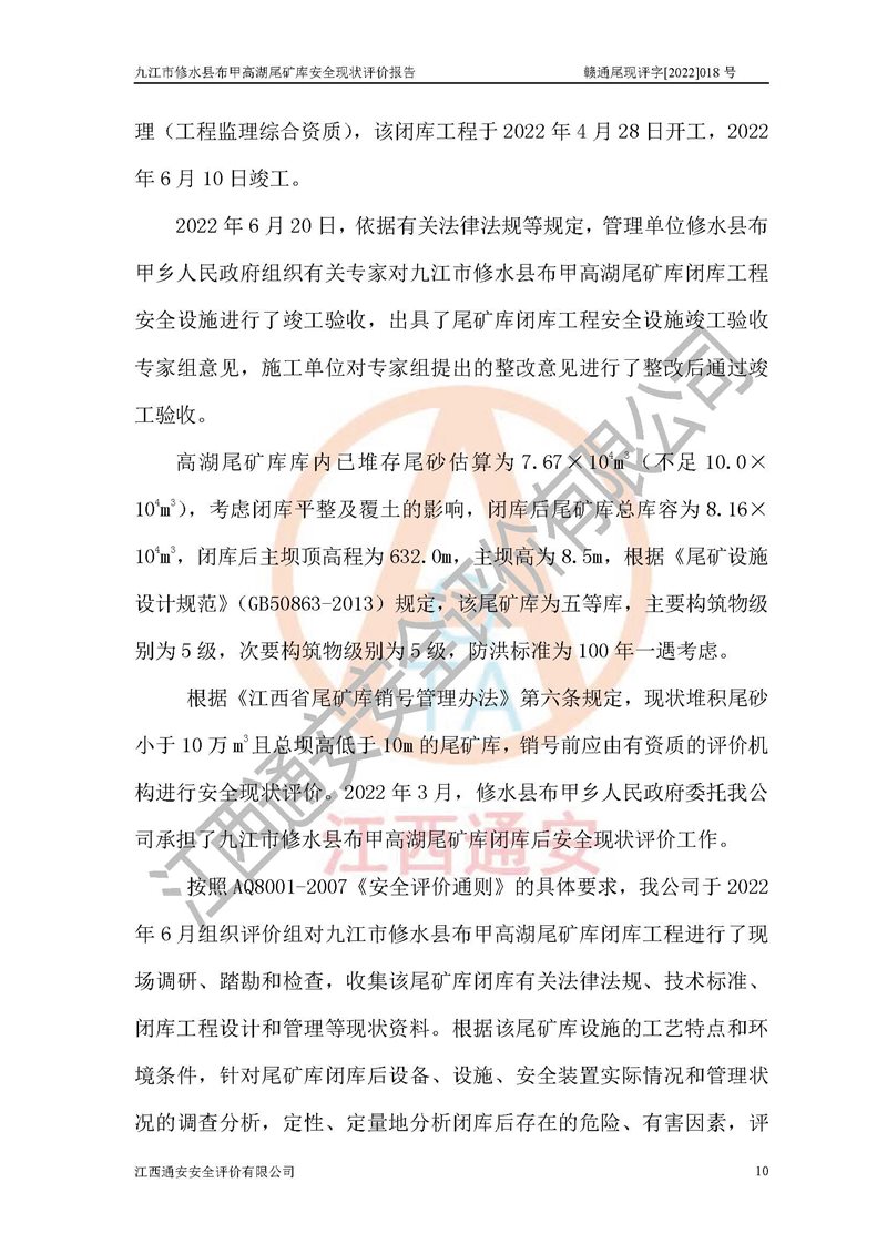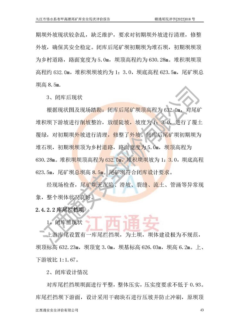 九江市修水县布甲高湖尾矿库位于修水县布甲乡布甲村高湖片区,属修河支流,地理位置为东经114°24′27″,北纬29°18′23″,坝址以上控制流域面积0.607km2,整个流域范围内山清水秀,植被良好,人类活动影响小,水土流失影响不明显。 高湖尾矿库始建于上世纪80年代,后在90年代及2004年左右扩建。原为民采尾矿库,高湖选厂2004年扩大了尾矿库的范围,原尾矿库库区面积1.6×104m2,扩建后尾矿库库区面积4.3×104m2(未实施),未经过正规设计、施工,尾矿坝建设不规范,2008年已停用。 2016~2017年虽然应急抢险防汛整治,增设了溢洪道,但建设的各项工作均极为不规范,未能验收。因此尾矿库排洪、坝体安全观测等设施均不健全,存在**的安全风险。 九江市修水县布甲高湖尾矿库从2008年停用至今,已15年。尾矿库不再使用,为尾矿库周边安全与环境的长治久安,根据相关规定尾矿库进行了闭库。 修水县布甲高湖尾矿库无管理单位,按“属地管理”职责原则,修水县布甲乡人民**负责高湖尾矿库闭库后的管理工作。 2021年10月福建省龙岩工程勘察院提交了《九江市修水县布甲高湖尾矿库项目工程(水文)地质勘察报告》,2022年3月金建工程设计有限公司提交了《九江市修水县布甲高湖尾矿库闭库工程初步设计》。 该尾矿库闭库工程由浙江安禹建筑有限公司进行(水利水电施工总承包贰级资质)施工,江西同济建设项目管理股份有限公司进行监理(工程监理综合资质),该闭库工程于2022年4月28日开工,2022年6月10日竣工。 |
