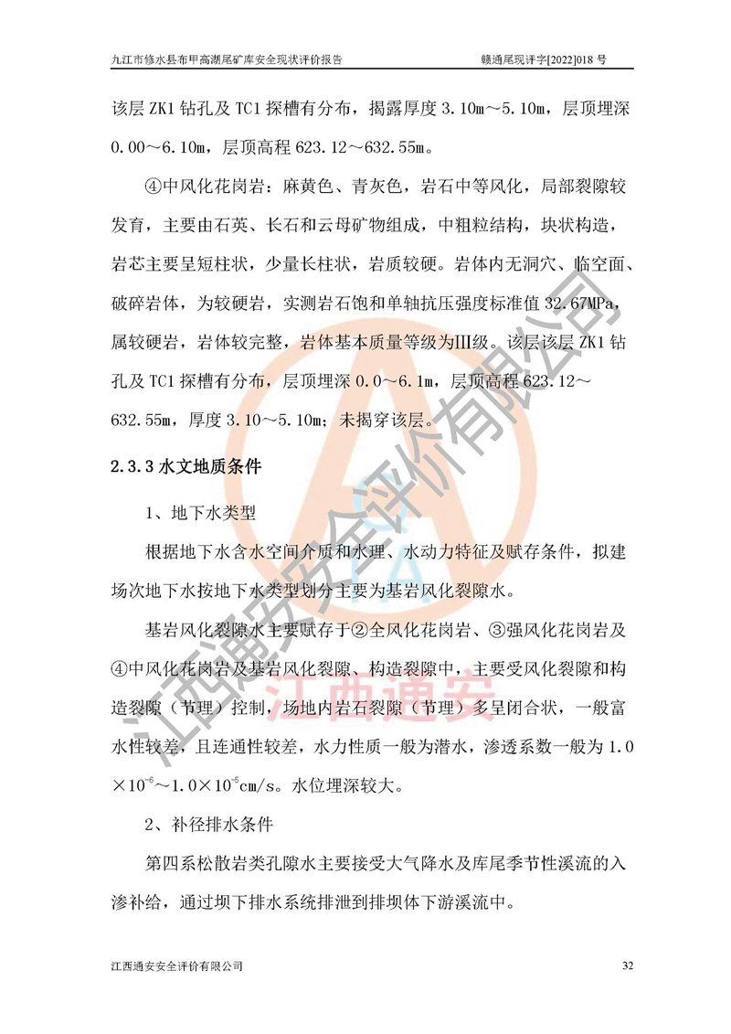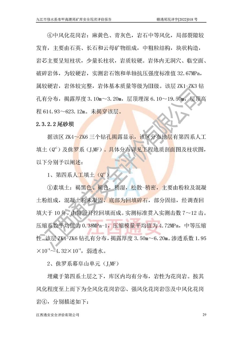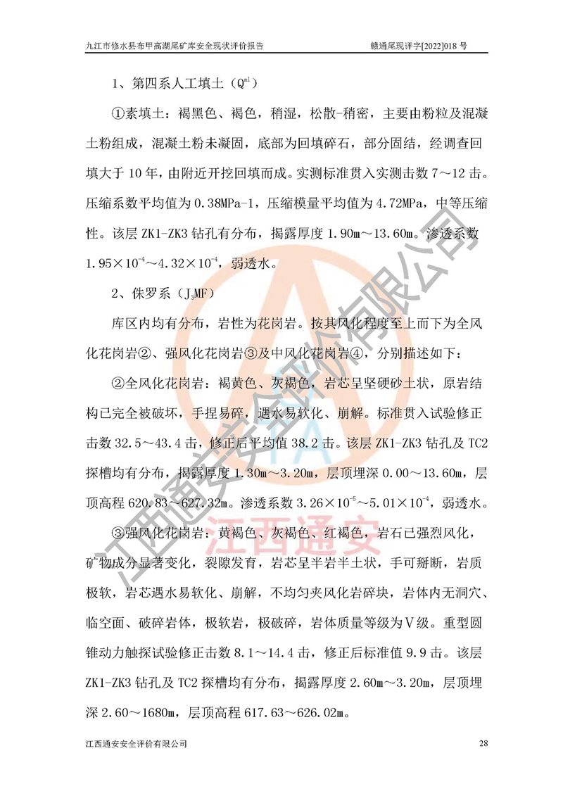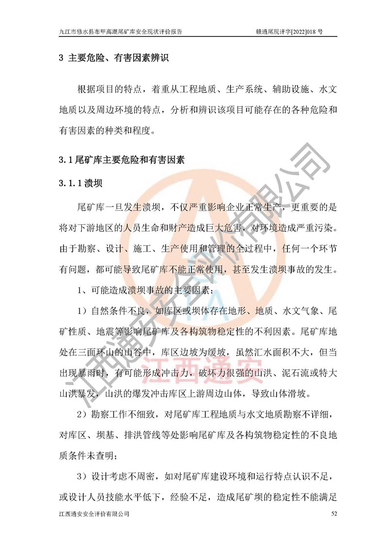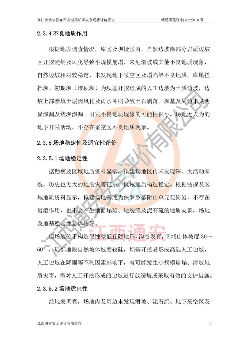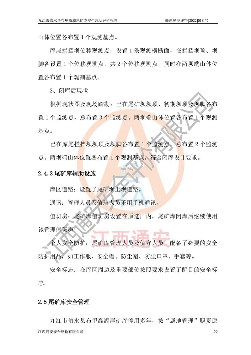 九江市修水县布甲高湖尾矿库位于修水县布甲乡布甲村高湖片区,属修河支流,地理位置为东经114°24′27″,北纬29°18′23″,坝址以上控制流域面积0.607km2,整个流域范围内山清水秀,植被良好,人类活动影响小,水土流失影响不明显。 高湖尾矿库始建于上世纪80年代,后在90年代及2004年左右扩建。原为民采尾矿库,高湖选厂2004年扩大了尾矿库的范围,原尾矿库库区面积1.6×104m2,扩建后尾矿库库区面积4.3×104m2(未实施),未经过正规设计、施工,尾矿坝建设不规范,2008年已停用。 2016~2017年虽然应急抢险防汛整治,增设了溢洪道,但建设的各项工作均极为不规范,未能验收。因此尾矿库排洪、坝体安全观测等设施均不健全,存在**的安全风险。 九江市修水县布甲高湖尾矿库从2008年停用至今,已15年。尾矿库不再使用,为尾矿库周边安全与环境的长治久安,根据相关规定尾矿库进行了闭库。 修水县布甲高湖尾矿库无管理单位,按“属地管理”职责原则,修水县布甲乡人民**负责高湖尾矿库闭库后的管理工作。 2021年10月福建省龙岩工程勘察院提交了《九江市修水县布甲高湖尾矿库项目工程(水文)地质勘察报告》,2022年3月金建工程设计有限公司提交了《九江市修水县布甲高湖尾矿库闭库工程初步设计》。 该尾矿库闭库工程由浙江安禹建筑有限公司进行(水利水电施工总承包贰级资质)施工,江西同济建设项目管理股份有限公司进行监理(工程监理综合资质),该闭库工程于2022年4月28日开工,2022年6月10日竣工。 |