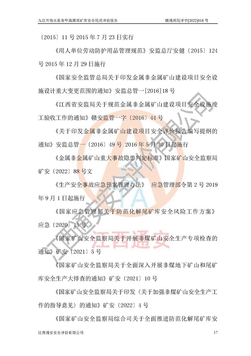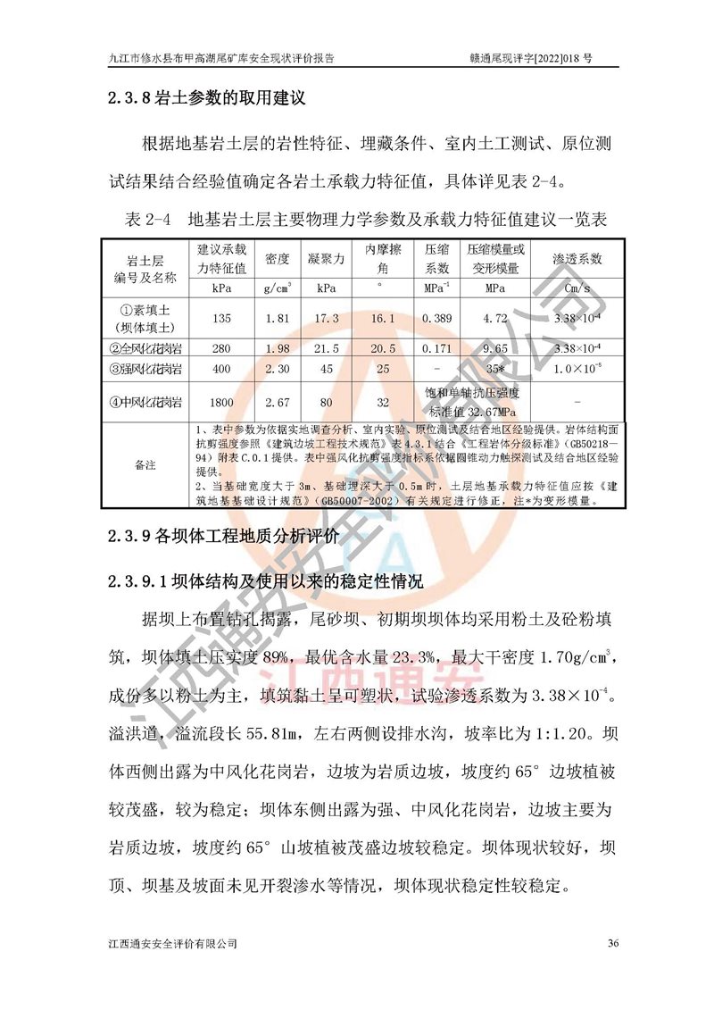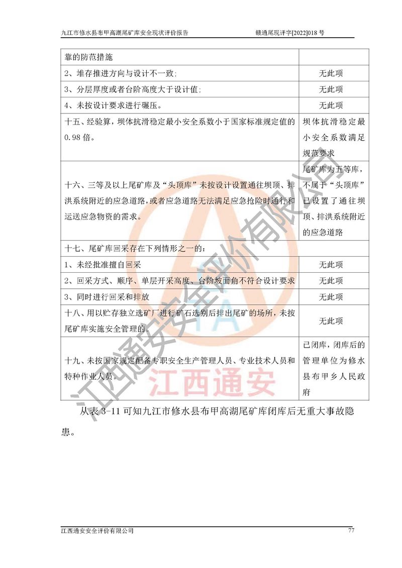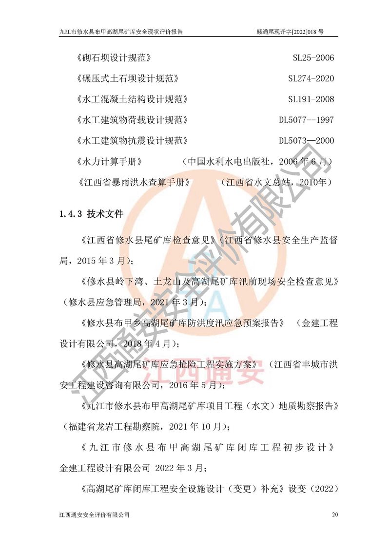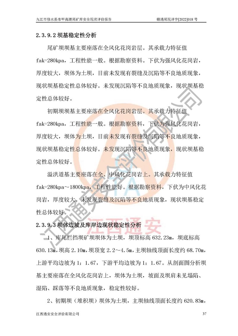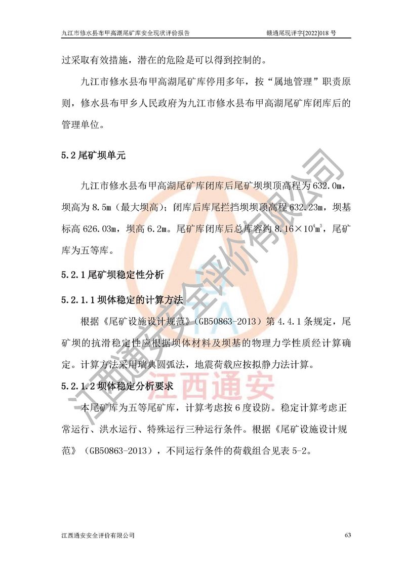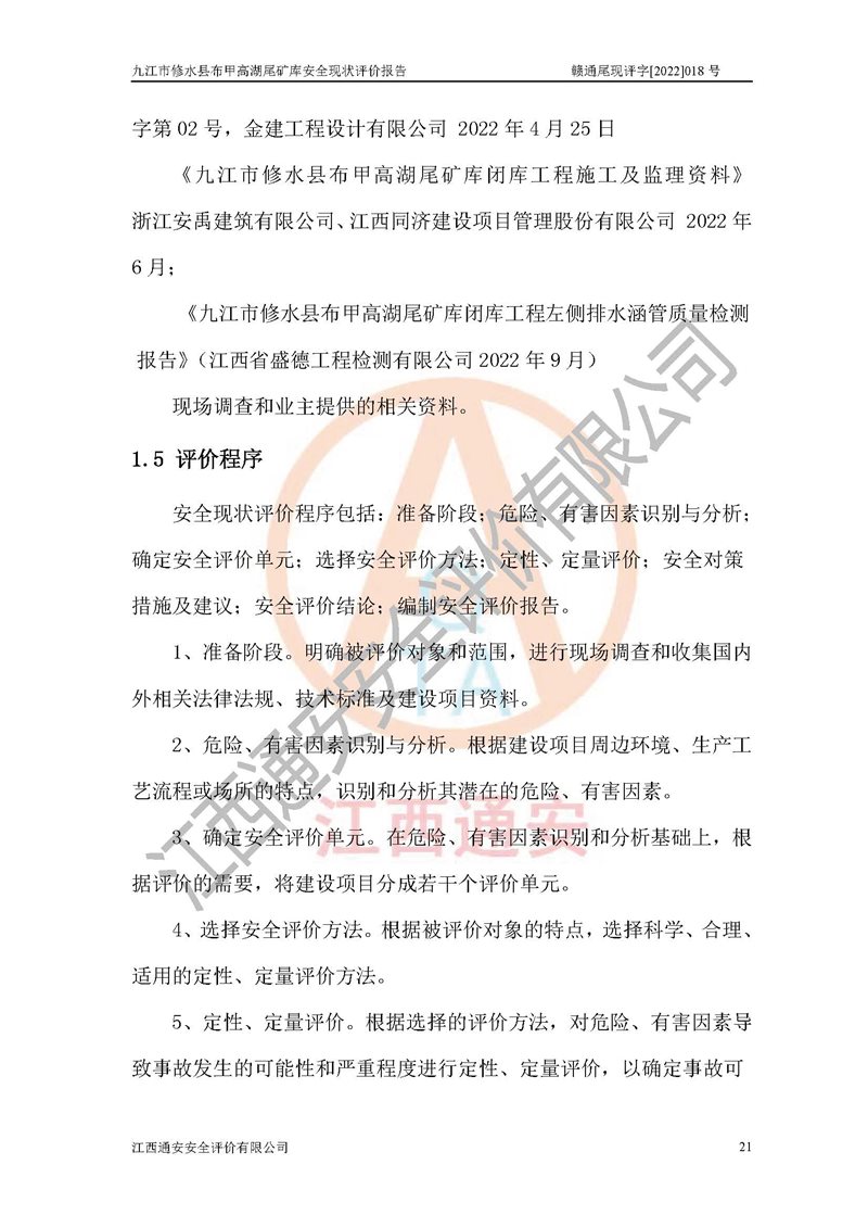 九江市修水县布甲高湖尾矿库位于修水县布甲乡布甲村高湖片区,属修河支流,地理位置为东经114°24′27″,北纬29°18′23″,坝址以上控制流域面积0.607km2,整个流域范围内山清水秀,植被良好,人类活动影响小,水土流失影响不明显。 高湖尾矿库始建于上世纪80年代,后在90年代及2004年左右扩建。原为民采尾矿库,高湖选厂2004年扩大了尾矿库的范围,原尾矿库库区面积1.6×104m2,扩建后尾矿库库区面积4.3×104m2(未实施),未经过正规设计、施工,尾矿坝建设不规范,2008年已停用。 2016~2017年虽然应急抢险防汛整治,增设了溢洪道,但建设的各项工作均极为不规范,未能验收。因此尾矿库排洪、坝体安全观测等设施均不健全,存在**的安全风险。 九江市修水县布甲高湖尾矿库从2008年停用至今,已15年。尾矿库不再使用,为尾矿库周边安全与环境的长治久安,根据相关规定尾矿库进行了闭库。 修水县布甲高湖尾矿库无管理单位,按“属地管理”职责原则,修水县布甲乡人民**负责高湖尾矿库闭库后的管理工作。 2021年10月福建省龙岩工程勘察院提交了《九江市修水县布甲高湖尾矿库项目工程(水文)地质勘察报告》,2022年3月金建工程设计有限公司提交了《九江市修水县布甲高湖尾矿库闭库工程初步设计》。 该尾矿库闭库工程由浙江安禹建筑有限公司进行(水利水电施工总承包贰级资质)施工,江西同济建设项目管理股份有限公司进行监理(工程监理综合资质),该闭库工程于2022年4月28日开工,2022年6月10日竣工。 |