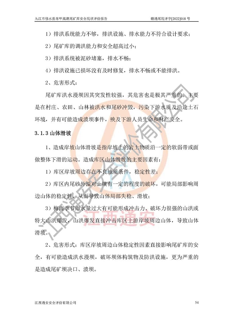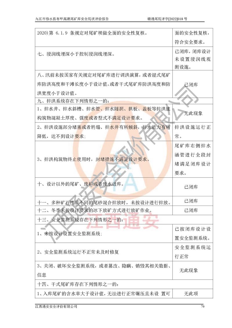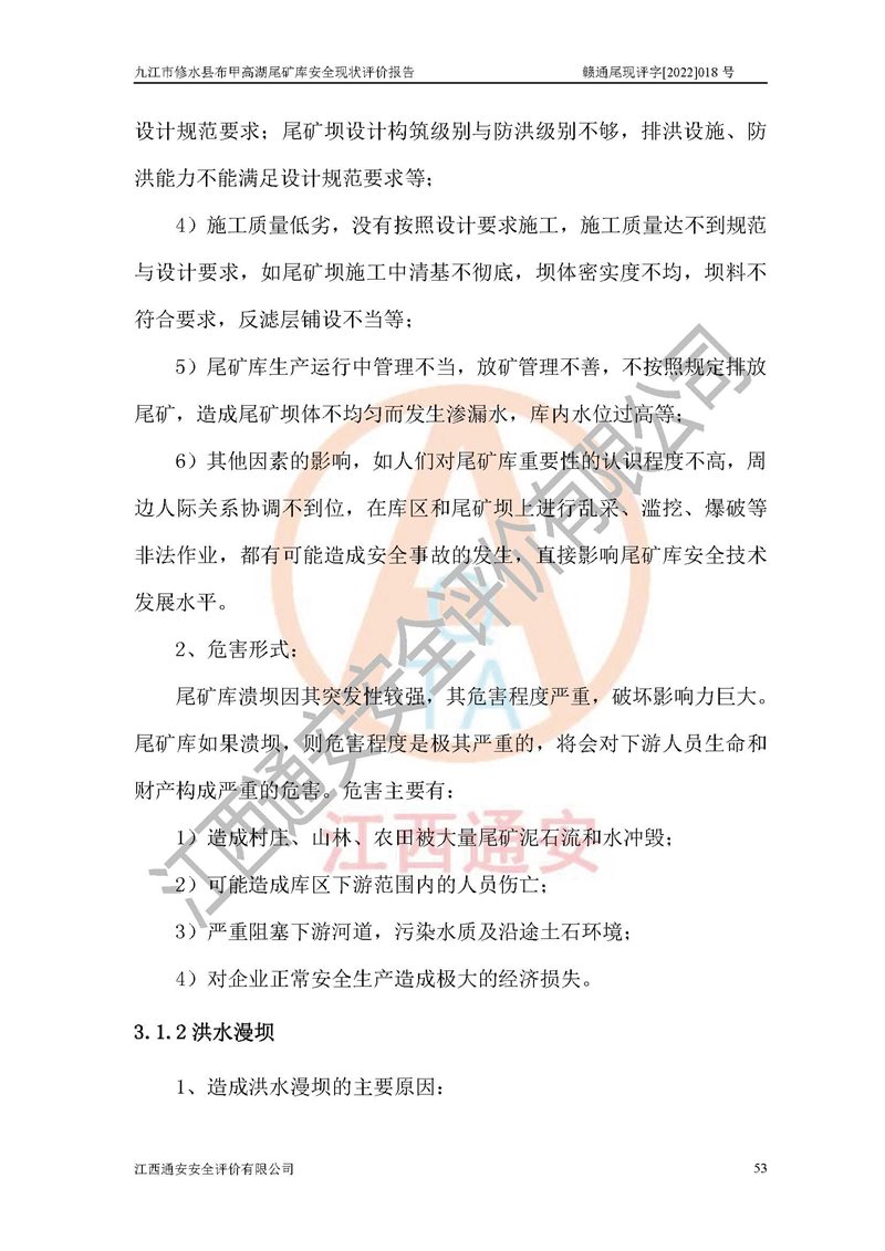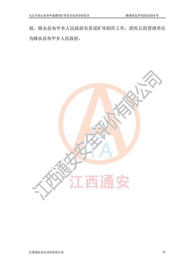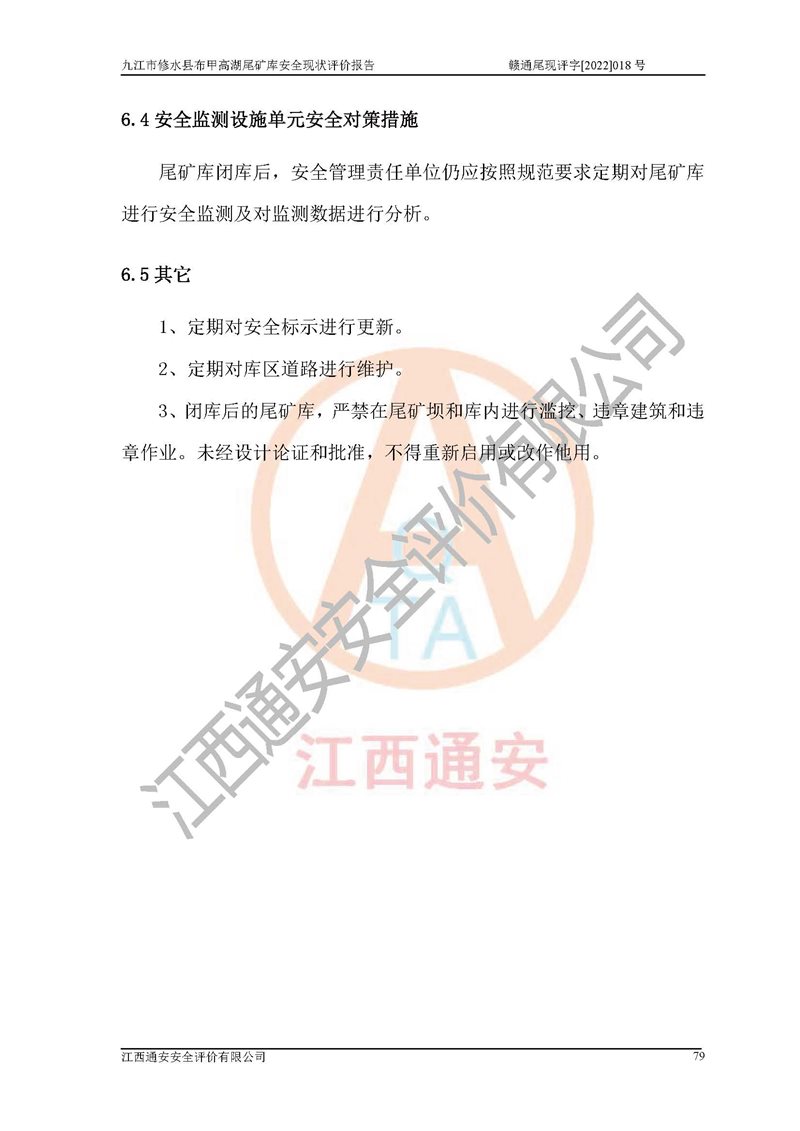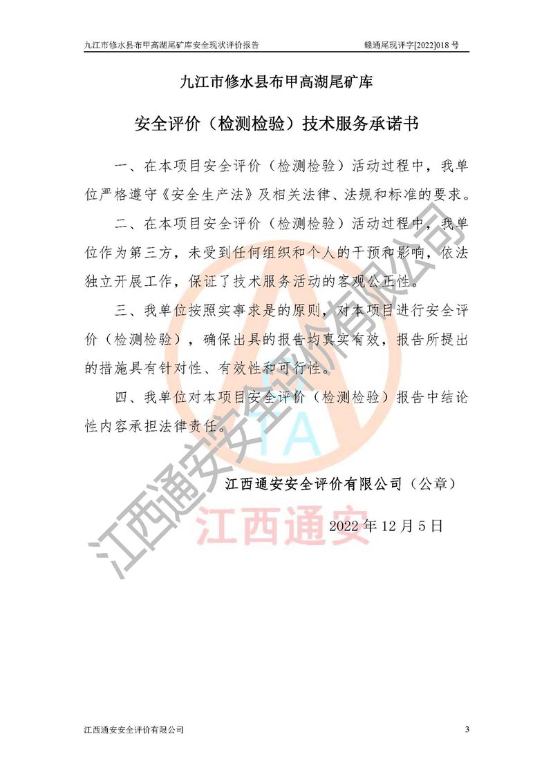 九江市修水县布甲高湖尾矿库位于修水县布甲乡布甲村高湖片区,属修河支流,地理位置为东经114°24′27″,北纬29°18′23″,坝址以上控制流域面积0.607km2,整个流域范围内山清水秀,植被良好,人类活动影响小,水土流失影响不明显。 高湖尾矿库始建于上世纪80年代,后在90年代及2004年左右扩建。原为民采尾矿库,高湖选厂2004年扩大了尾矿库的范围,原尾矿库库区面积1.6×104m2,扩建后尾矿库库区面积4.3×104m2(未实施),未经过正规设计、施工,尾矿坝建设不规范,2008年已停用。 2016~2017年虽然应急抢险防汛整治,增设了溢洪道,但建设的各项工作均极为不规范,未能验收。因此尾矿库排洪、坝体安全观测等设施均不健全,存在**的安全风险。 九江市修水县布甲高湖尾矿库从2008年停用至今,已15年。尾矿库不再使用,为尾矿库周边安全与环境的长治久安,根据相关规定尾矿库进行了闭库。 修水县布甲高湖尾矿库无管理单位,按“属地管理”职责原则,修水县布甲乡人民**负责高湖尾矿库闭库后的管理工作。 2021年10月福建省龙岩工程勘察院提交了《九江市修水县布甲高湖尾矿库项目工程(水文)地质勘察报告》,2022年3月金建工程设计有限公司提交了《九江市修水县布甲高湖尾矿库闭库工程初步设计》。 该尾矿库闭库工程由浙江安禹建筑有限公司进行(水利水电施工总承包贰级资质)施工,江西同济建设项目管理股份有限公司进行监理(工程监理综合资质),该闭库工程于2022年4月28日开工,2022年6月10日竣工。 |