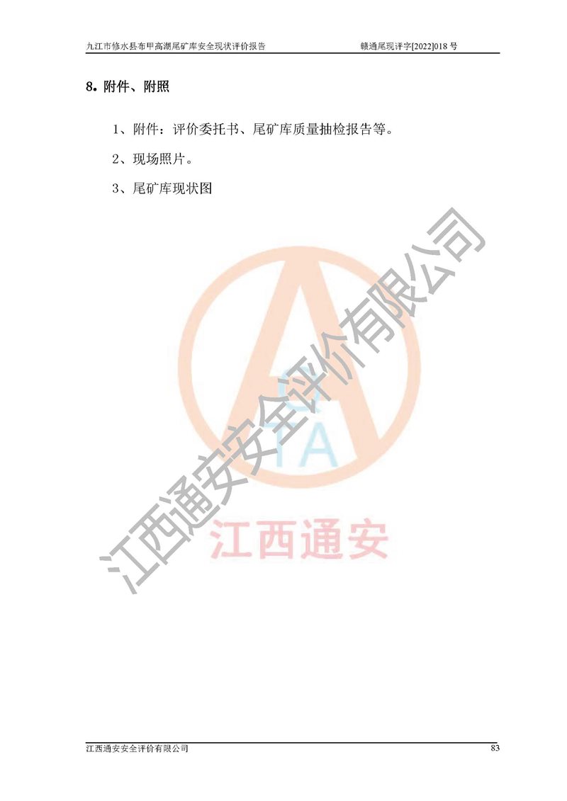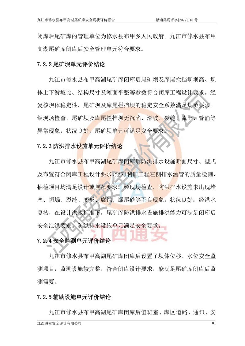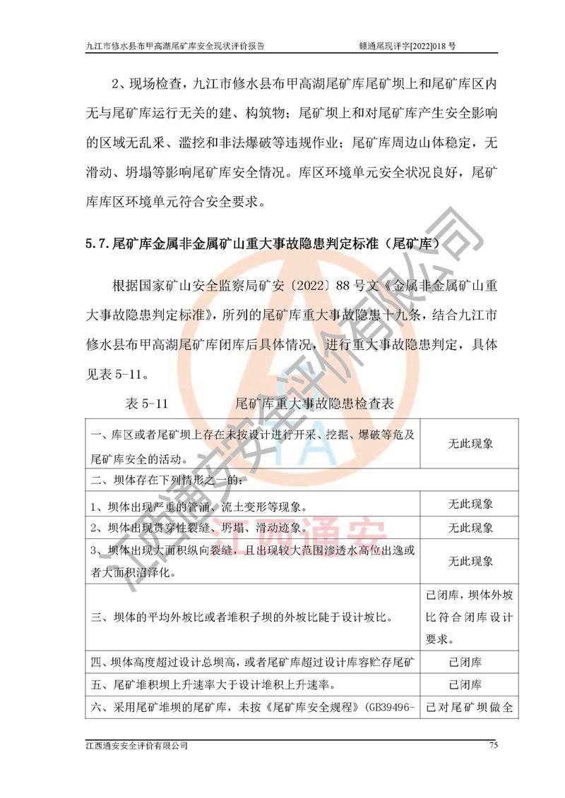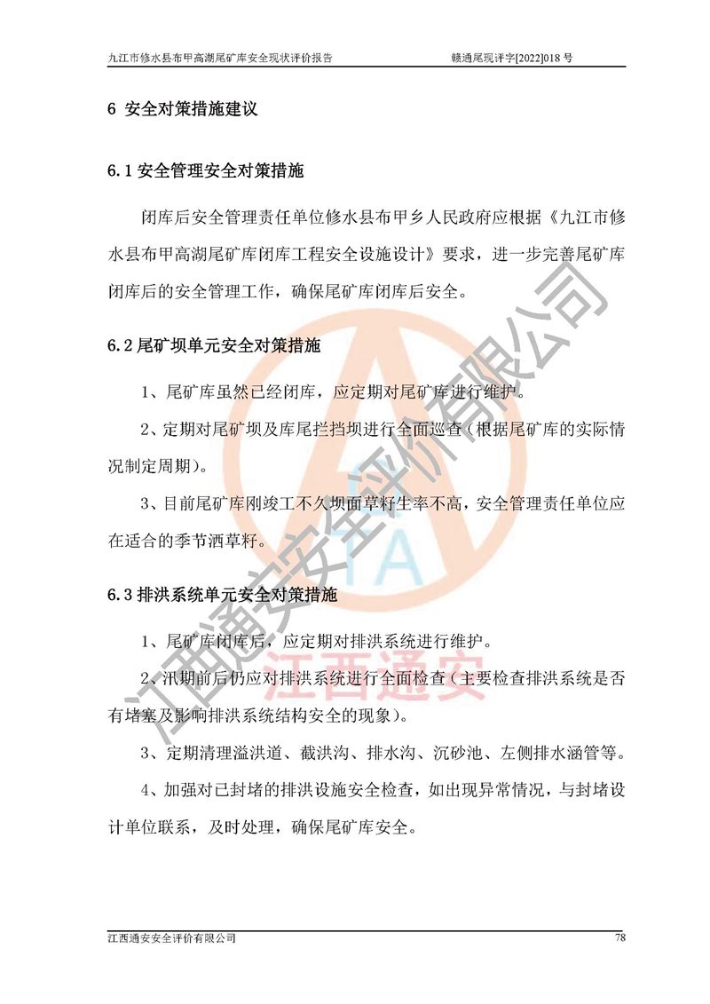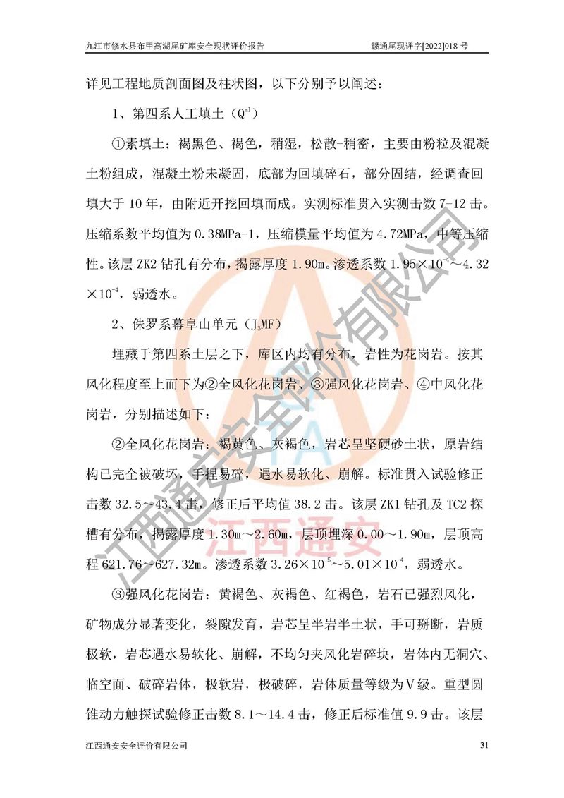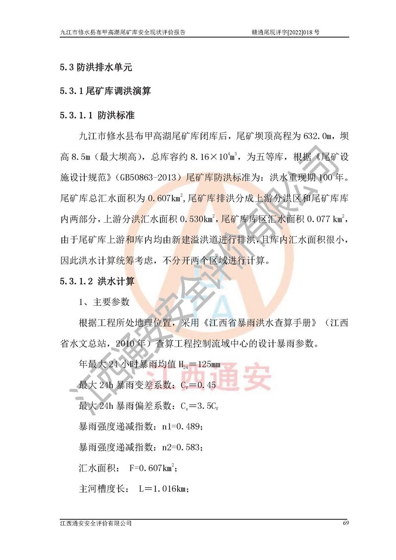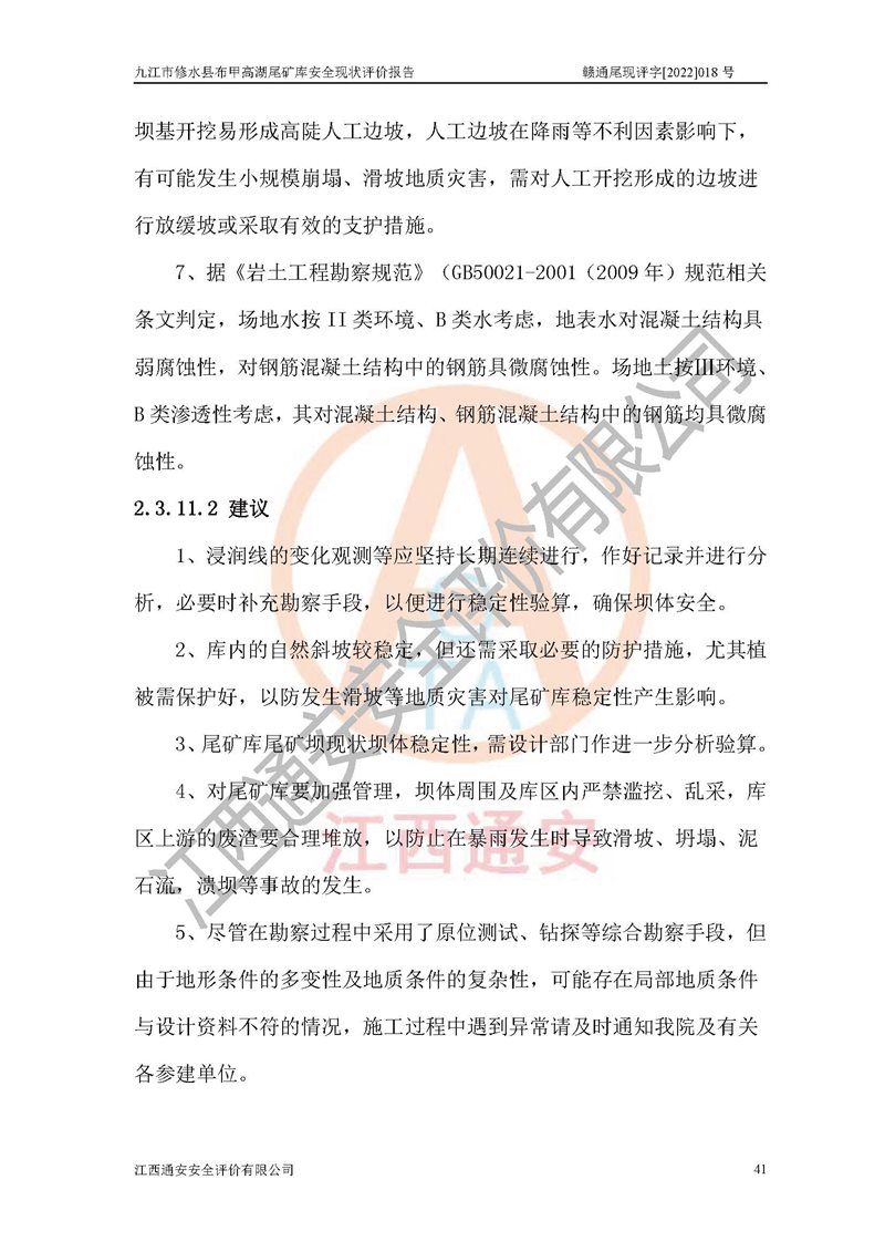 九江市修水县布甲高湖尾矿库位于修水县布甲乡布甲村高湖片区,属修河支流,地理位置为东经114°24′27″,北纬29°18′23″,坝址以上控制流域面积0.607km2,整个流域范围内山清水秀,植被良好,人类活动影响小,水土流失影响不明显。 高湖尾矿库始建于上世纪80年代,后在90年代及2004年左右扩建。原为民采尾矿库,高湖选厂2004年扩大了尾矿库的范围,原尾矿库库区面积1.6×104m2,扩建后尾矿库库区面积4.3×104m2(未实施),未经过正规设计、施工,尾矿坝建设不规范,2008年已停用。 2016~2017年虽然应急抢险防汛整治,增设了溢洪道,但建设的各项工作均极为不规范,未能验收。因此尾矿库排洪、坝体安全观测等设施均不健全,存在**的安全风险。 九江市修水县布甲高湖尾矿库从2008年停用至今,已15年。尾矿库不再使用,为尾矿库周边安全与环境的长治久安,根据相关规定尾矿库进行了闭库。 修水县布甲高湖尾矿库无管理单位,按“属地管理”职责原则,修水县布甲乡人民**负责高湖尾矿库闭库后的管理工作。 2021年10月福建省龙岩工程勘察院提交了《九江市修水县布甲高湖尾矿库项目工程(水文)地质勘察报告》,2022年3月金建工程设计有限公司提交了《九江市修水县布甲高湖尾矿库闭库工程初步设计》。 该尾矿库闭库工程由浙江安禹建筑有限公司进行(水利水电施工总承包贰级资质)施工,江西同济建设项目管理股份有限公司进行监理(工程监理综合资质),该闭库工程于2022年4月28日开工,2022年6月10日竣工。 |