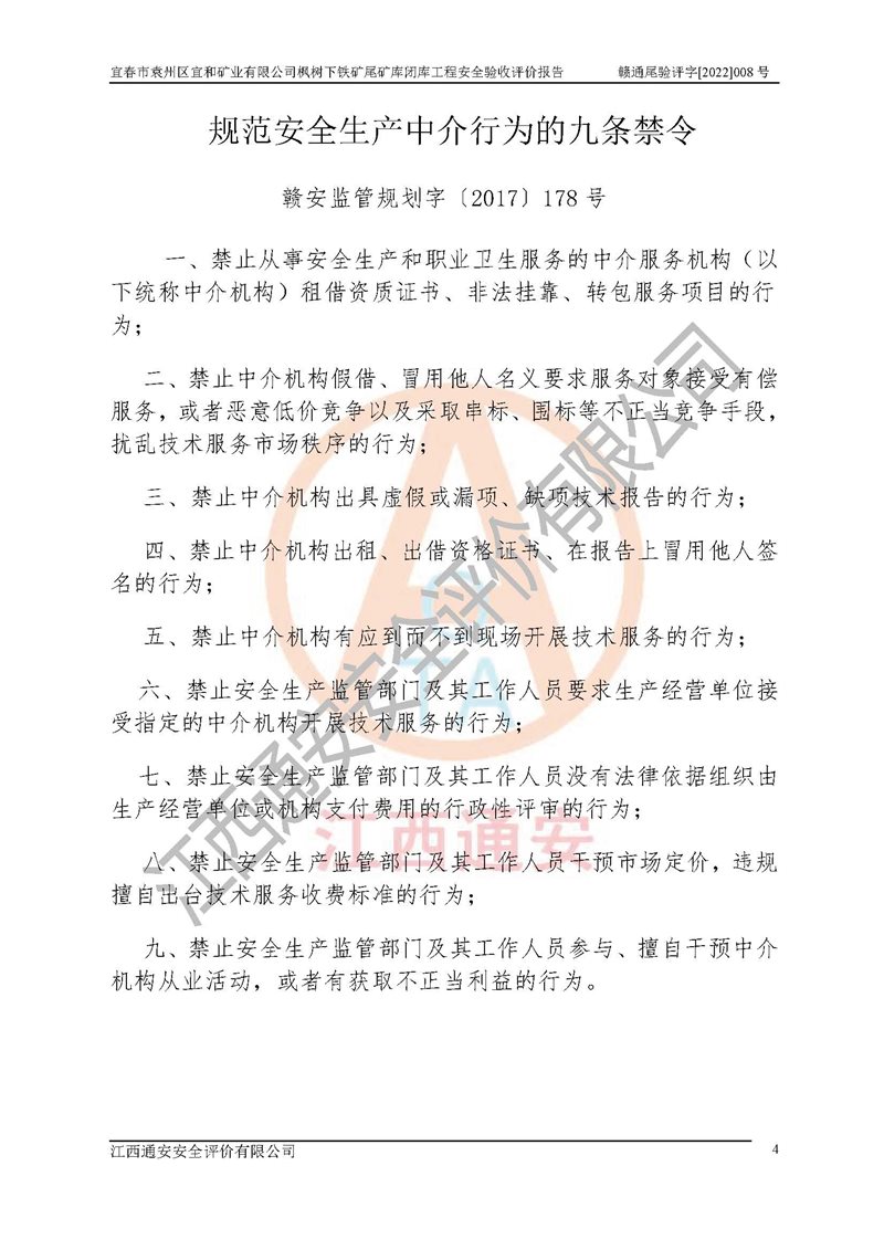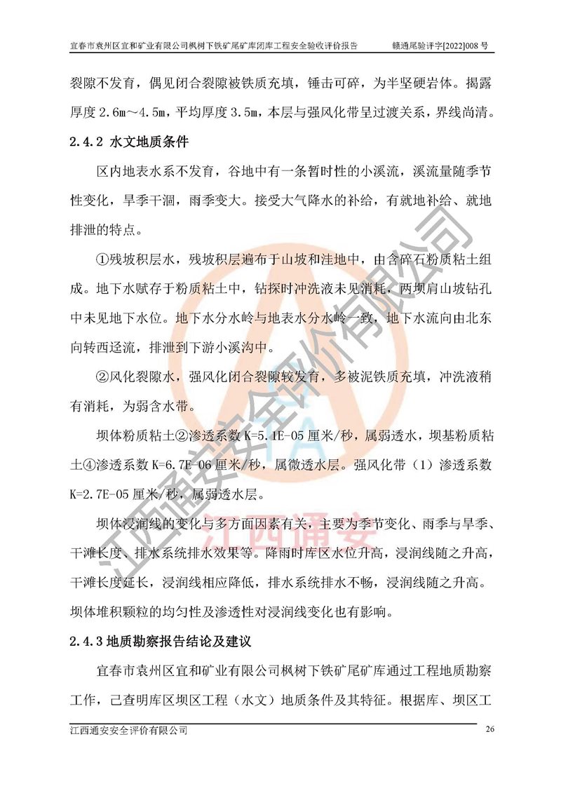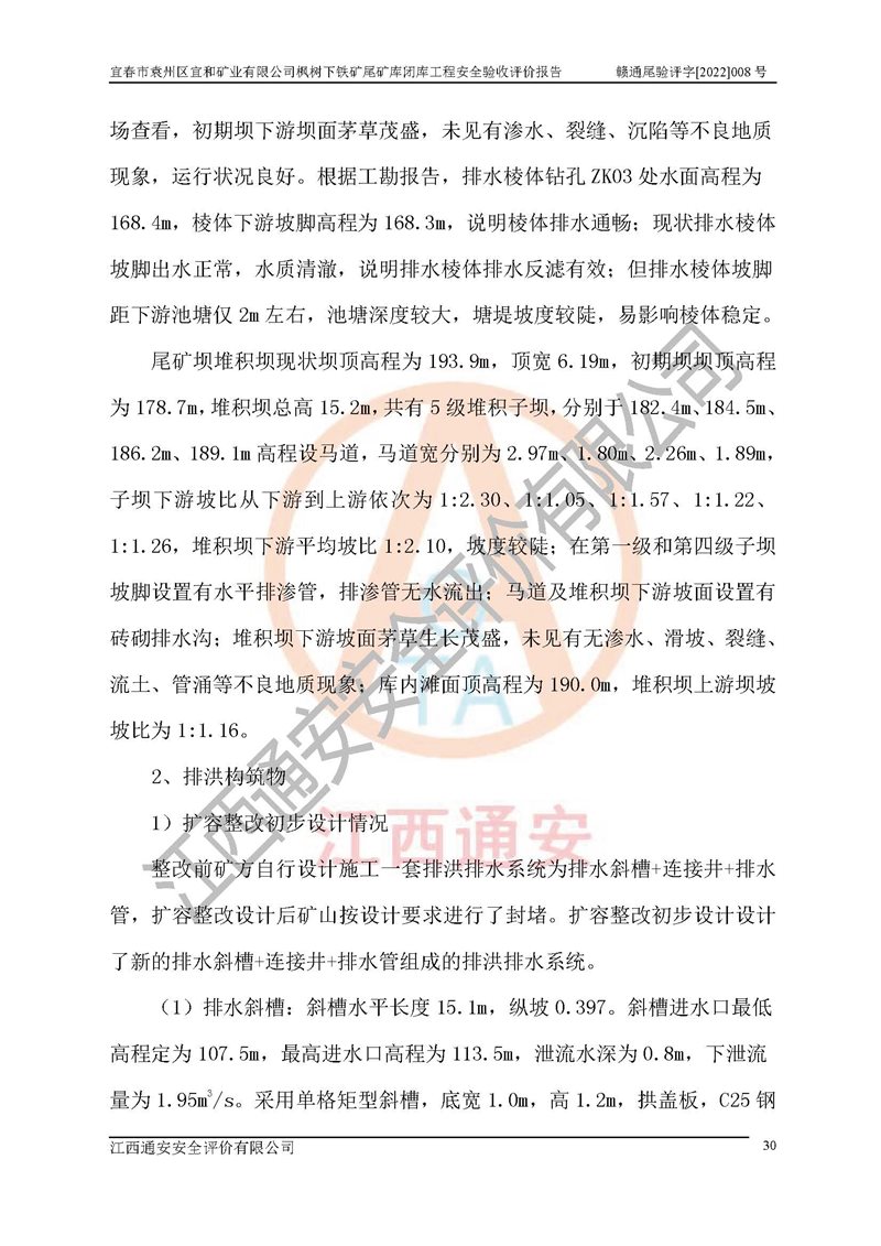 评价结论 | 宜春市袁州区宜和矿业有限公司枫树下铁矿尾矿库闭库工程质量合格,该尾矿库闭库前的主要危险源已**排除,闭库工程符合《宜春市袁州区宜和矿业有限公司枫树下铁矿尾矿库闭库工程初步设计及安全设施设计》和《尾矿库安全监督管理规定》(**安全生产监督管理总局〔2011〕38 号)及《尾矿库安全规程》(GB39496-2020)的规定的要求,具备了尾矿库闭库验收条件。 | |||