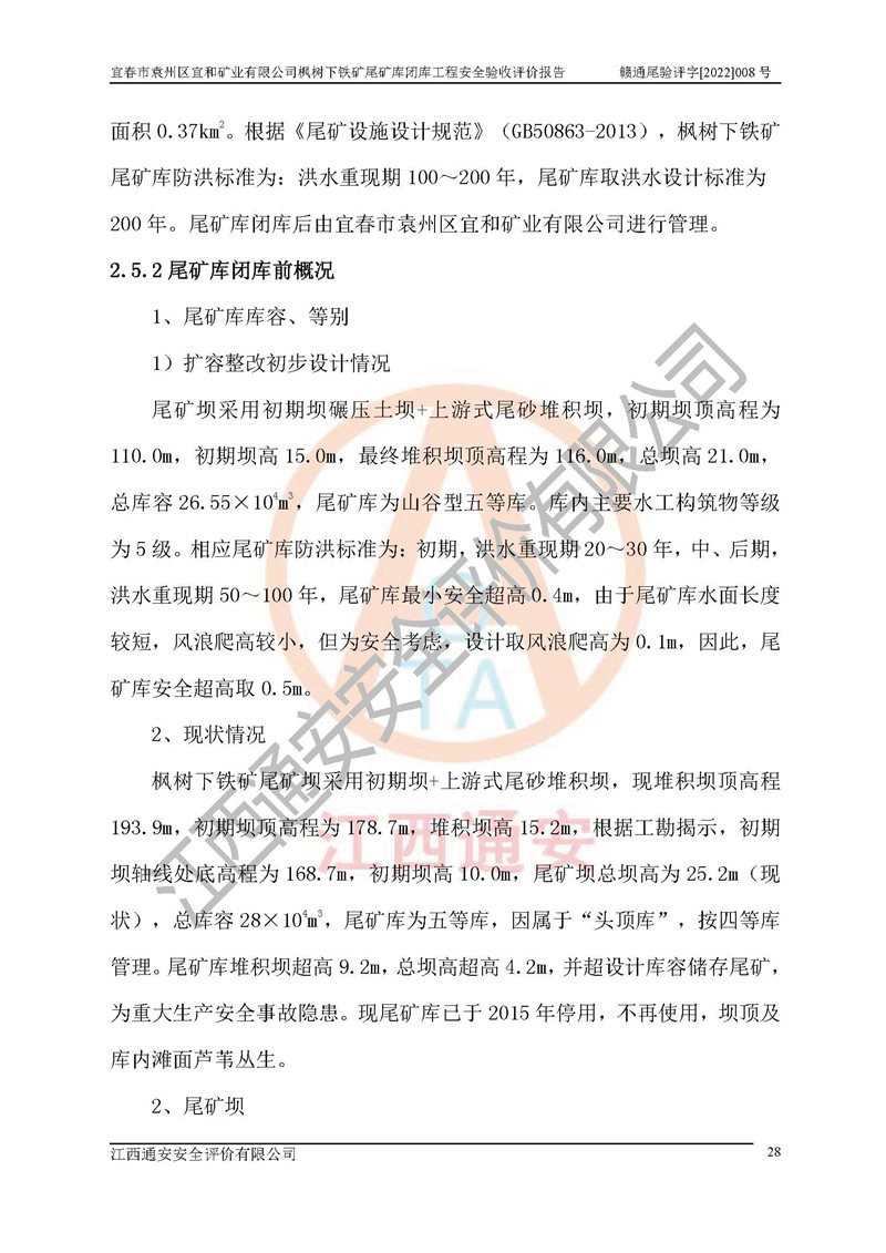 评价报告名称 | 宜春市袁州区宜和矿业有限公司枫树下铁矿尾矿库闭库工程安全验收评价 | |||